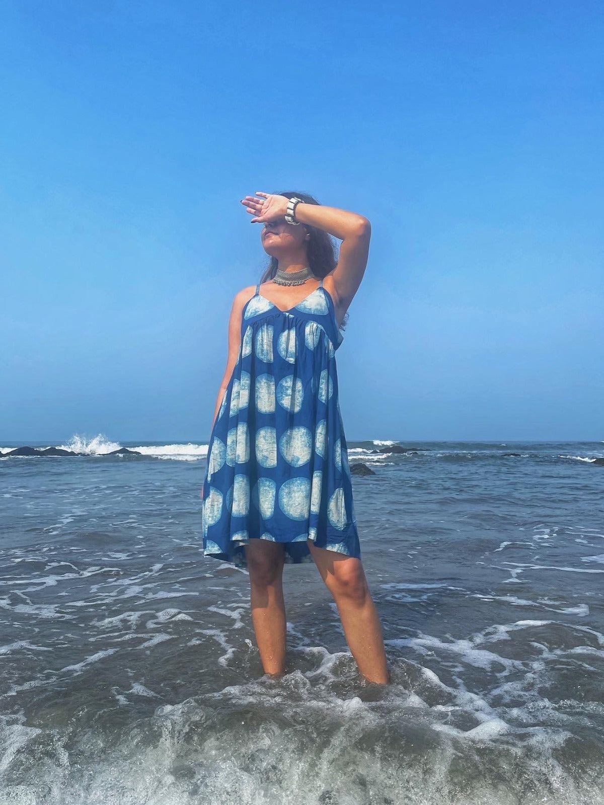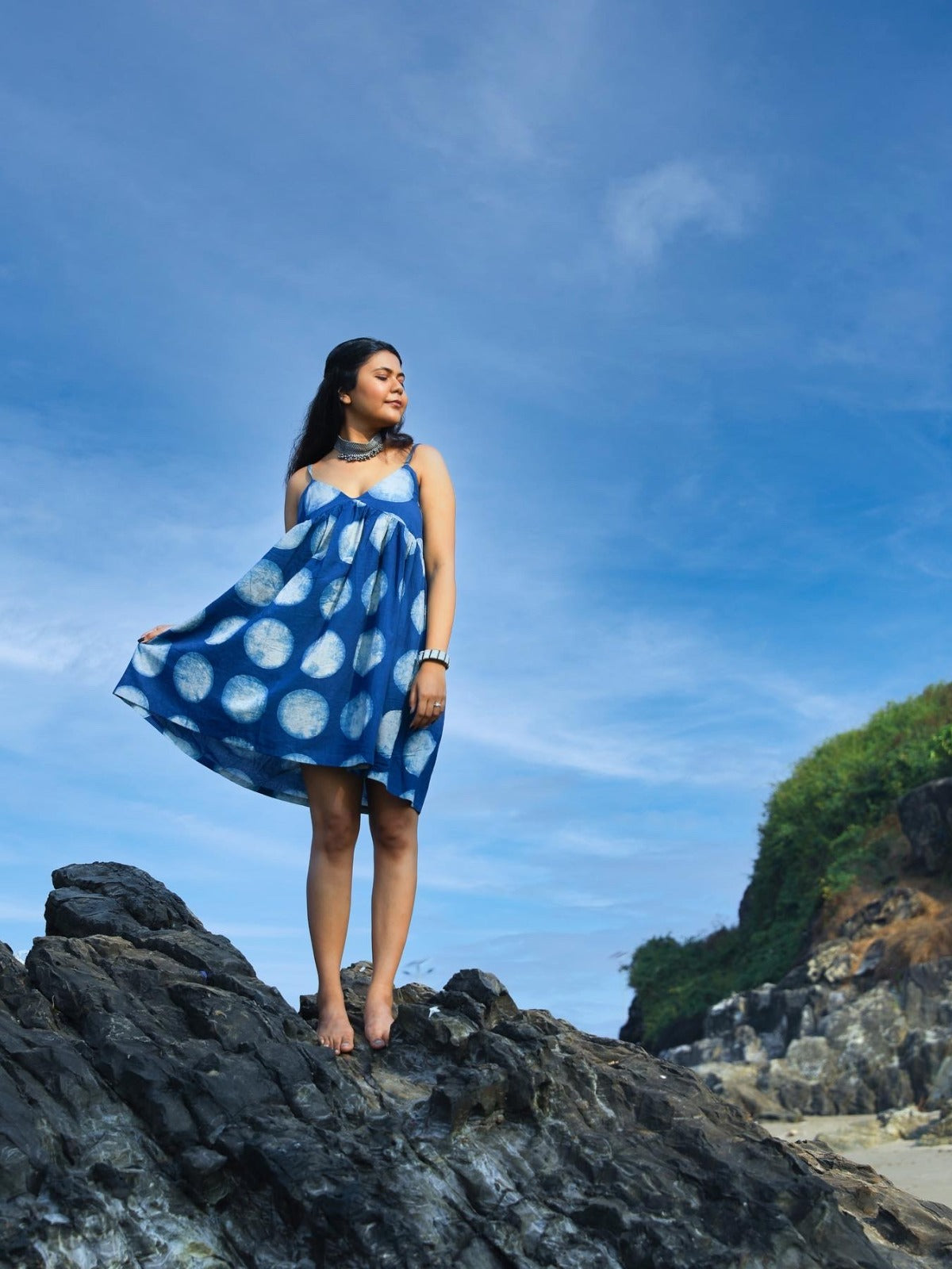 Crafted in 100% cotton indigo Dabu textile, the Chaand dress is a timeless wardrobe staple featuring a free-flowing silhouette and breathable comfort. Effortless and easy to wear, it’s perfect for everyday elegance.