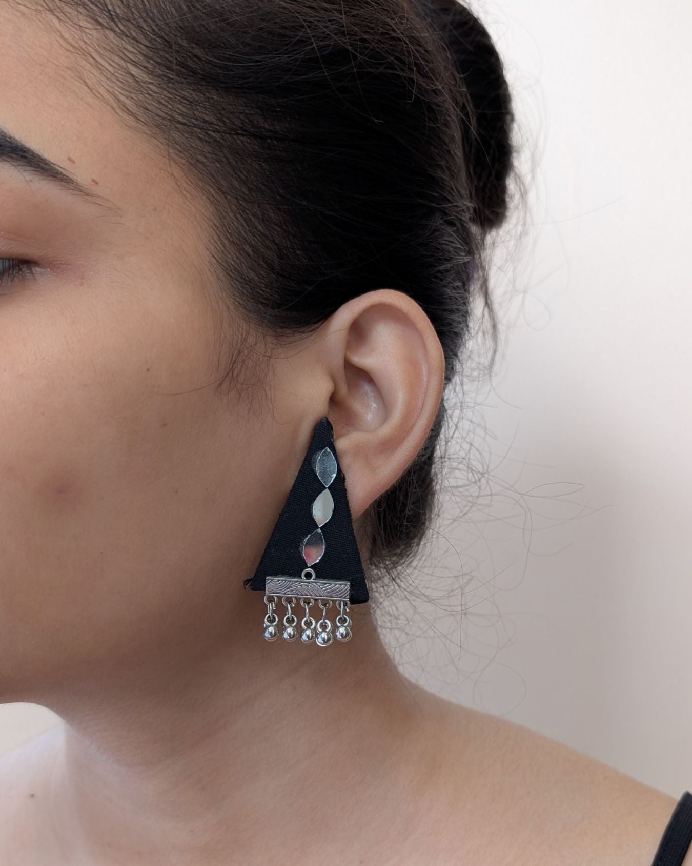 These edgy triangular studs use black fabric, mirror, and metal to create a sharp boho or indo-western look. Handcrafted in Gujarat, they're perfect for ethnic or modern outfits that need a bold accessory touch.