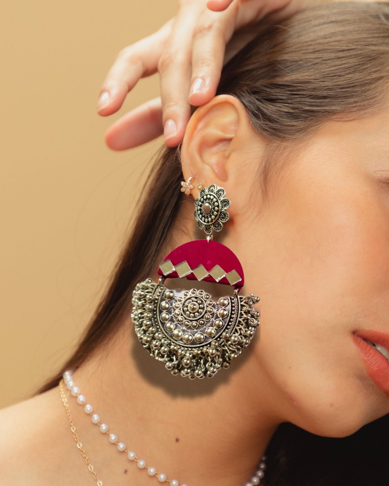 Made with fabric and metal in a semi-round shape, these bold dark pink mirror oxidized jhumkas stand out with their vibrant hue and intricate detailing. Perfect for evening wear or weddings, they add festive glam to your look.