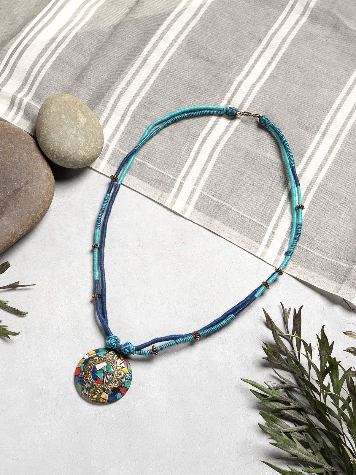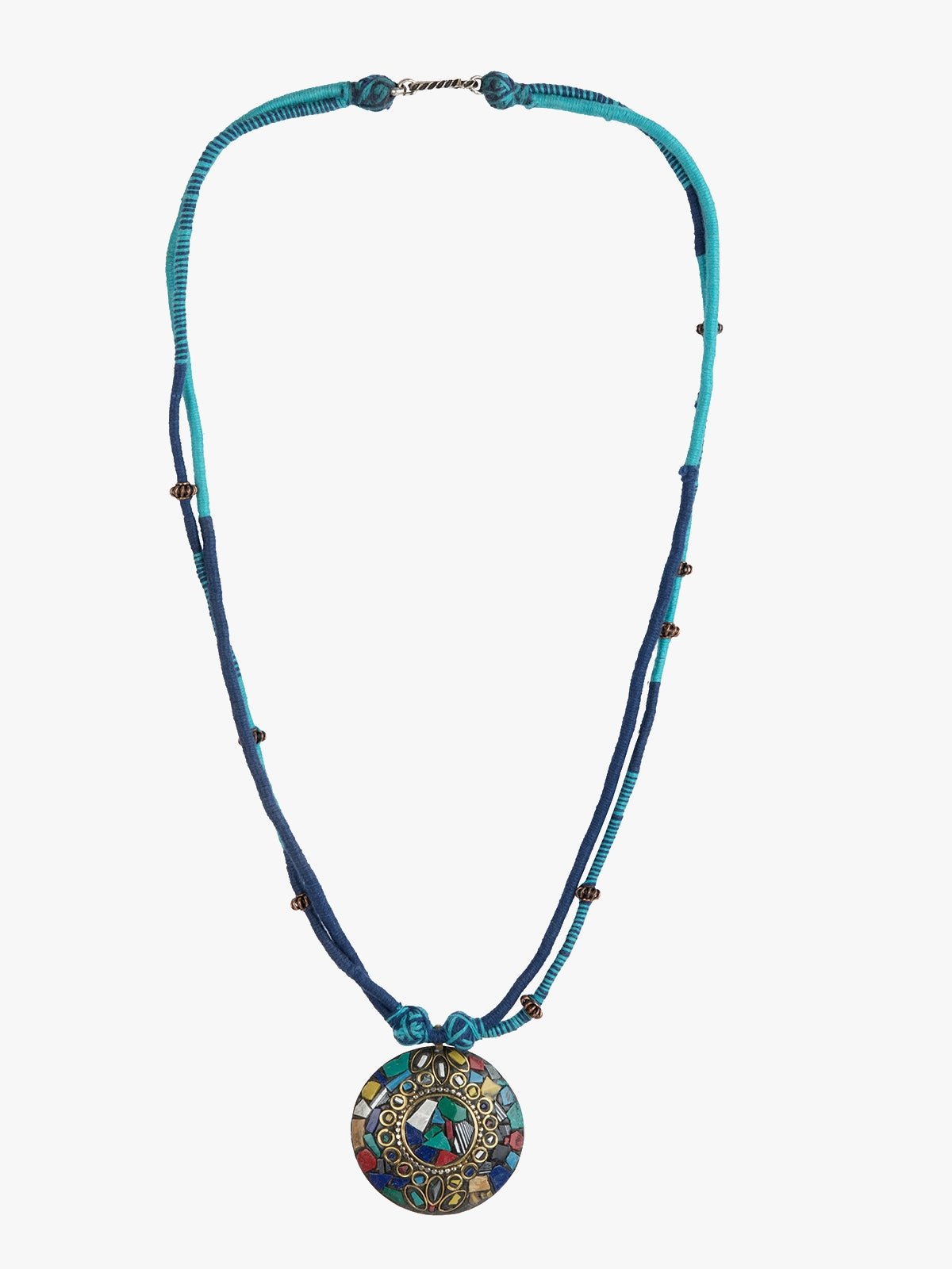 A vibrant fusion of tradition and color, this dual-tone blue Patwa thread necklace is adorned with metallic beads and features a round mosaic-style pendant with colorful stonework and intricate detailing. Handcrafted by skilled artisans, it is a striking statement piece for adding a pop of ethnic charm to any look.