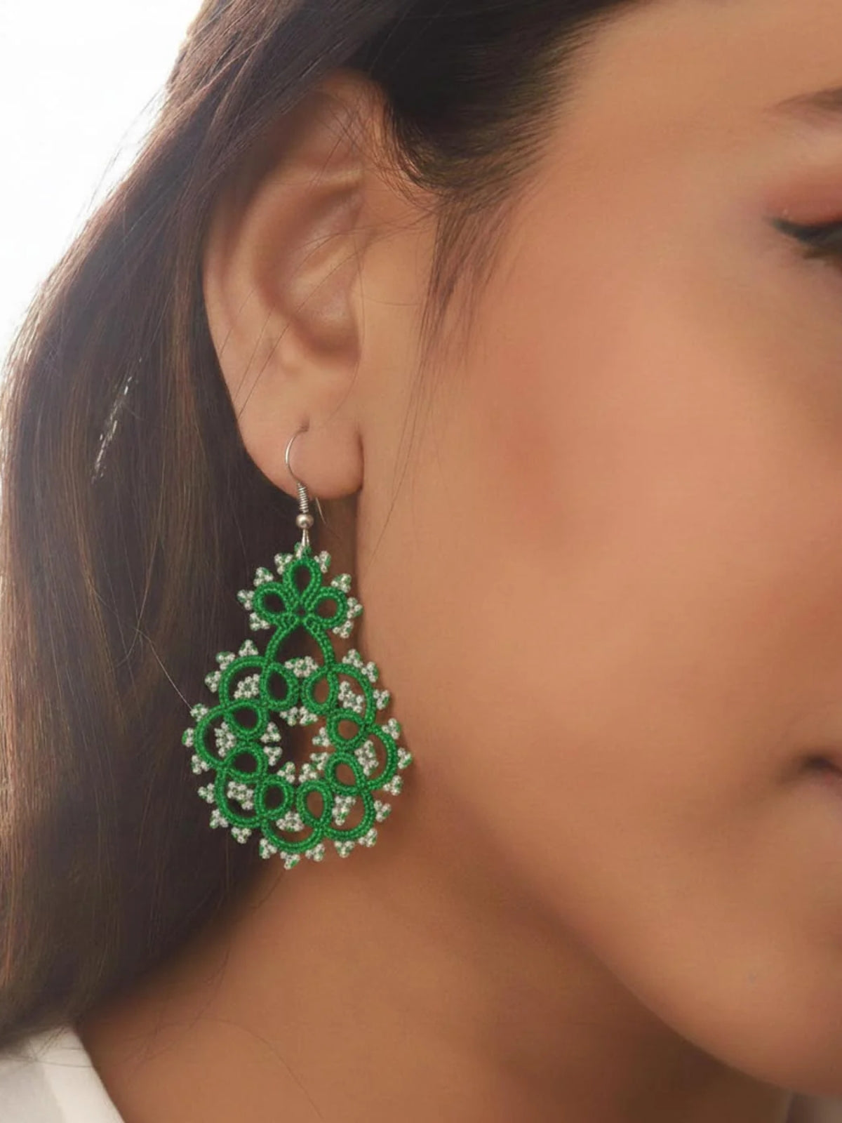 Beautifully crafted with cotton thread and beads using the age-old technique of tatting, these earrings feature intricate lacework created knot by knot through shuttle tatting. Handmade with great care, each pair is exclusively crafted using this traditional method. These super-cool, extremely lightweight earrings are versatile enough to complement any attire, ensuring all-day comfort and effortless style. As artisanal pieces made and decorated entirely by hand, small imperfections highlight the authenticity and charm of each product. Add a touch of handcrafted elegance to your ensemble and celebrate timeless artistry!