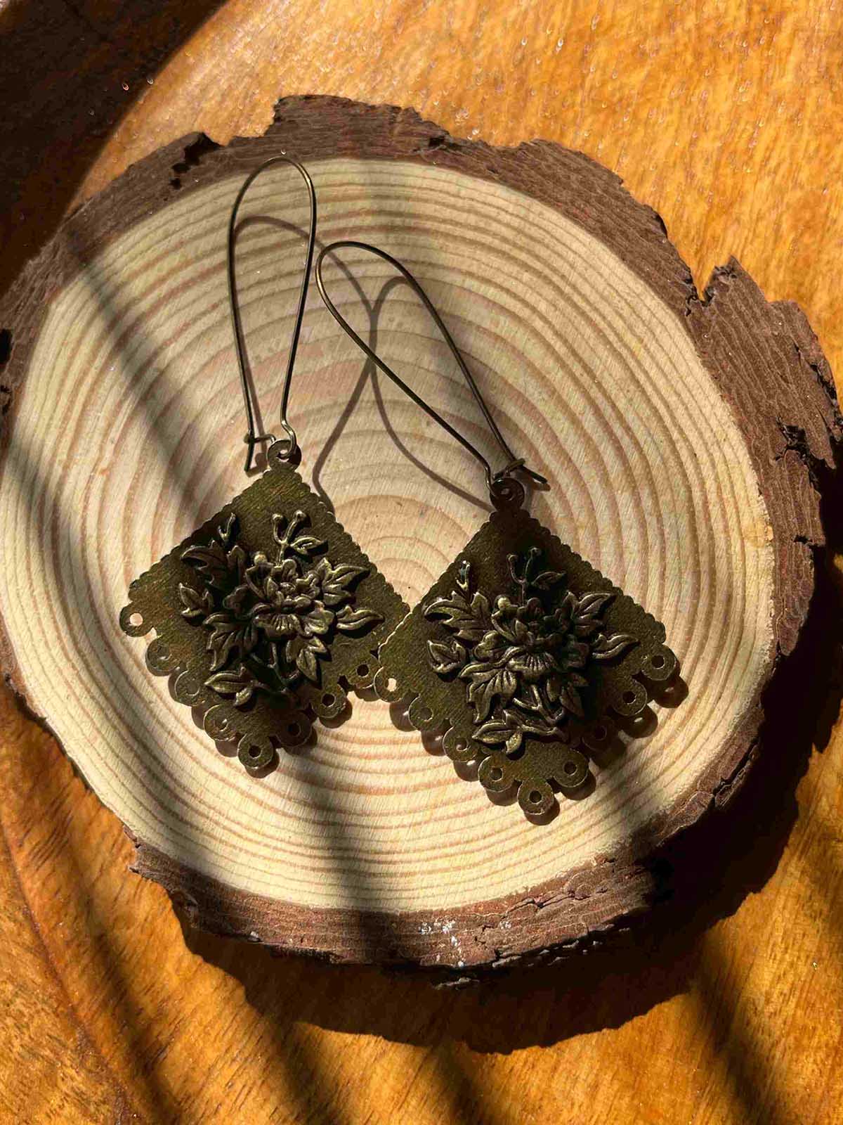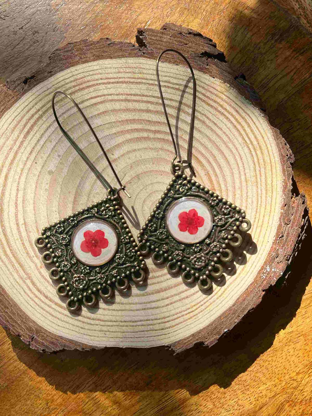 Unique double-sided earrings featuring real dried plum blossom flowers in a vintage-style setting. Just flip to switch your look and slay effortlessly. These 2.4-inch danglers blend floral elegance with a clever twist of versatility.