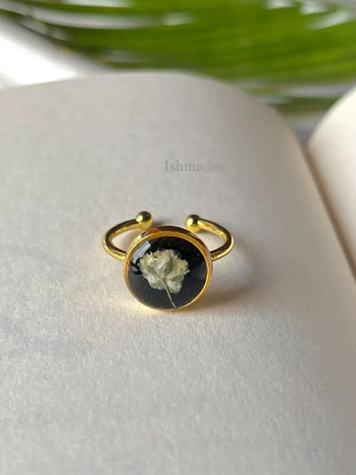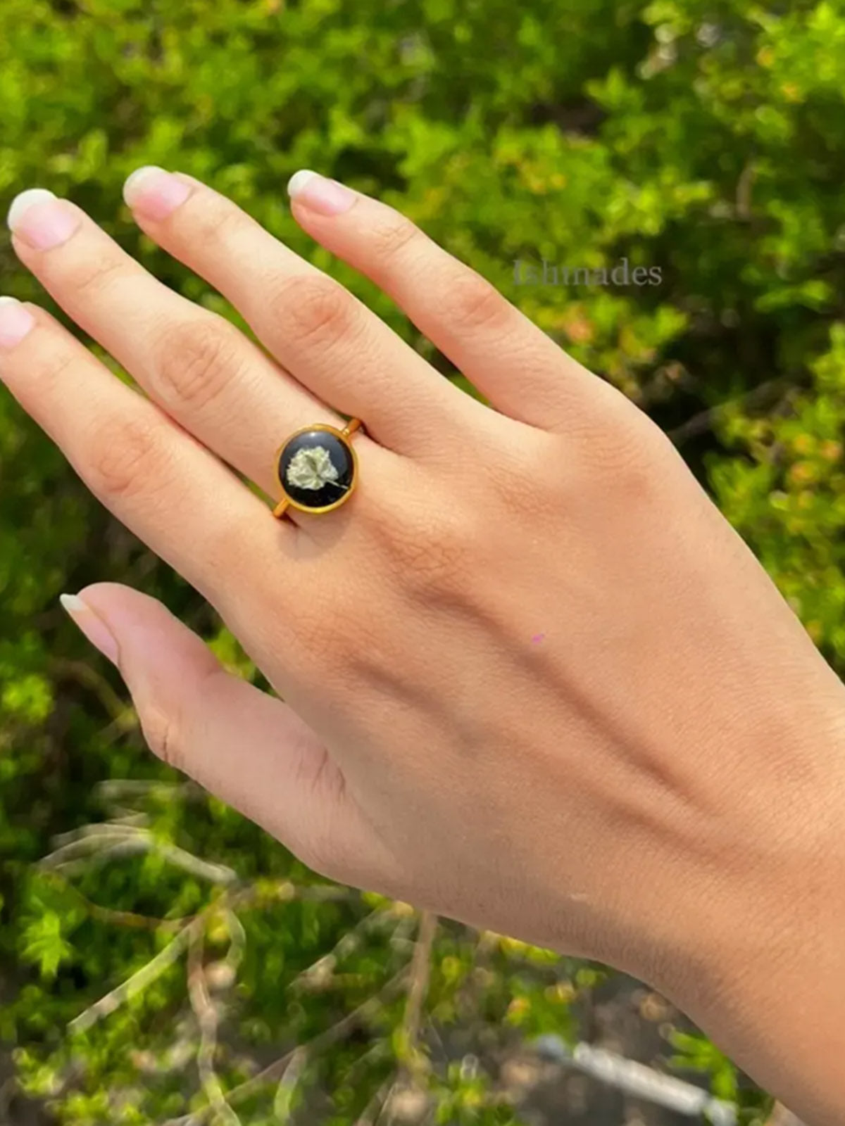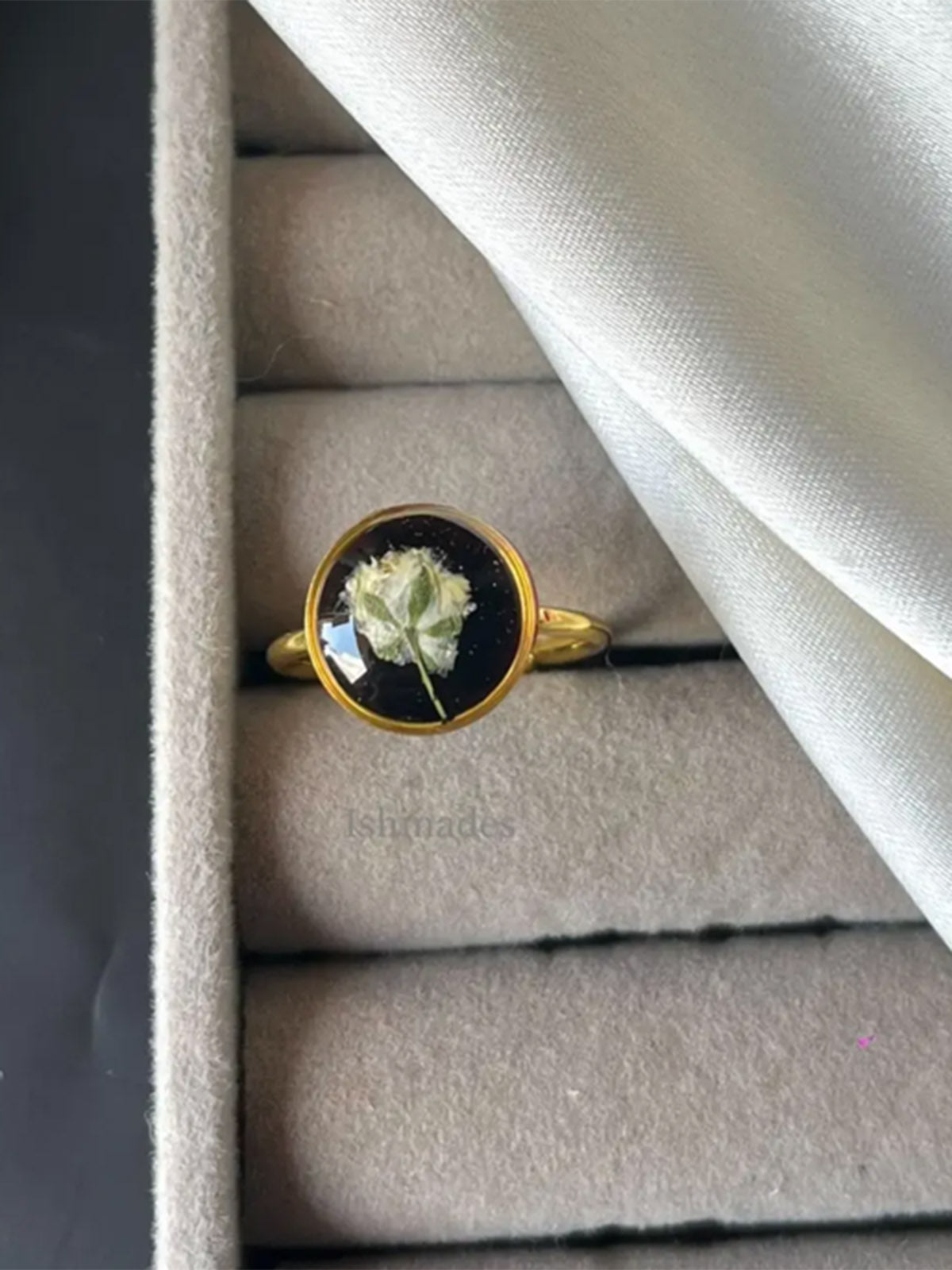Discover the enchanting "Gypsophila Ring": a golden treasure featuring a delicate white baby's breath flower set against a bold black base. Symbolizing purity and innocence, each petal embodies timeless beauty and grace. Crafted from anti-tarnish stainless steel, this adjustable ring ensures a comfortable fit with a base diameter of 10 mm, making it versatile for any finger size. Embrace its understated elegance for both casual outings and formal affairs, as it effortlessly complements any wardrobe with its sophisticated allure. Whether worn alone as a statement piece or layered with other favorites, the Gypsophila Ring radiates charm and sophistication. Perfect for those who cherish meaningful accessories, it serves as a reminder of nature's delicate beauty and enduring style. Treat yourself or a loved one to this exquisite piece, a symbol of everlasting grace and refined taste.