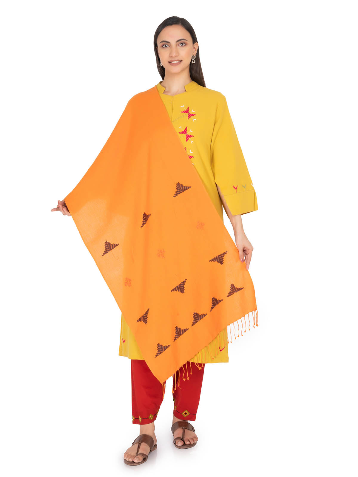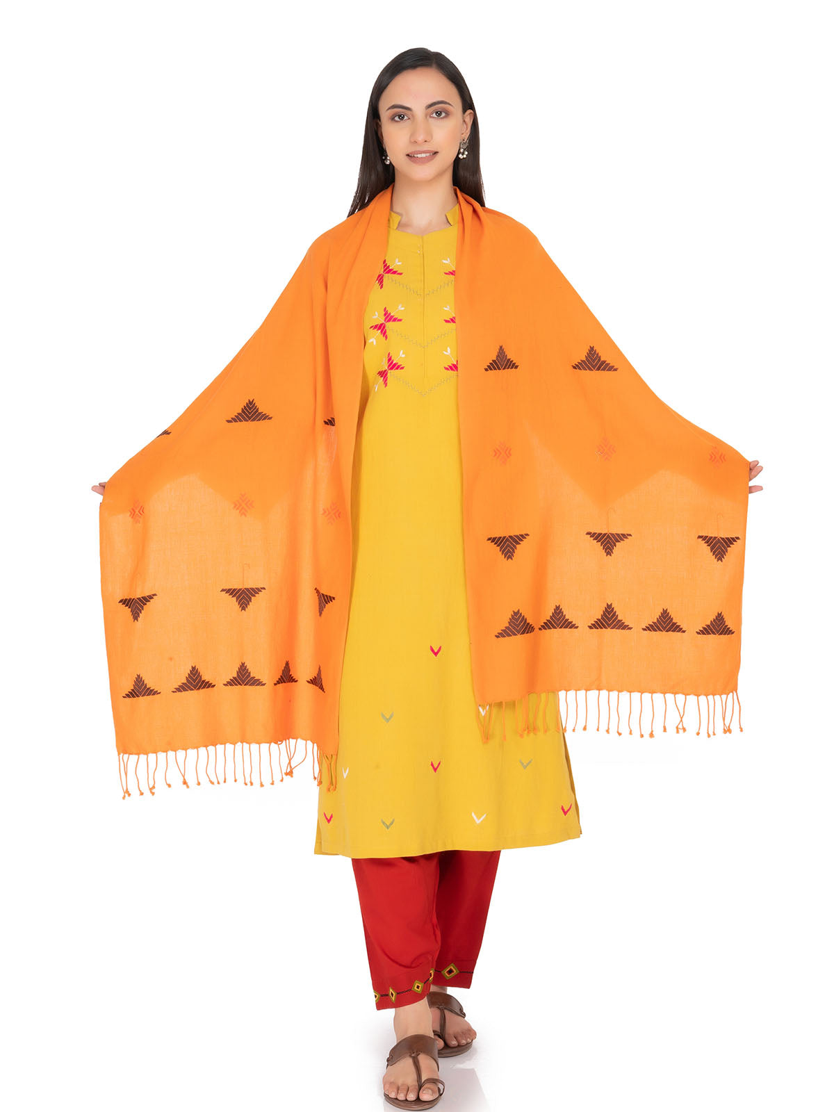 Elevate your ensemble with our exquisite orange cotton stole, adorned with a striking geometric pattern and delicate embroidery. This versatile accessory not only adds a vibrant pop of color to any outfit but also offers the softness and breathability of high-quality cotton, ensuring comfort throughout the day. Perfect for layering or as a standalone statement piece, this stole is an essential addition to your wardrobe that effortlessly combines style and sophistication.