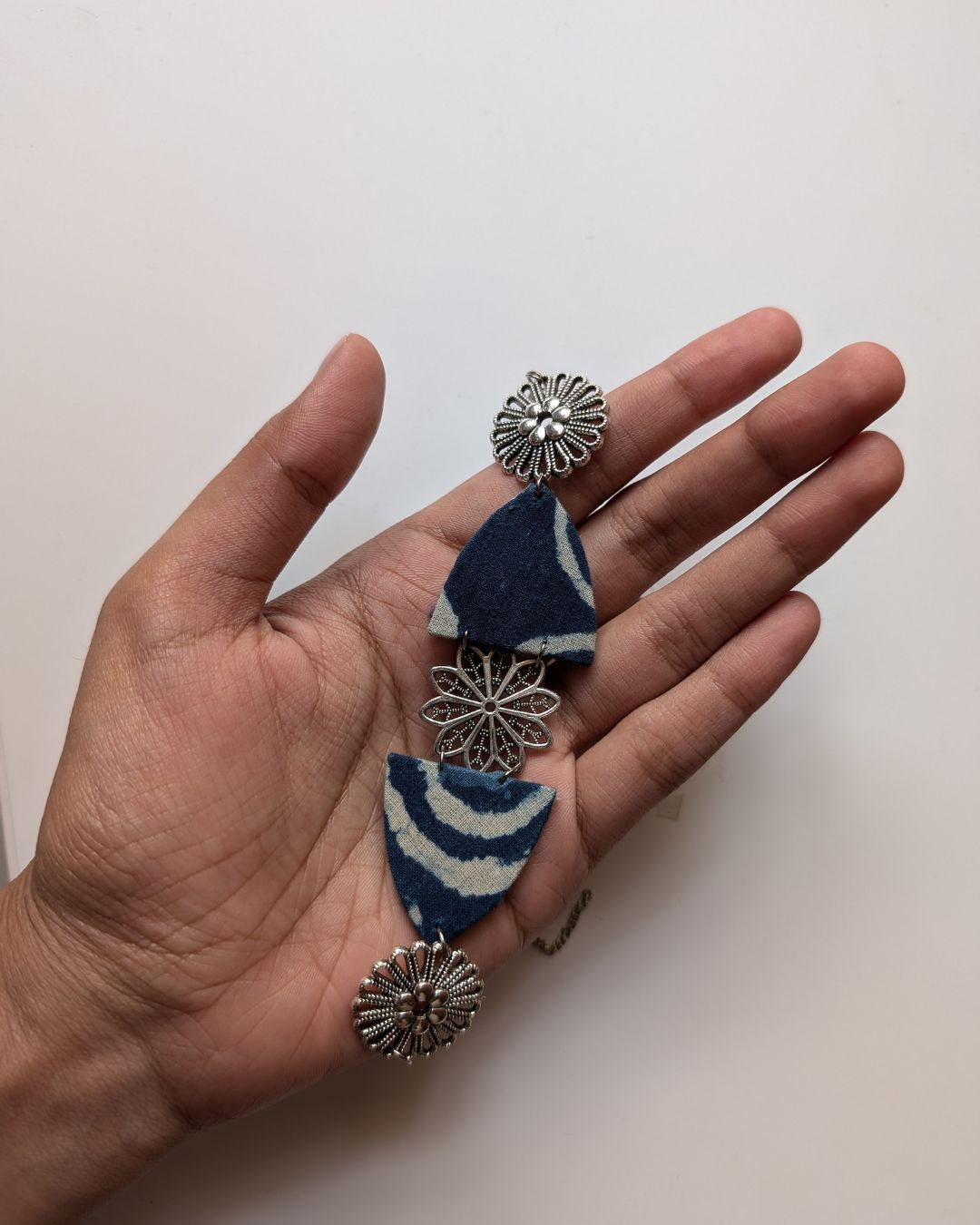 This indigo print silver choker brings a fresh, contemporary touch to traditional attire. Its triangular shape and blend of fabric and metal offer a stylish edge, making it a go-to for festive events, wedding functions, or even everyday glam. With its artistic design, this piece effortlessly enhances any outfit while keeping things elegant and fun.