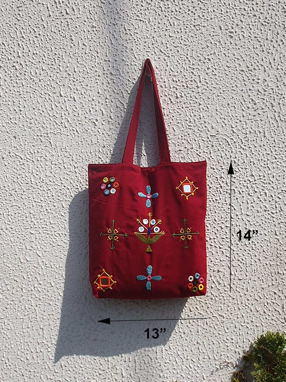 This Maroon cotton tote bag features bold and colorful hand-embroidered geometric and floral motifs inspired by traditional kutch embroidery. With vibrant threadwork in pink, yellow, green, red, and black, it adds a pop of personality to everyday carry.