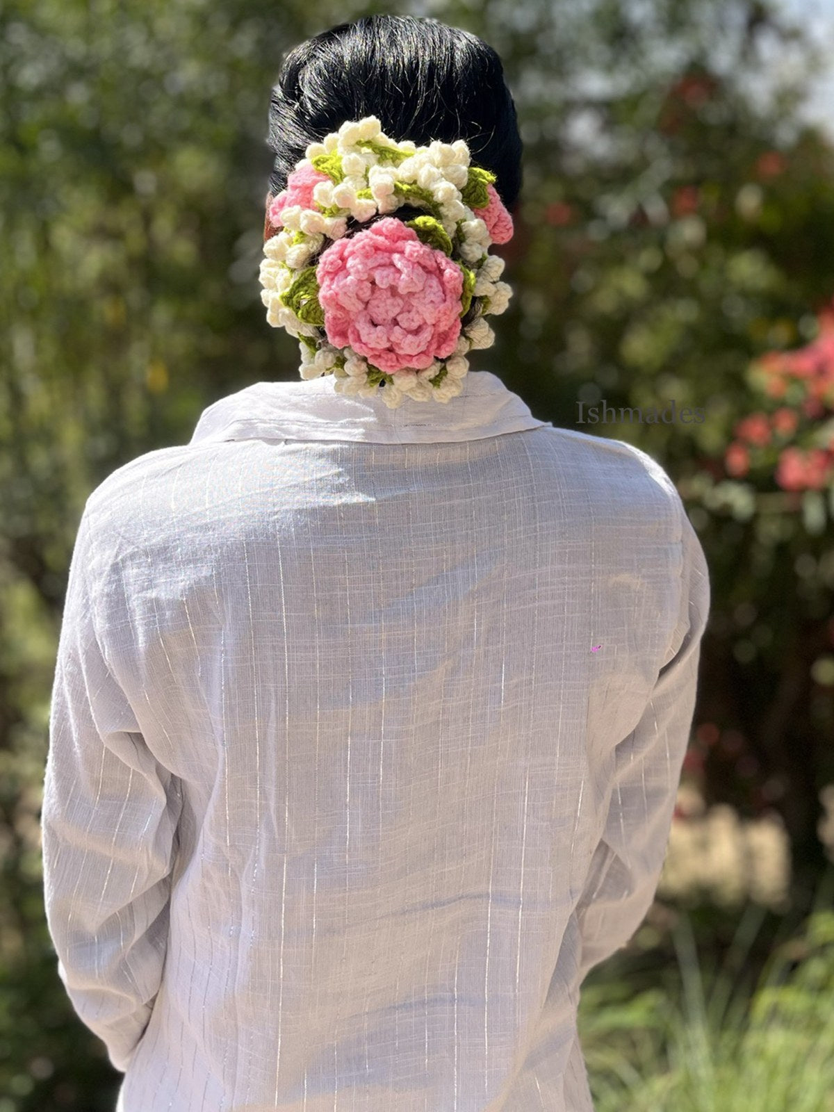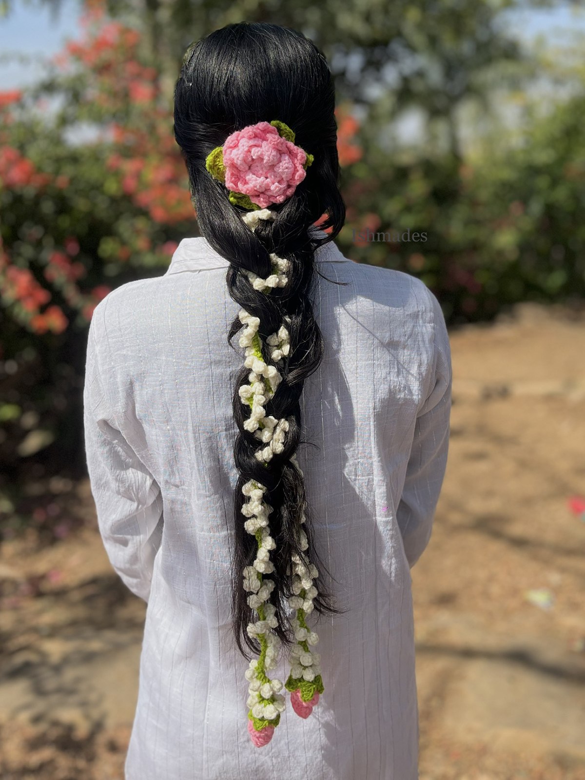 Elevate your hairstyle with our exquisite handmade crochet gajra, a perfect blend of tradition and contemporary craftsmanship. Designed with delicate crochet flowers in soft white and a statement pink bloom, this gajra mimics the beauty of fresh jasmine while offering lasting charm. Features: Handmade with high-quality crochet thread Long-lasting & reusable – no wilting like real flowers Lightweight and comfortable for all-day wear Perfect for festive occasions, weddings, or everyday elegance Whether you're adorning a braid, bun, or half-tied hairstyle, this gajra adds a graceful, ethereal touch to your look. A must-have for lovers of timeless beauty! ✨ Looking for a unique gift? This crochet gajra makes a thoughtful present for bridesmaids, wedding guests, and loved ones. It’s a charming wedding favor, symbolizing grace and tradition while serving as a keepsake of special moments. Ideal for weddings, festive occasions, housewarming gifts, and bridal showers, this handcrafted gajra is a timeless treasure that every woman will cherish! ✨