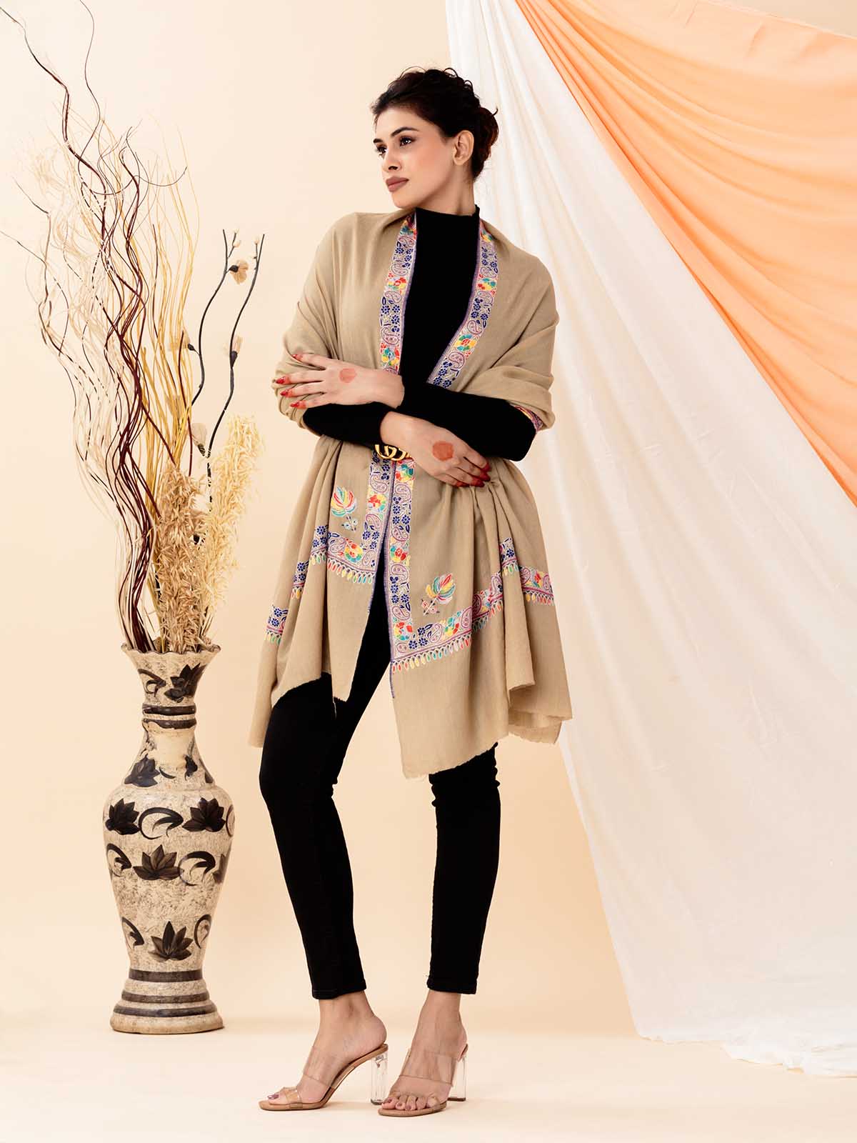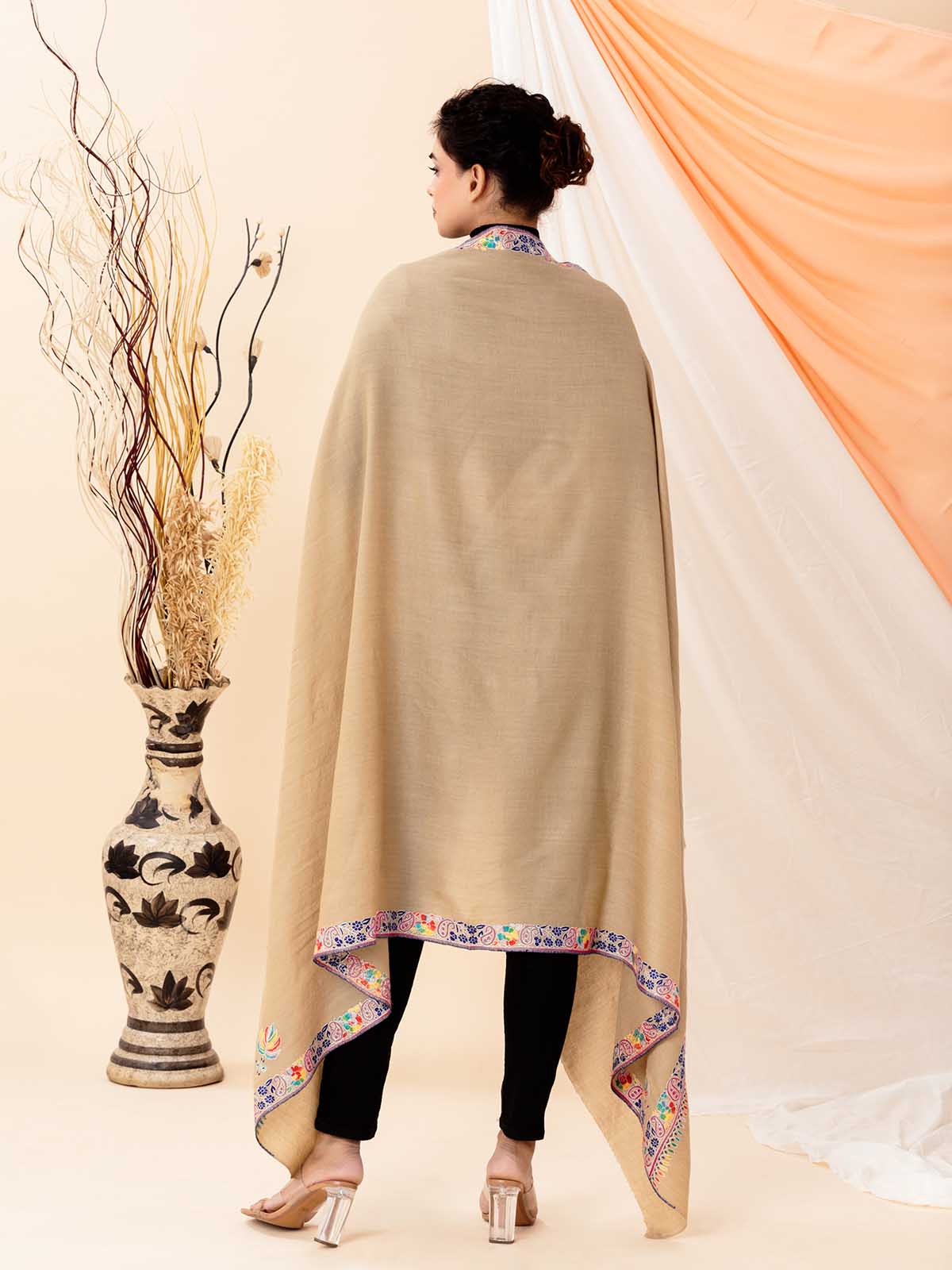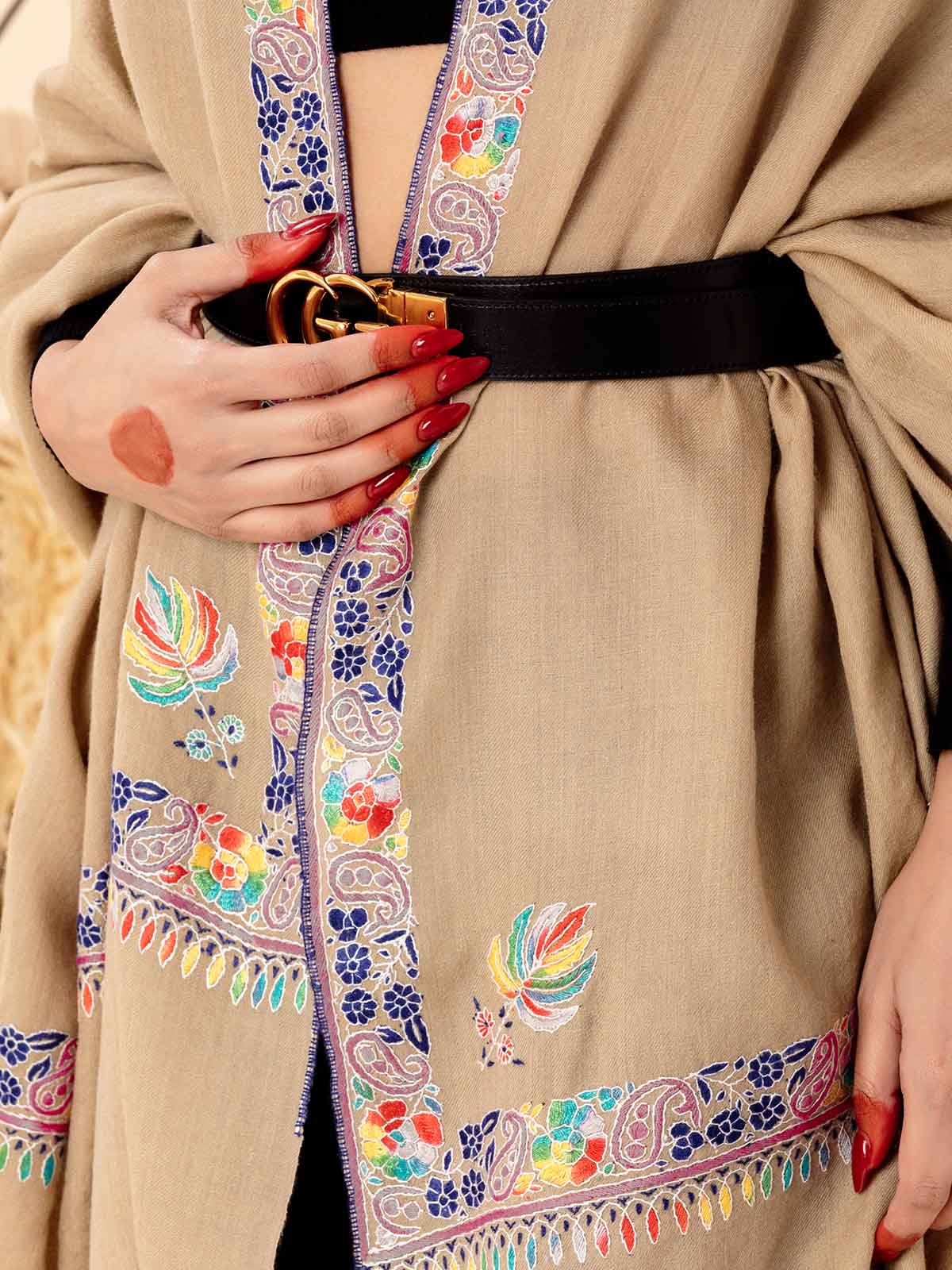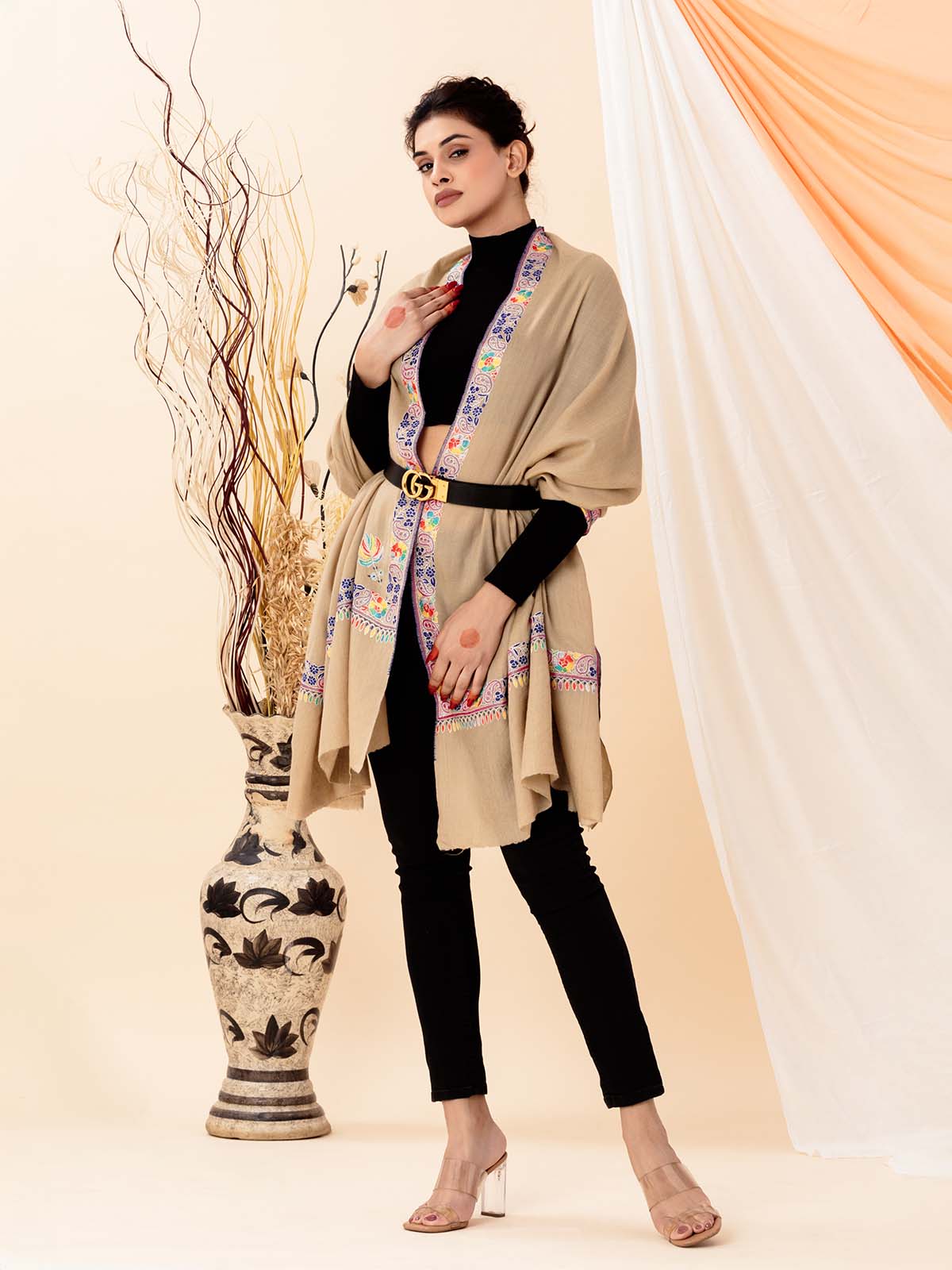 Wrap yourself in timeless elegance with this camel-toned wool Stole featuring exquisite multicolour Kashmiri embroidery along the borders. Though styled here like a cape, this piece is not stitched, giving you the freedom to drape it however you like — wear it open, belt it for a structured look, or throw it over your shoulder for effortless charm.Crafted for both comfort and sophistication, this unstitched Stole is perfect for elevating everyday outfits or adding a statement to festive ensembles.