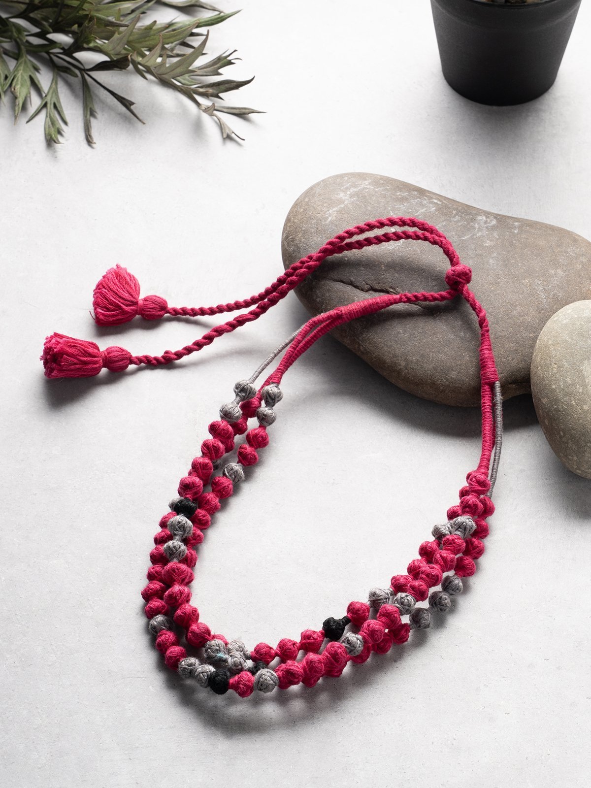 Bold and playful, this handcrafted Patwa thread bead necklace combines vibrant pink and grey tones with a braided tassel closure. Featuring rows of intricately wrapped thread beads, this piece adds a touch of tradition and color to casual and festive outfits alike.
