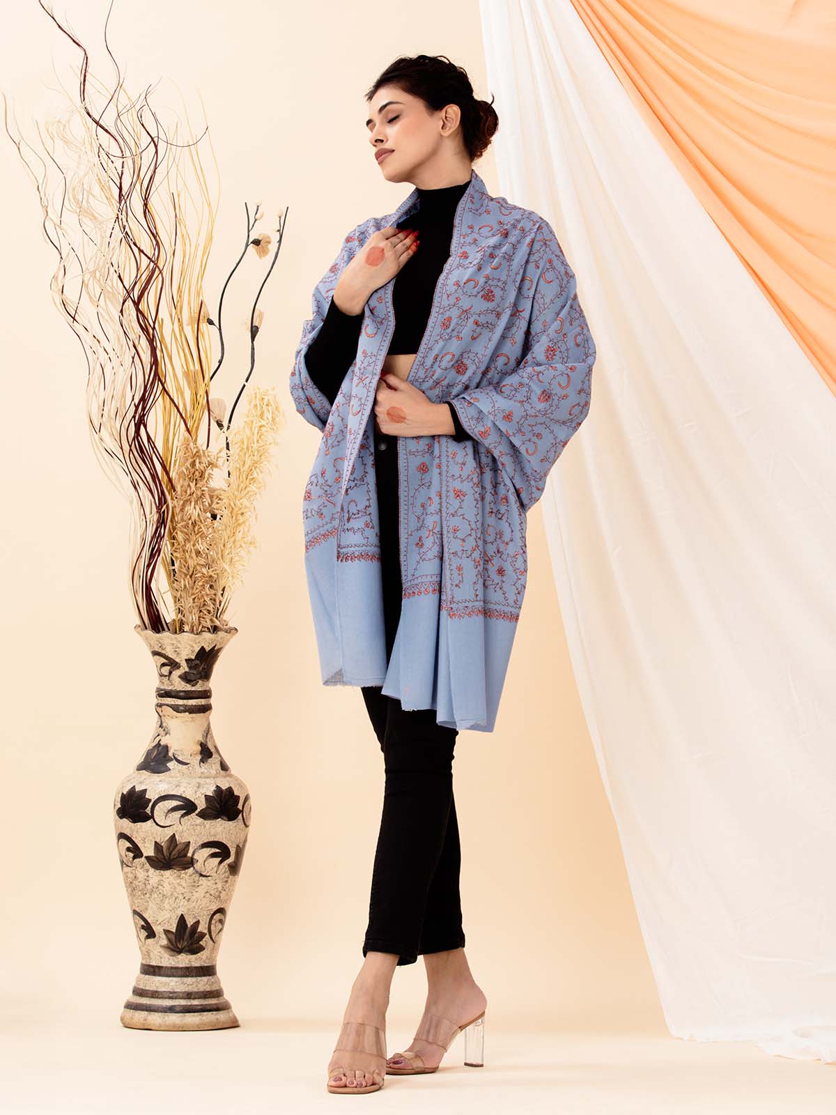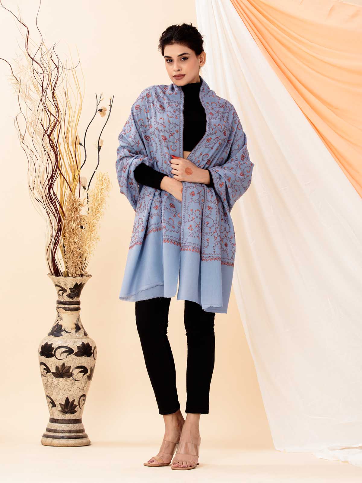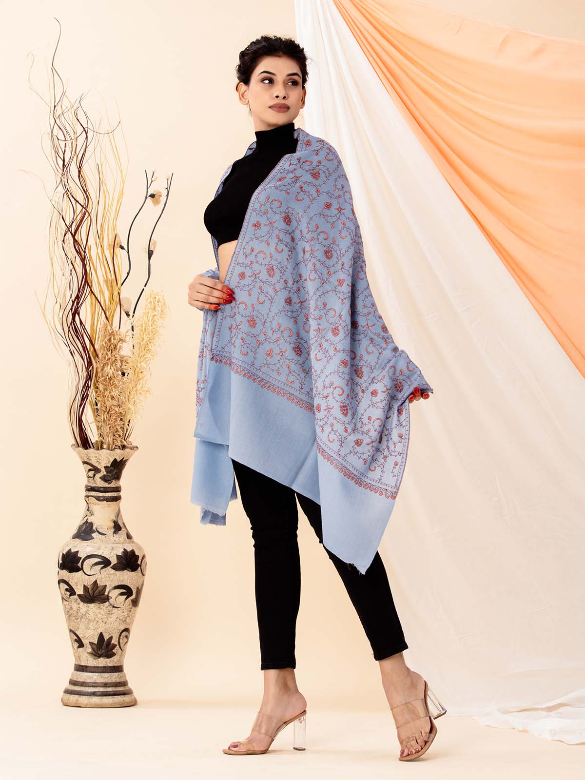 This elegant hand-embroidered stoles showcases intricate Sozni embroidery in rich, contrasting hues of red on a soft powder blue wool base. Crafted by skilled Kashmiri artisans, the delicate floral and vine motifs highlight the finesse of traditional needlework. Lightweight yet cozy, this Stole is perfect for layering, adding a graceful and timeless touch to any outfit. A true blend of heritage, warmth, and sophistication.