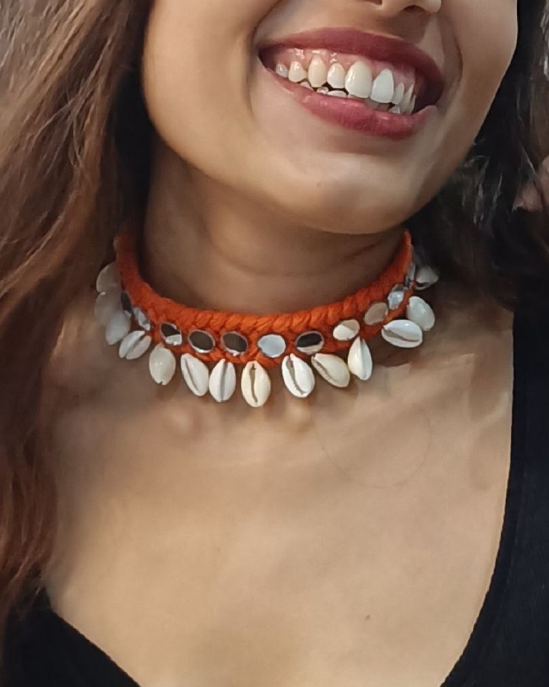 A playful fusion of red threads and reflective shell mirrors, this adjustable choker is a standout accessory. Designed with comfort and uniqueness in mind, it's perfect for festive or everyday outfits. Whether you're at a wedding function or a casual get-together, this piece offers just the right balance of sophistication and fun.
