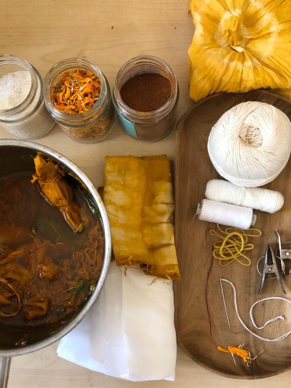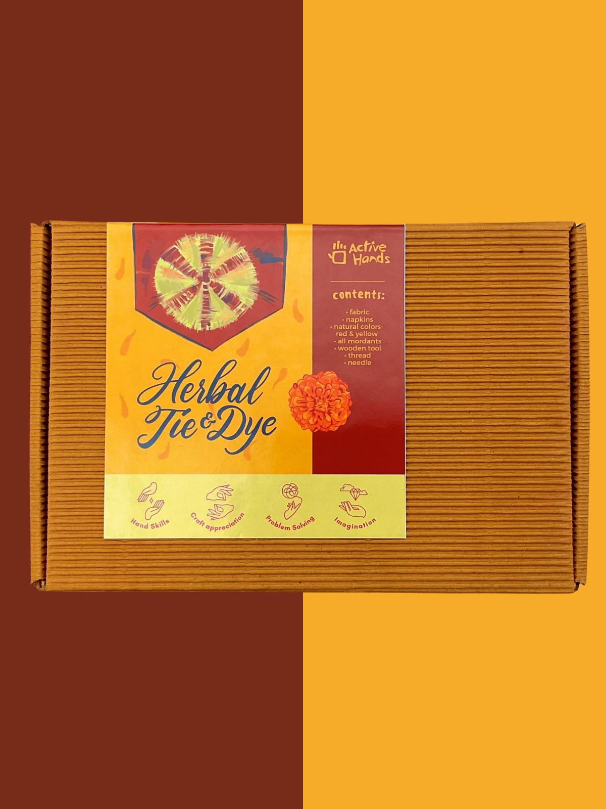 - In The Box: • 1 x Cotton Bandana (22”x22”) • 2 x Napkins • Dyes and Mordants (Yellow & Red) • Wooden hook • Thread • Needle