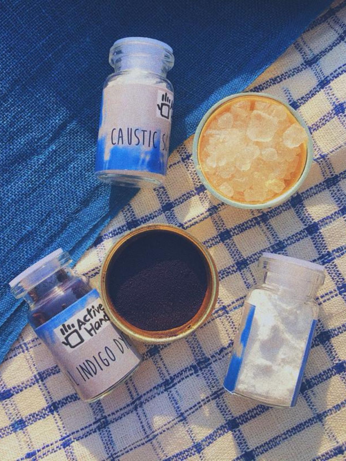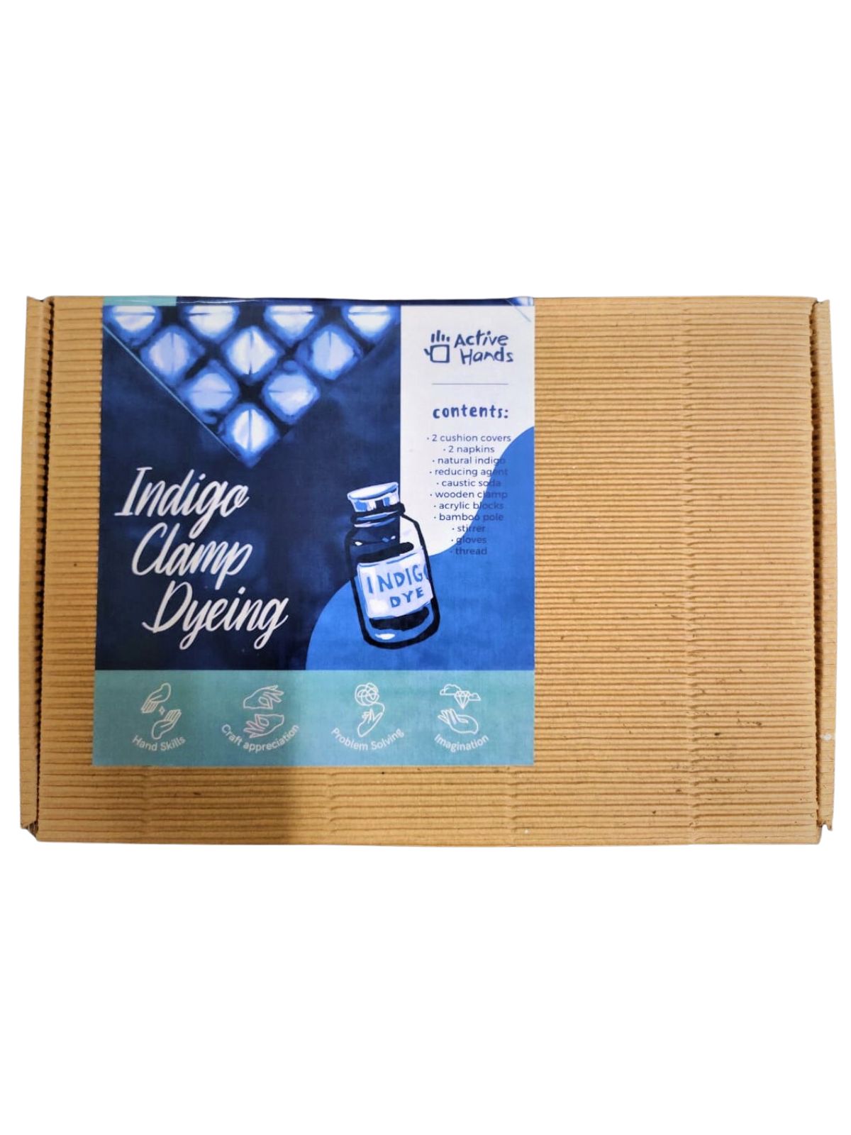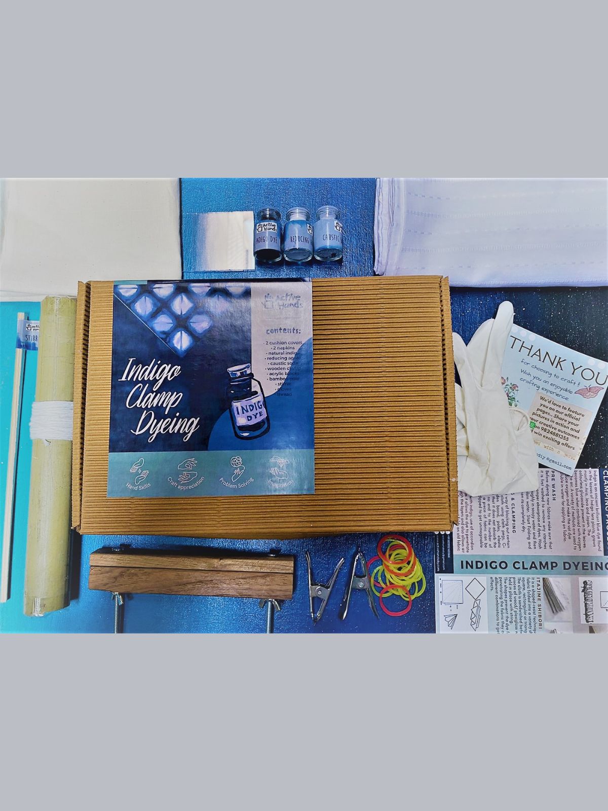 - In The Box: • 2 x Cotton cushion covers (16”x16”) • Natural Indigo color • Caustic Soda • Reducing agent • Threads • Acrylic blocks • Wooden Clamp • Bamboo pole • Wooden stirrer