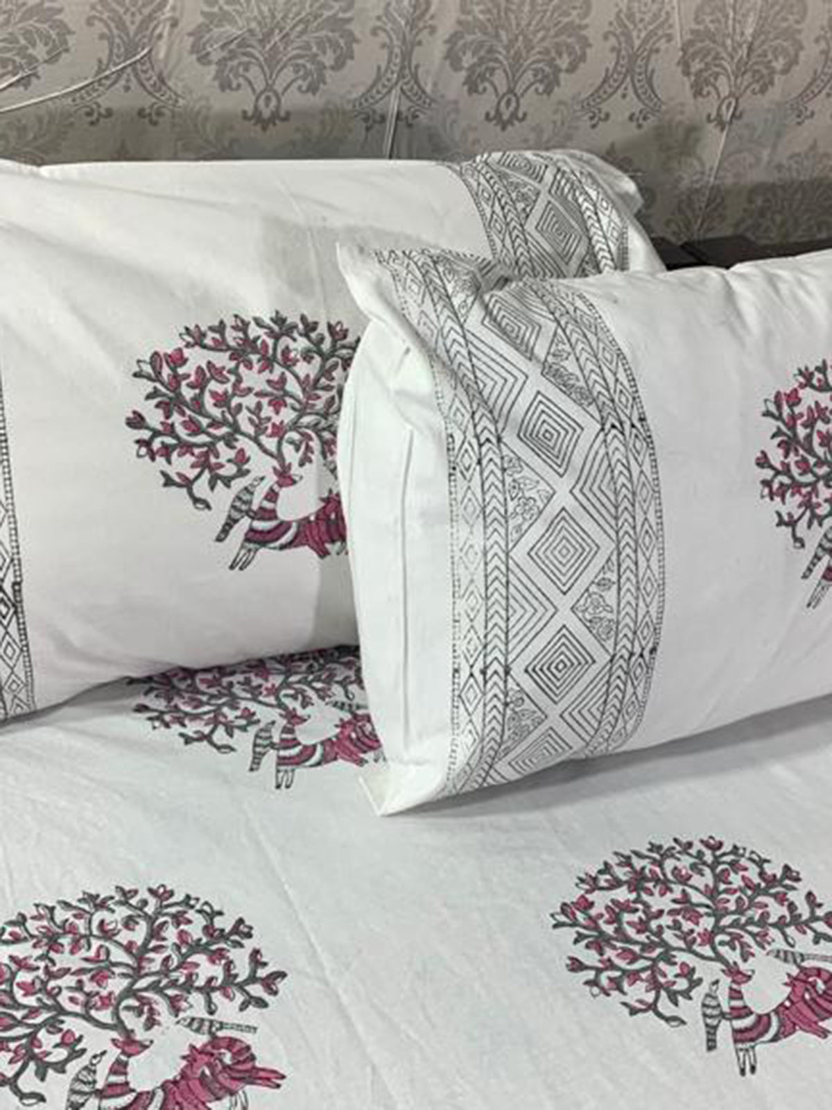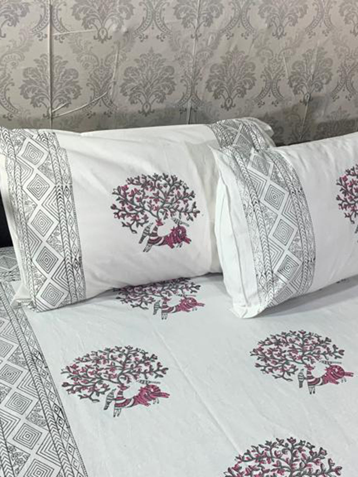 Gond Deer Hand Block Printed Bedsheet pink and black