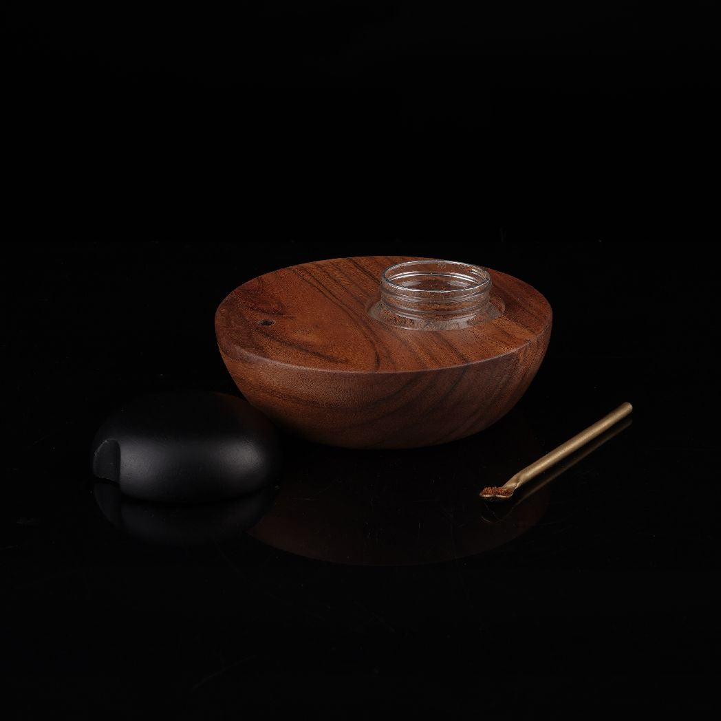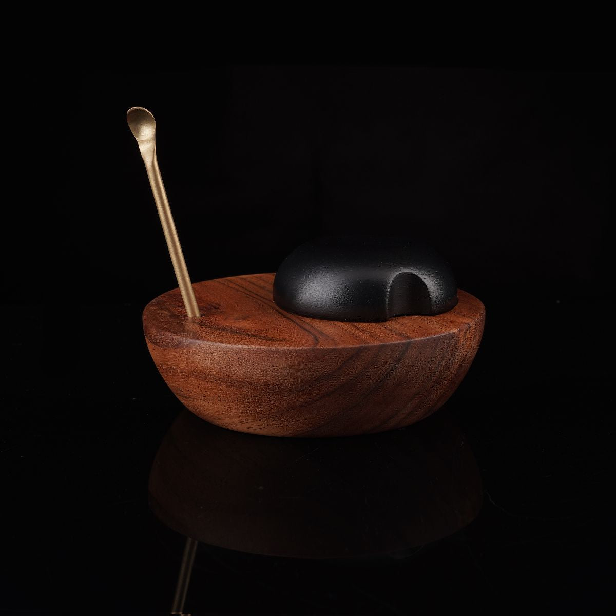 A celestial elegance with the Tashtari Container, inspired by the UFO's graceful silhouette. Crafted from smooth wood, complemented by a hand-beaten brass spoon. Elevate your indulgence with this otherworldly blend of form and function.