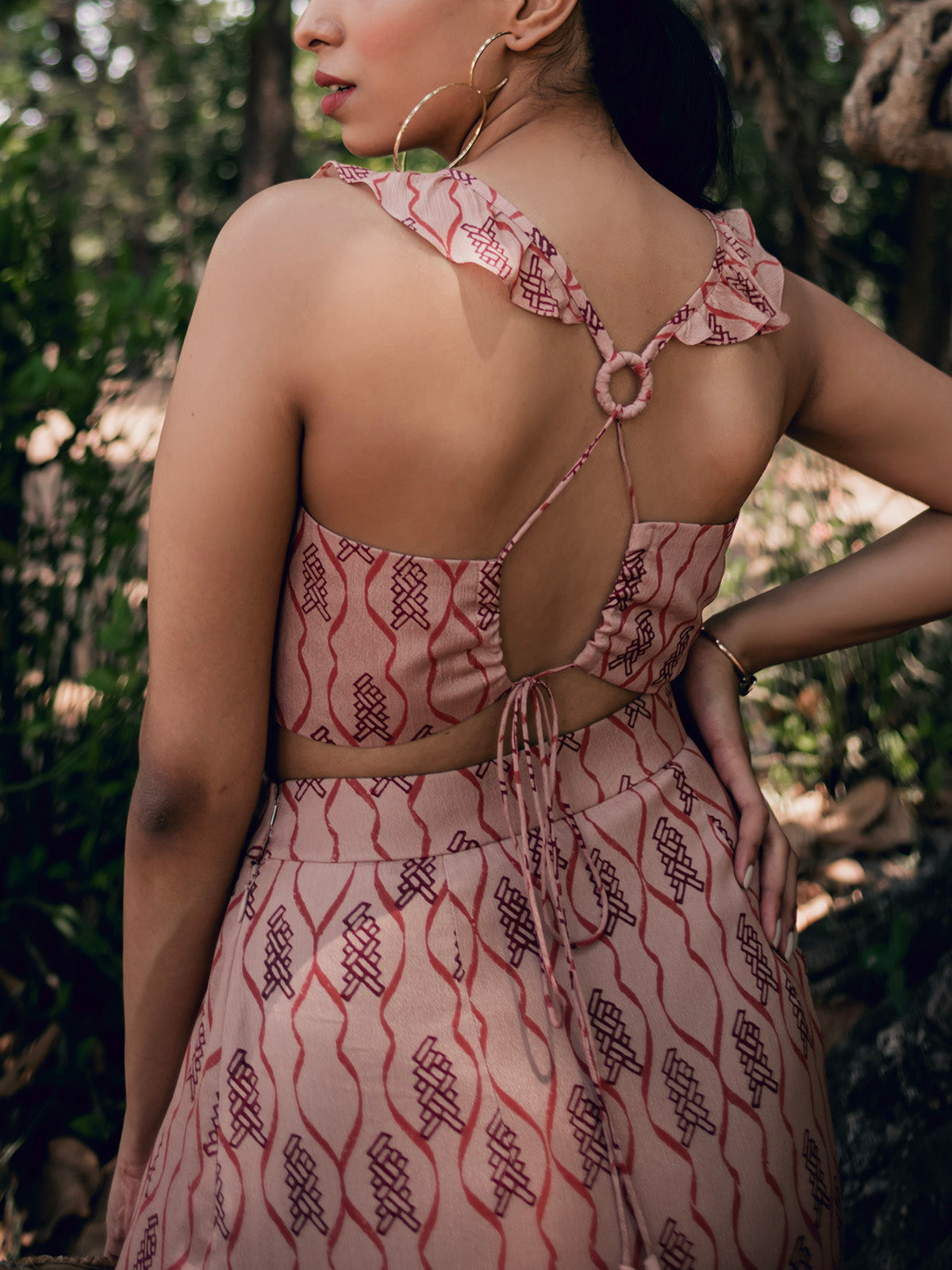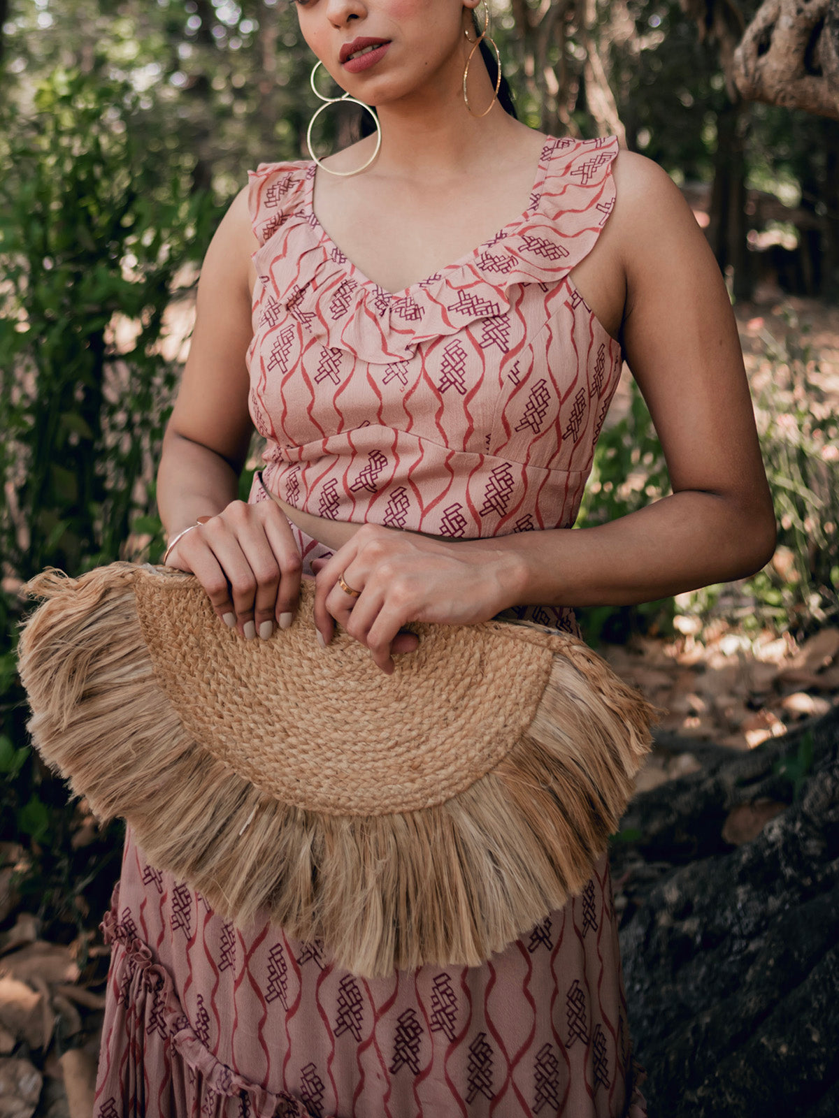 Step into the limelight with our stunning crop top, a chic expression of sensuality. The deep frill neck and tantalizing back tie captivate attention with sultry allure. Lined with the softest Shantung Silk, and crafted from crinkle chiffon fabric, it's a bold and beautiful choice for commanding attention in every twist and turn. Hand-block printed by local artisans in Jaipur, each piece is a unique masterpiece, showcasing the artistry of our skilled karigars in Mumbai.