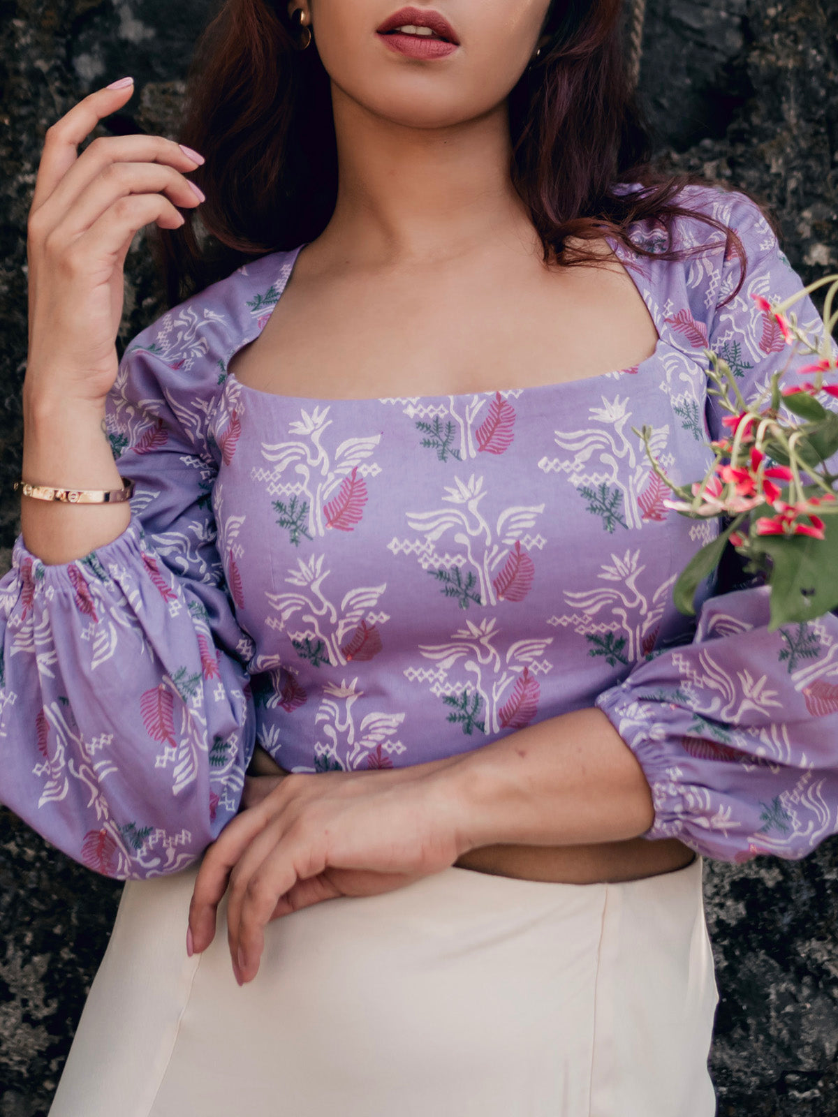 Elevate your summer style with the puffed sleeves crop top, a dreamy blend of vintage charm and contemporary chic. The deep square neckline with back buttons and hook opening adds allure. Gathered long sleeves with elastic cuffs bring a touch of romance. Crafted from hand-block printed fabric by local artisans, and lined with the softest Shantung Silk, this piece is a love letter to your summer wardrobe. Each top is a unique masterpiece, showcasing the craftsmanship of our skilled karigars in Jaipur and Mumbai.