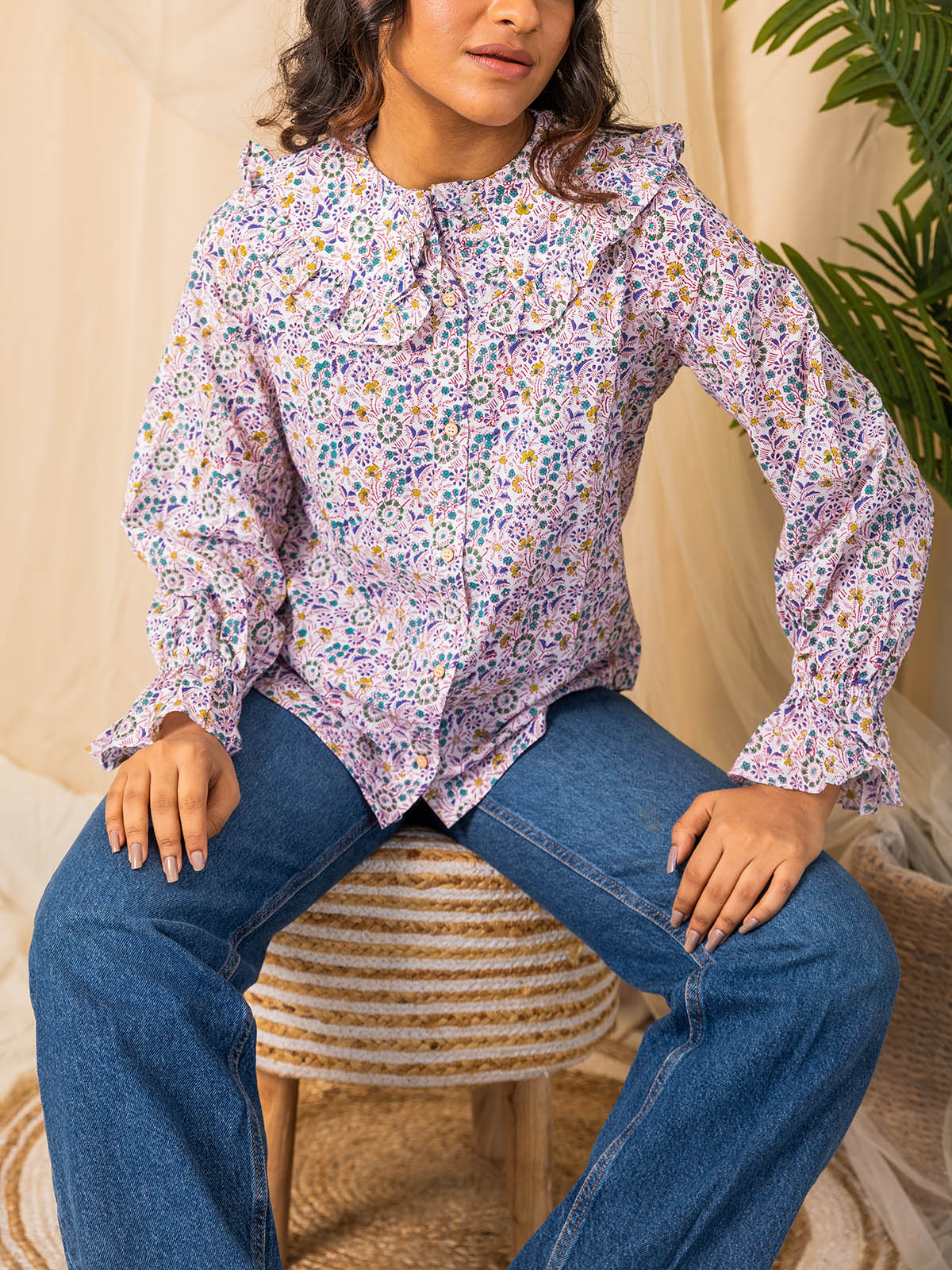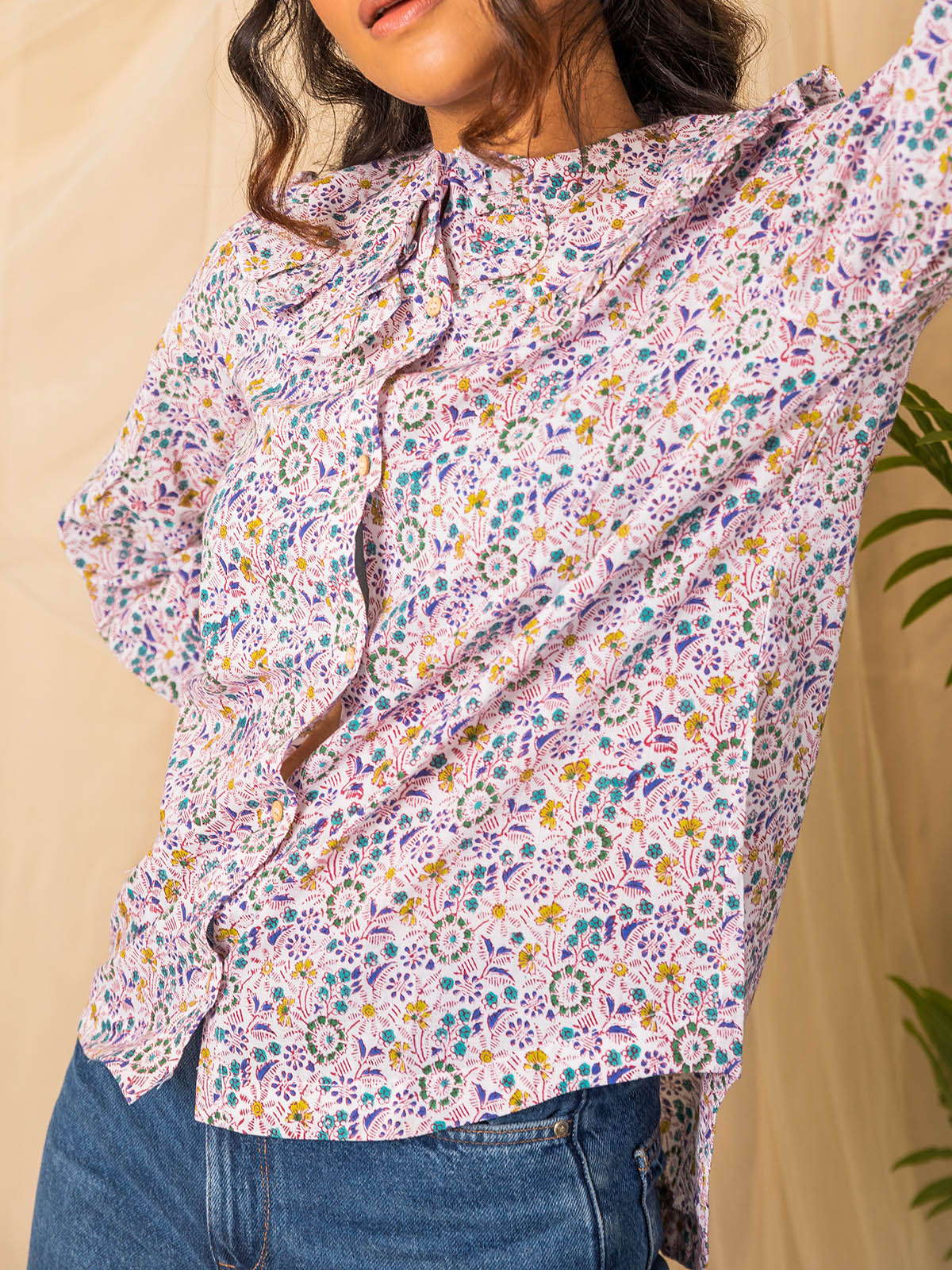 Unleash your confidence in this versatile shirt where micro multifloral fabric blooms on every inch. The oversized fit, collar with frill details, and high-low apple shape hemline blend comfort and style. Wooden buttons, full sleeves with elastic cuffs, and a 100% pure Mul Cotton construction add charm. Pair with a pencil skirt for a subtly bold impression or casual denims for weekend brunches. Each piece is a unique creation, hand-block printed by local artisans in Jaipur and stitched by skilled karigars in Mumbai.