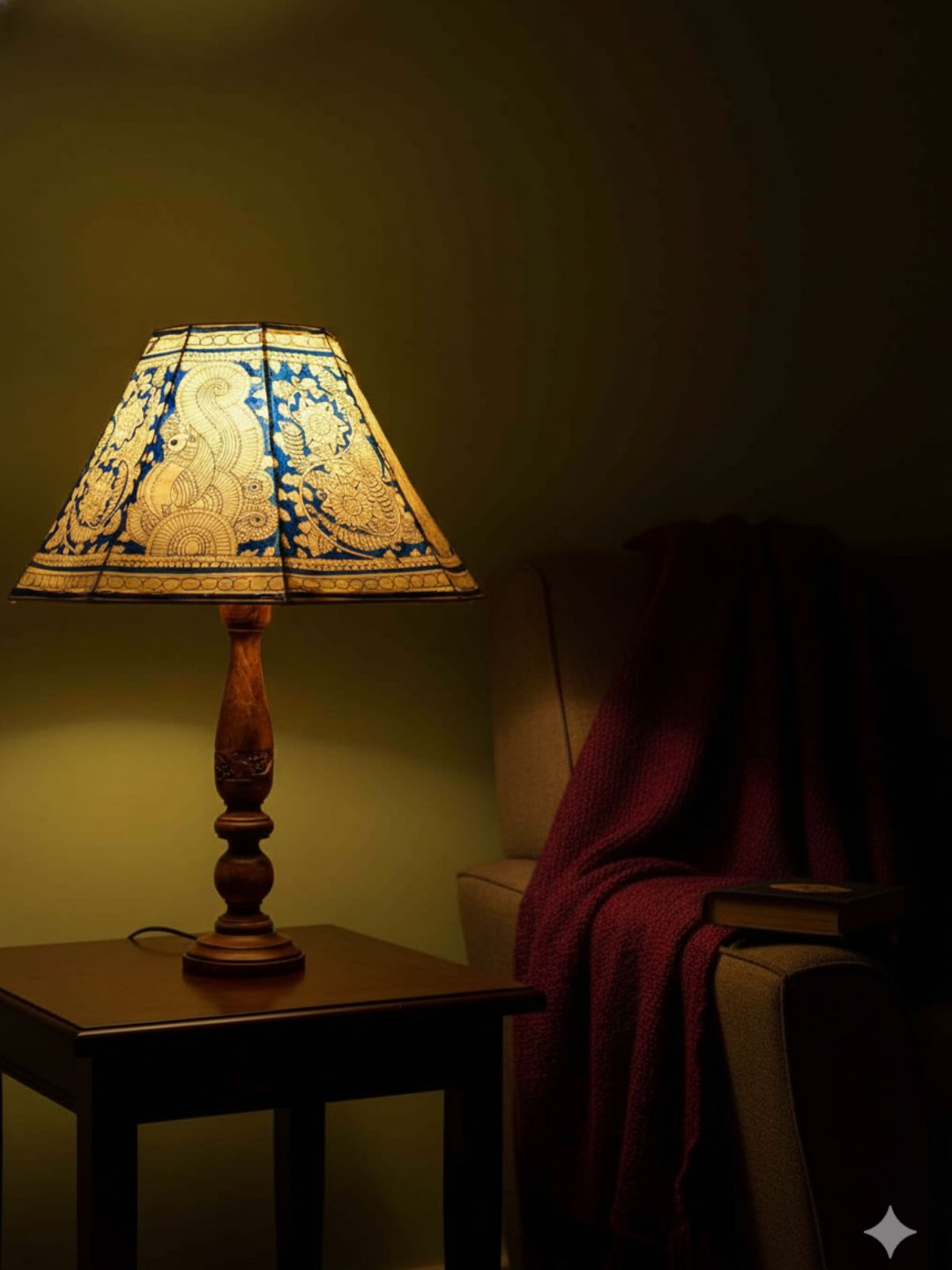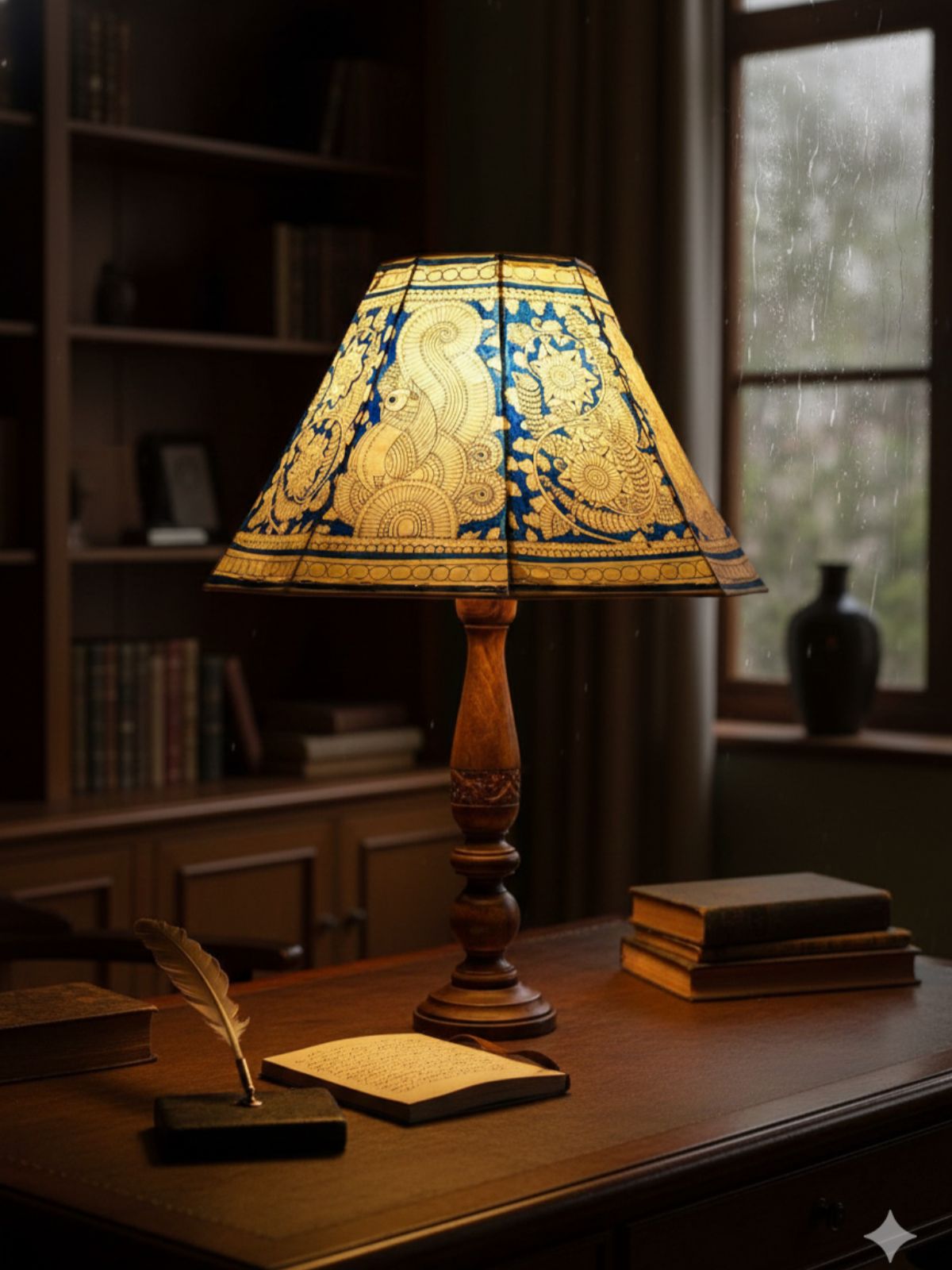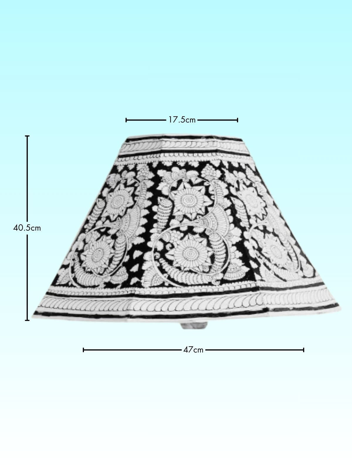 This 16-inch hand-painted lampshade features elegant floral and peacock motifs inspired by the traditional Tholu Bommalata art form. Crafted on genuine parchment leather, it brings a graceful glow and cultural charm to any room. Perfect as a housewarming, wedding, or anniversary gift. Pair with a wooden or ceramic base for timeless appeal.