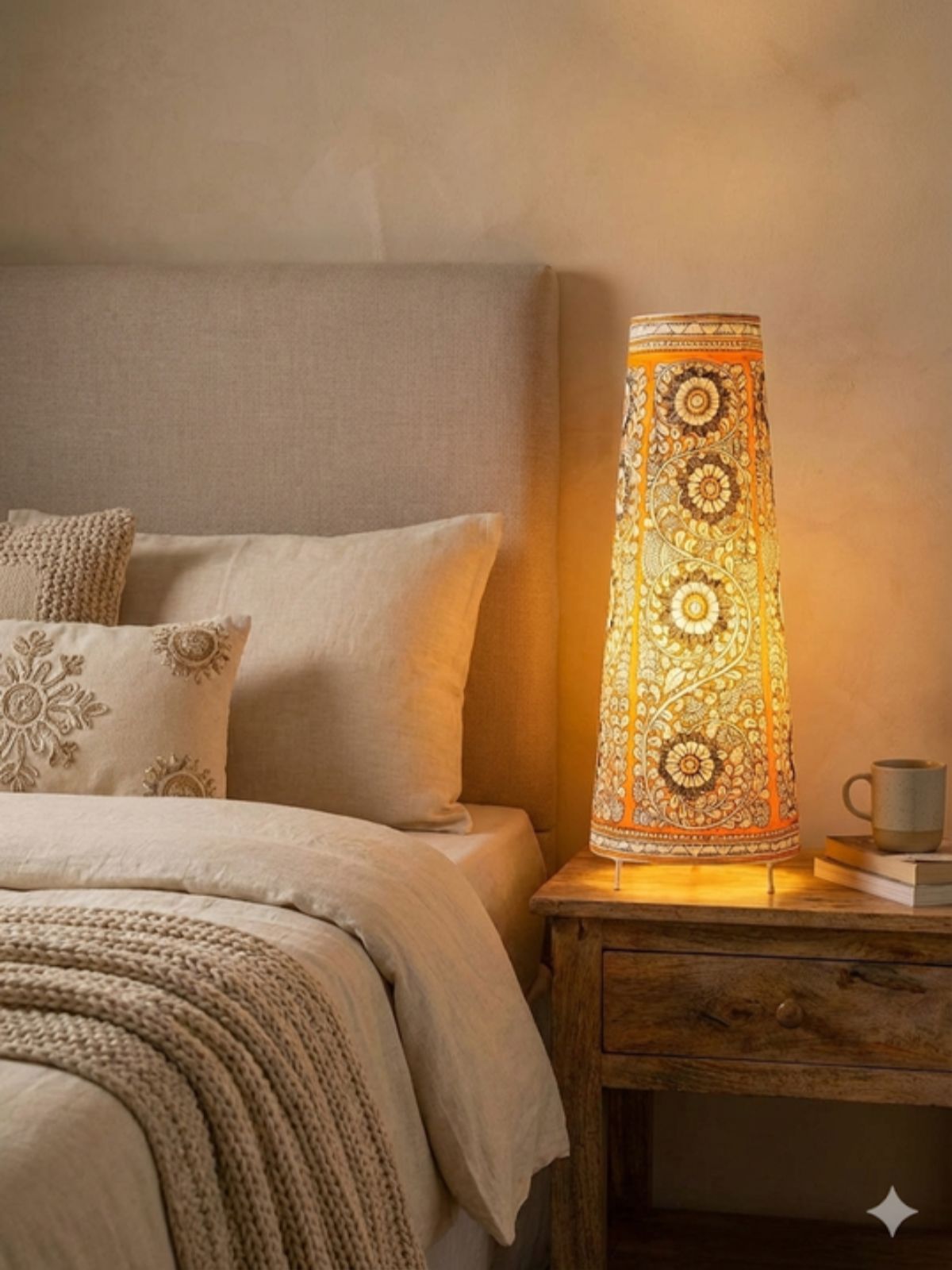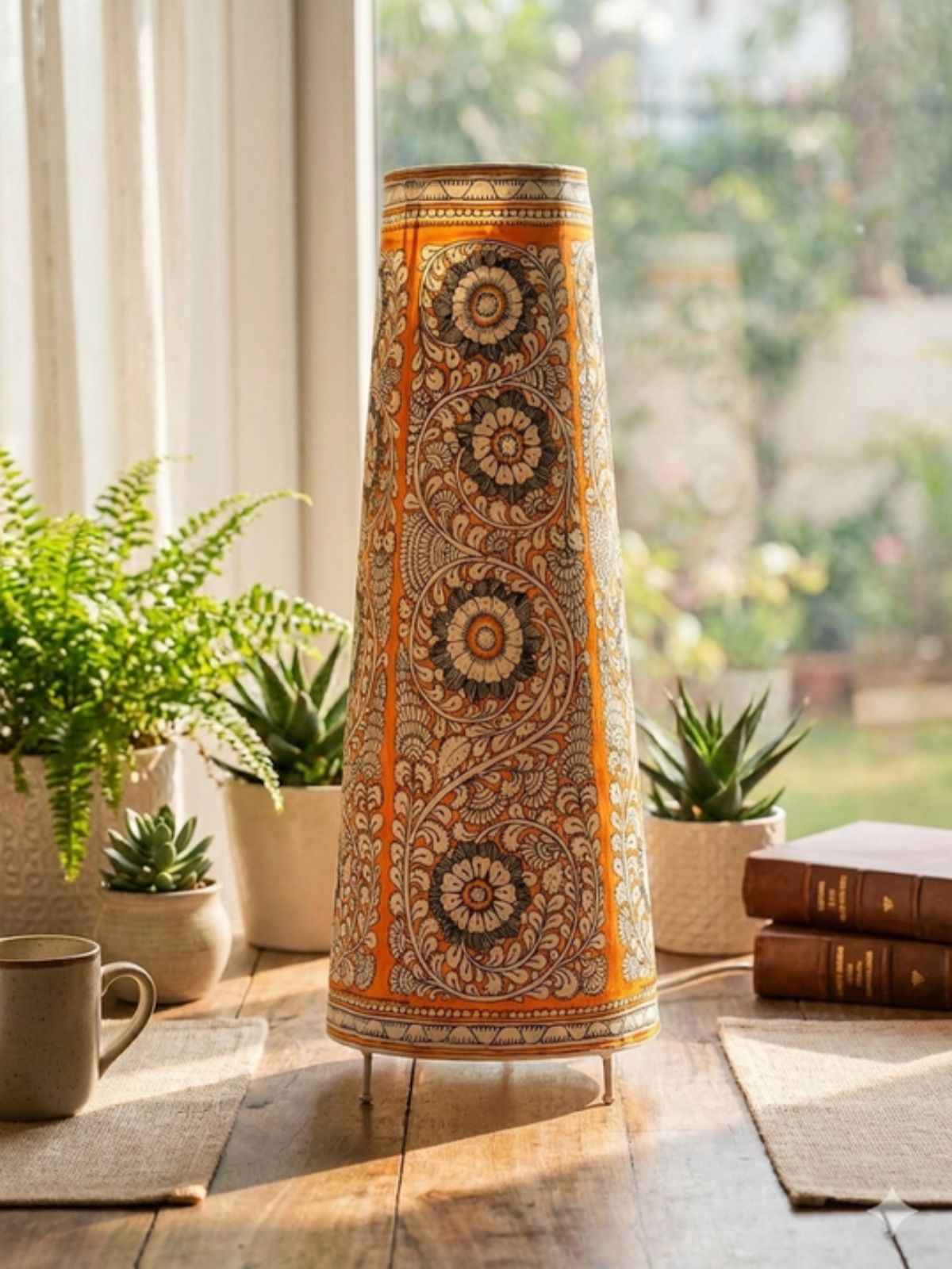 Bursting with warmth and artistry, this lamp is adorned with swirling floral motifs in shades of yellow, orange, and white, outlined with black for definition. The repetitive circular flower patterns and flowing vines create a harmonious balance of symmetry and movement. It’s a perfect accent piece to brighten up your room while showcasing the elegance of hand-painted craftsmanship.