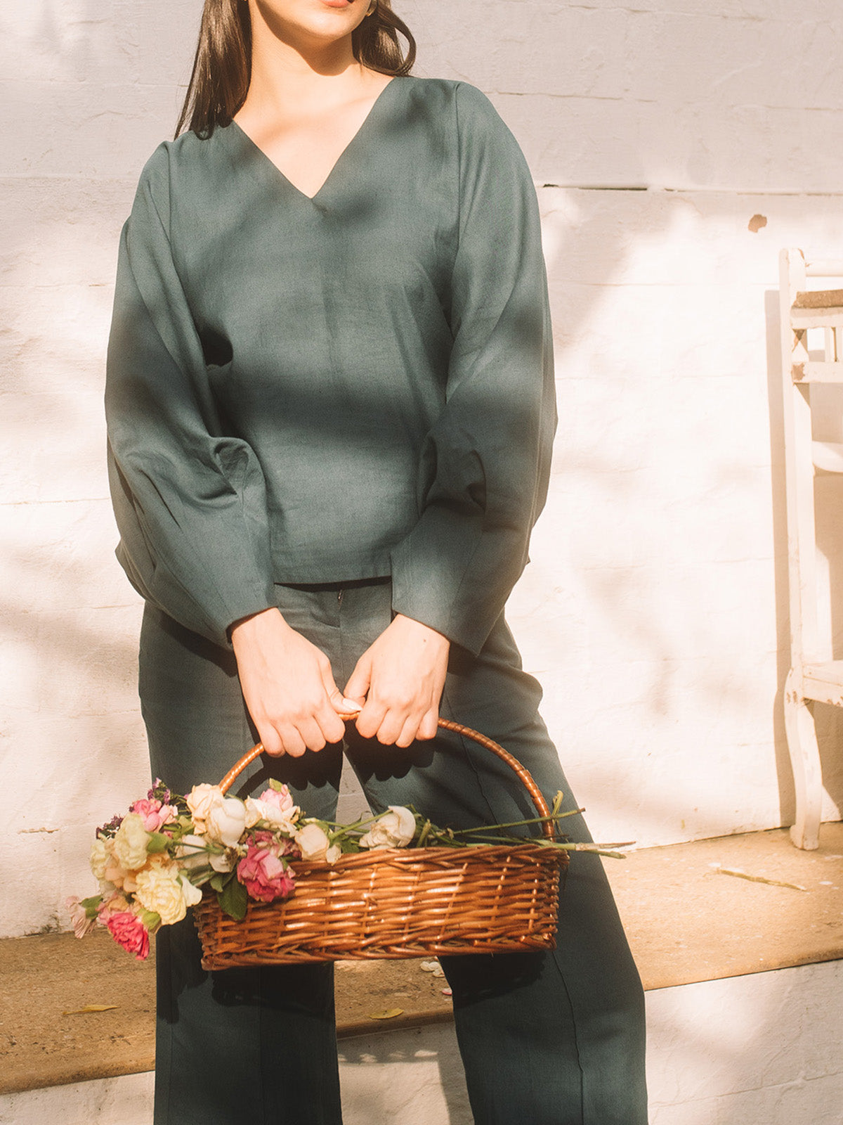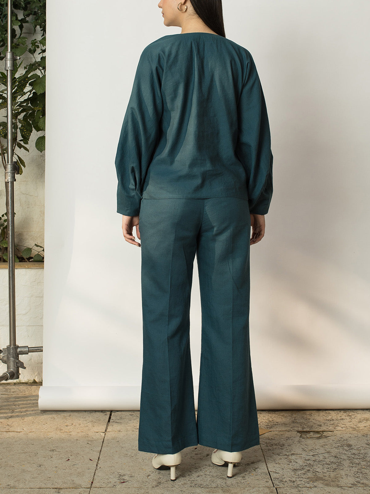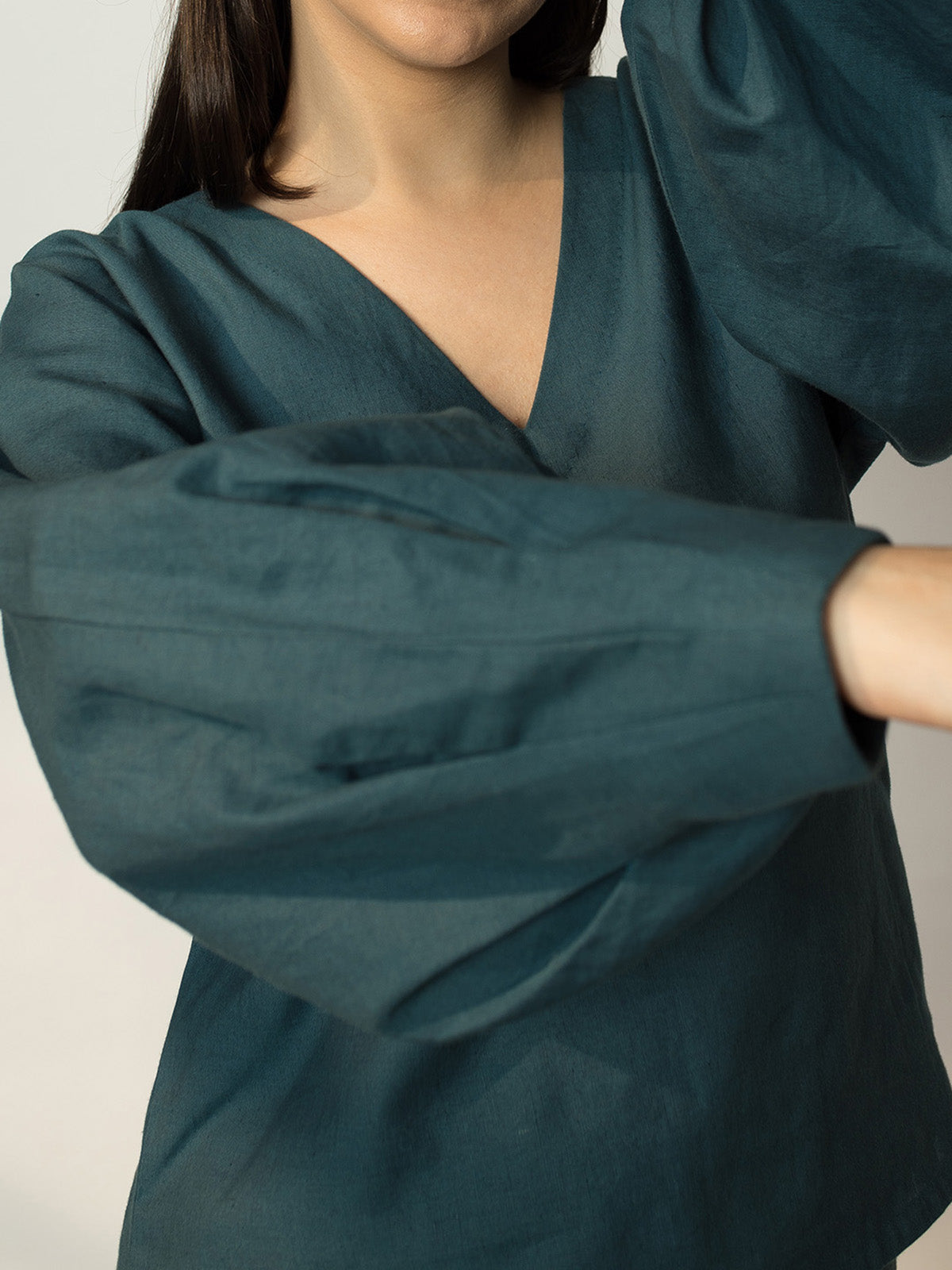 Offered in a rich, dark teal hue this top is cut in dolman style with a straight shape and is contrasted by exaggerated pleated sleeves. It is designed with a classic V neck and is easy to slip on. Pair it with the Boot-leg Pants for a complete look.