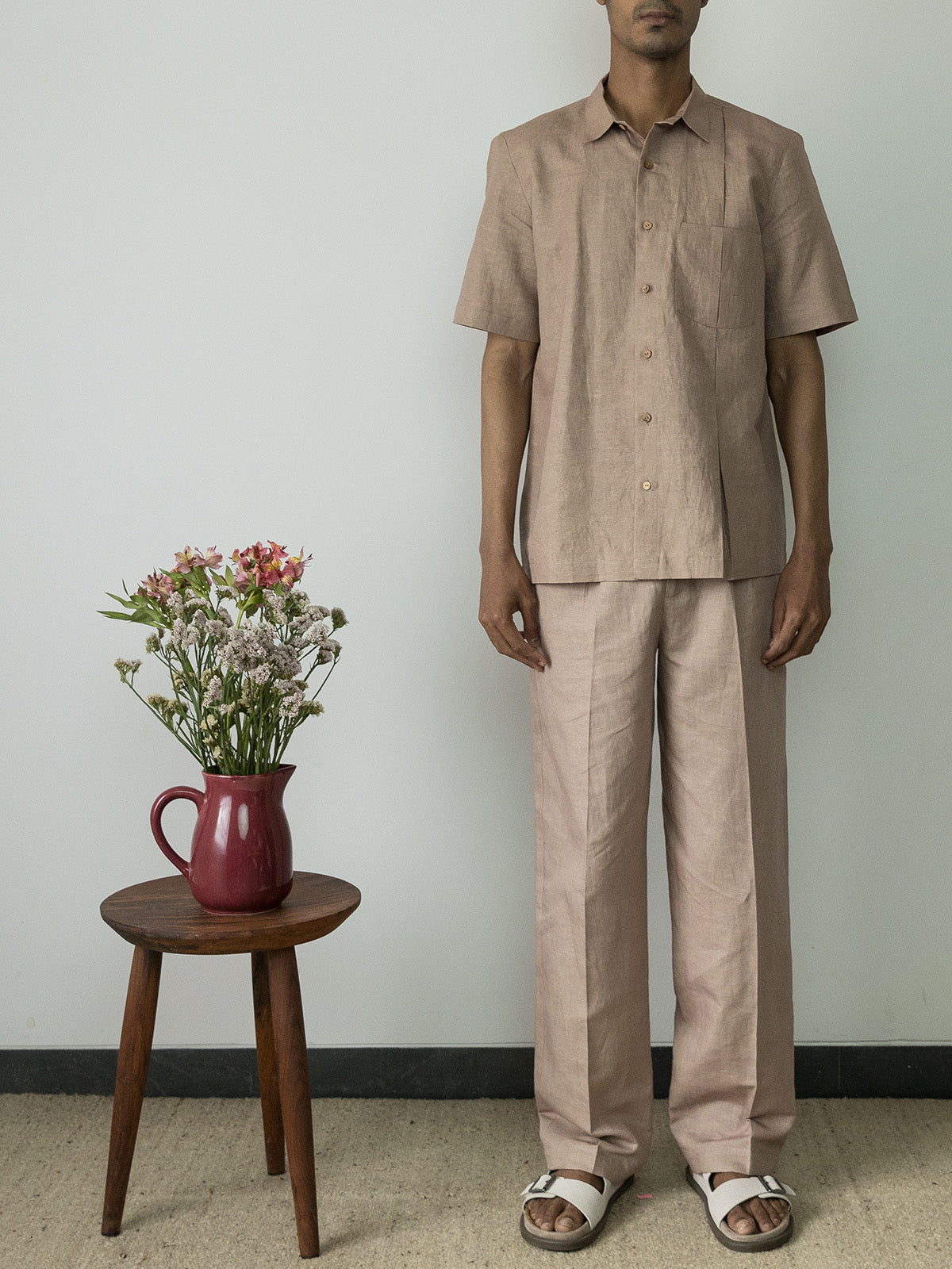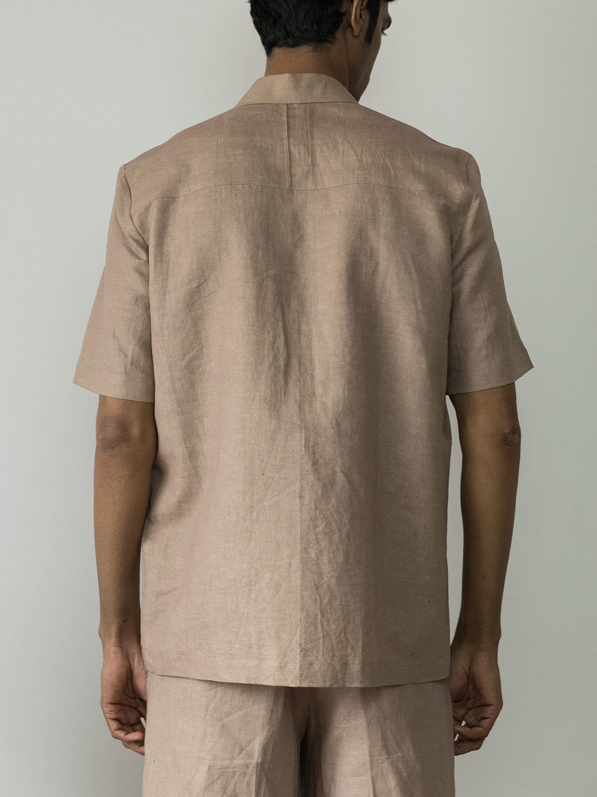 The Inverted Pleat Shirt features a short-sleeve design in a versatile shade, elevated by an inverted pleat on one side for added continuity. It includes a subtle back yoke, a regular collar, a patch pocket, and a buttoned placket, combining classic elements with distinctive details. This shirt is a perfect head-turner, blending style with sophistication.