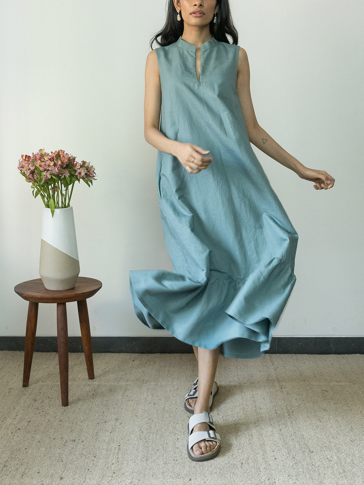 This summery maxi dress is light and breathable with a gathered flowy bottom. It has a mandarin collar and zipper neckline that you can style as per your mood. Discreet side seam pockets.