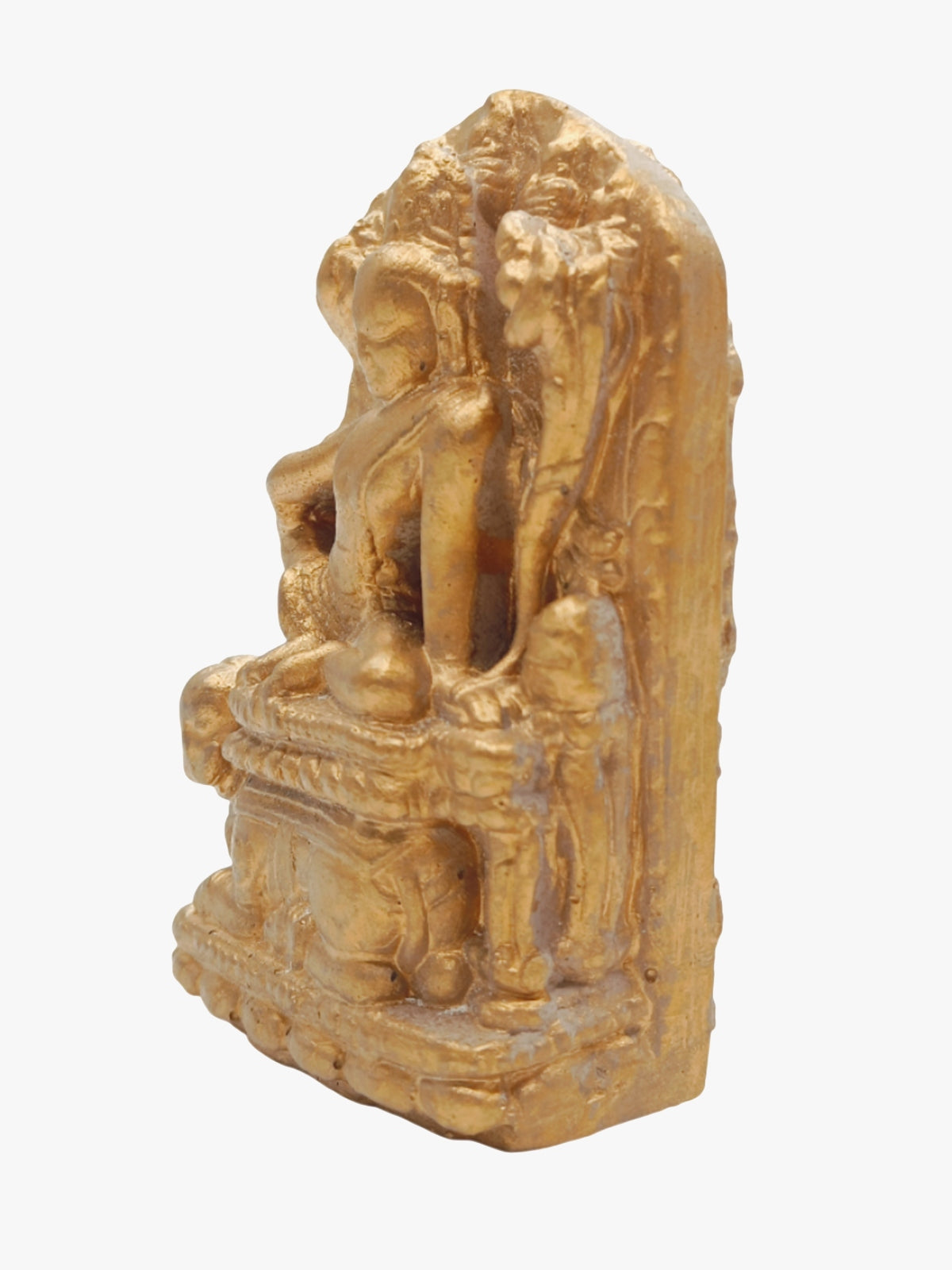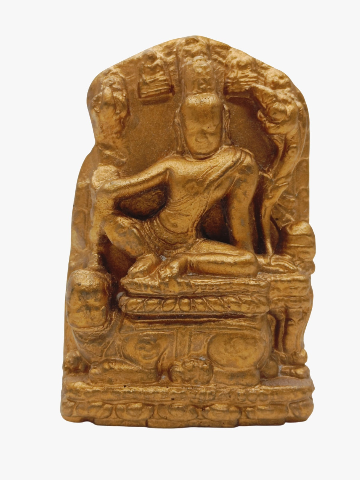 A rare museum replica of the Pala Dynasty Avalokitshvara, likely 10th century CE. The sculpture originally carved in sandstone the sculpture depicts a lion with the head looking to the right and hair tied in a knot above. The Lord of the World, Simhanada (roar of a lion), with a body white in colour, the right hand is extended above the knee in the refuge giving abhaya mudra and the left placed firmly on the seat behind the back. Having the appearance of an ascetic, seated in the lalitaraja posture. On the right side is a white snake coiled around an upright trident and on the left side, above a white lotus stem is a skullcup filled with various fragrant flowers and adorned with a flaming sword. This hand moulded replica is cast in concrete and PoP for a smoother finish and yet maintaining the details of the original sculpture.
