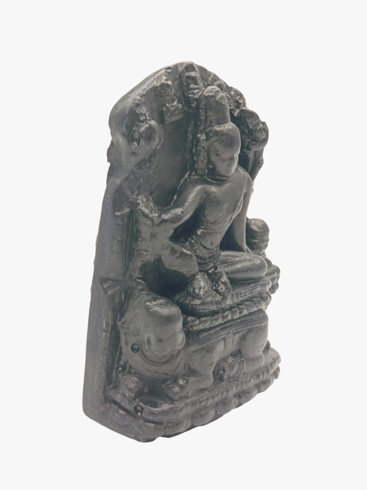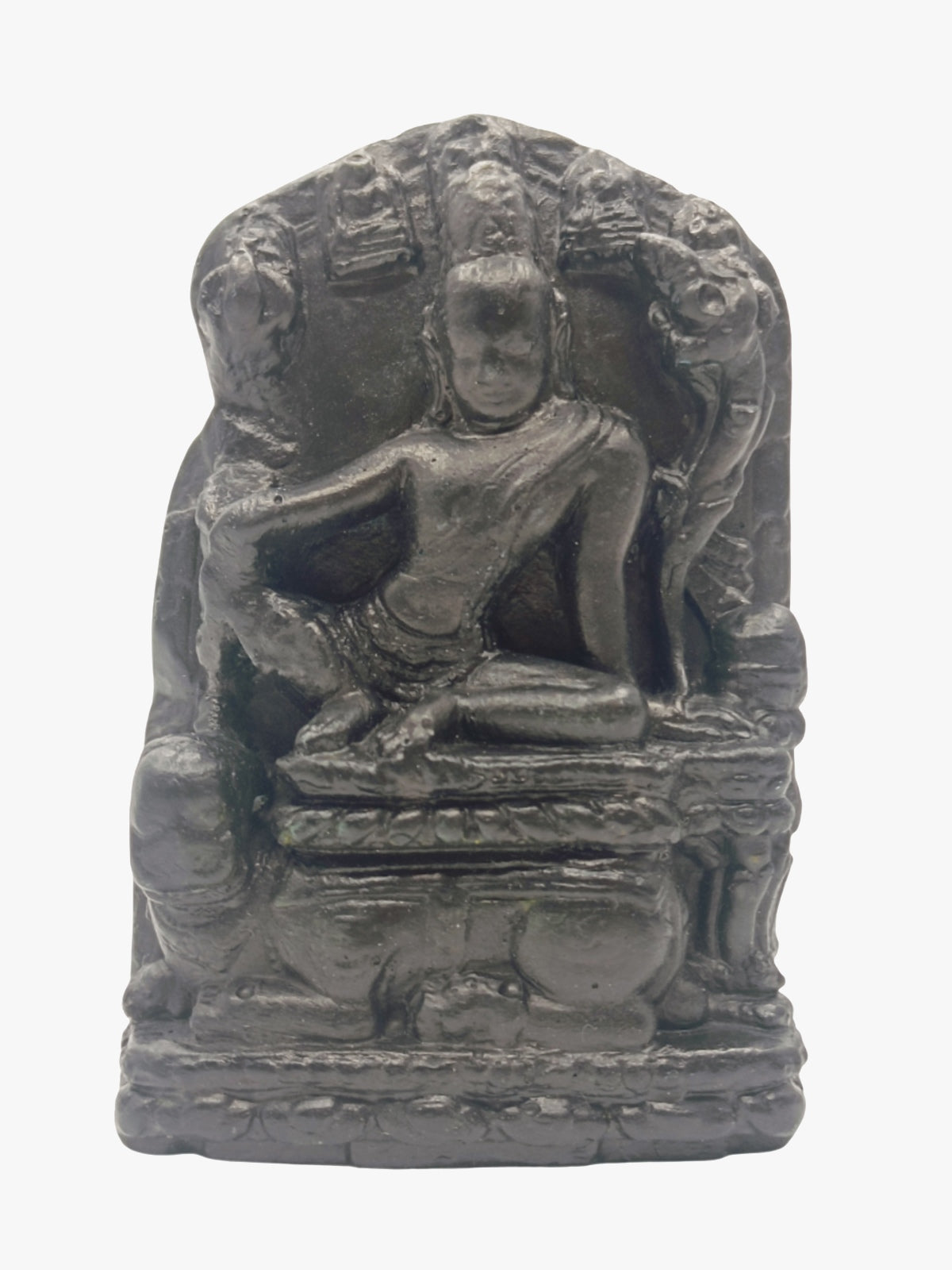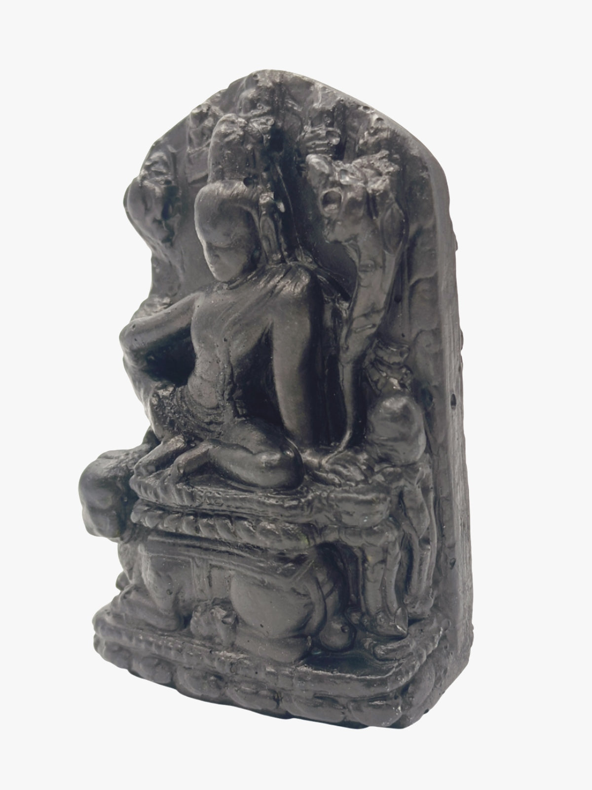 A rare museum replica of the Pala Dynasty Avalokitshvara, likely 10th century CE. The sculpture originally carved in sandstone the sculpture depicts a lion with the head looking to the right and hair tied in a knot above. The Lord of the World, Simhanada (roar of a lion), with a body white in colour, the right hand is extended above the knee in the refuge giving abhaya mudra and the left placed firmly on the seat behind the back. Having the appearance of an ascetic, seated in the lalitaraja posture. On the right side is a white snake coiled around an upright trident and on the left side, above a white lotus stem is a skullcup filled with various fragrant flowers and adorned with a flaming sword. This hand moulded replica is cast in concrete and PoP for a smoother finish and yet maintaining the details of the original sculpture.