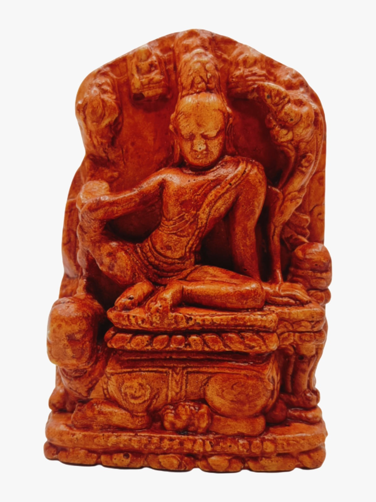 A rare museum replica of the Pala Dynasty Avalokitshvara, likely 10th century CE. The sculpture originally carved in sandstone the sculpture depicts a lion with the head looking to the right and hair tied in a knot above. The Lord of the World, Simhanada (roar of a lion), with a body white in colour, the right hand is extended above the knee in the refuge giving abhaya mudra and the left placed firmly on the seat behind the back. Having the appearance of an ascetic, seated in the lalitaraja posture. On the right side is a white snake coiled around an upright trident and on the left side, above a white lotus stem is a skullcup filled with various fragrant flowers and adorned with a flaming sword. This hand moulded replica is cast in concrete and PoP for a smoother finish and yet maintaining the details of the original sculpture.