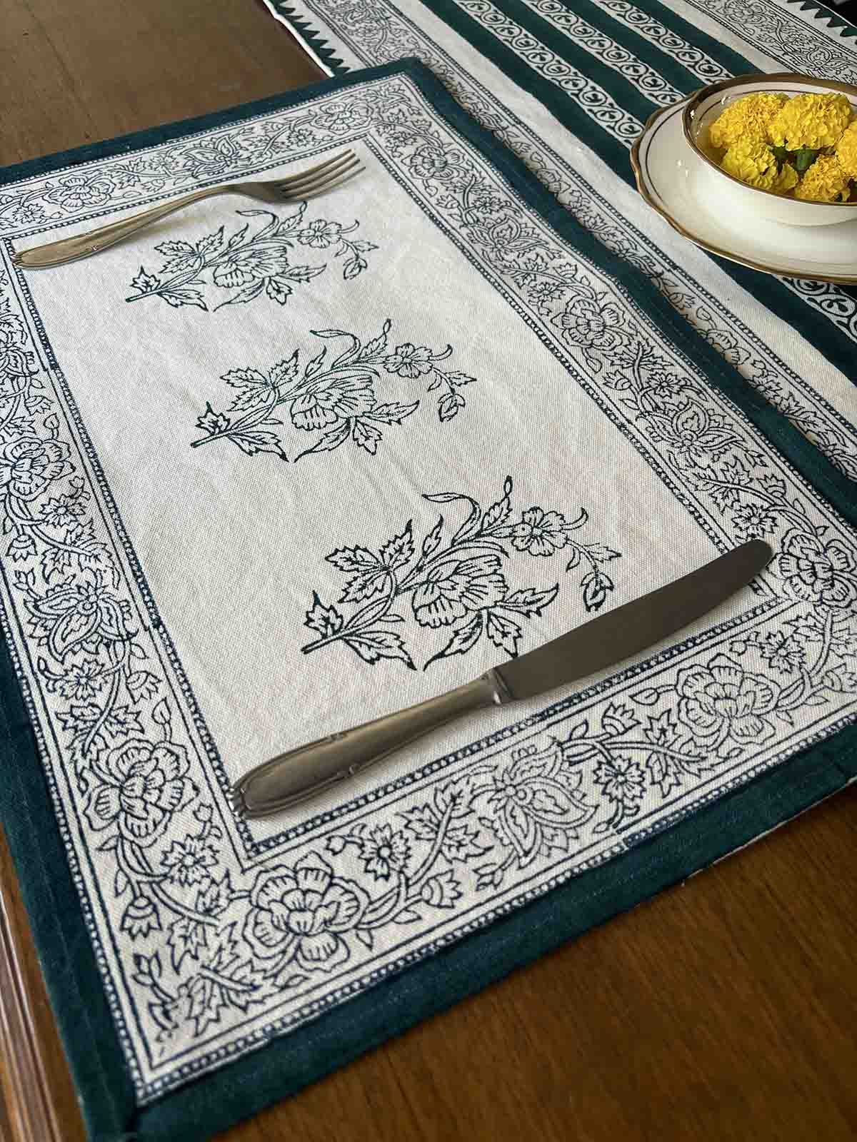 Enhance your table with these matching teal blue placemats, blending floral lines and geometric patterns for a seamless, modern look. Perfectly paired with the coordinating table runner, they bring a touch of refined artistry to your dining experience.