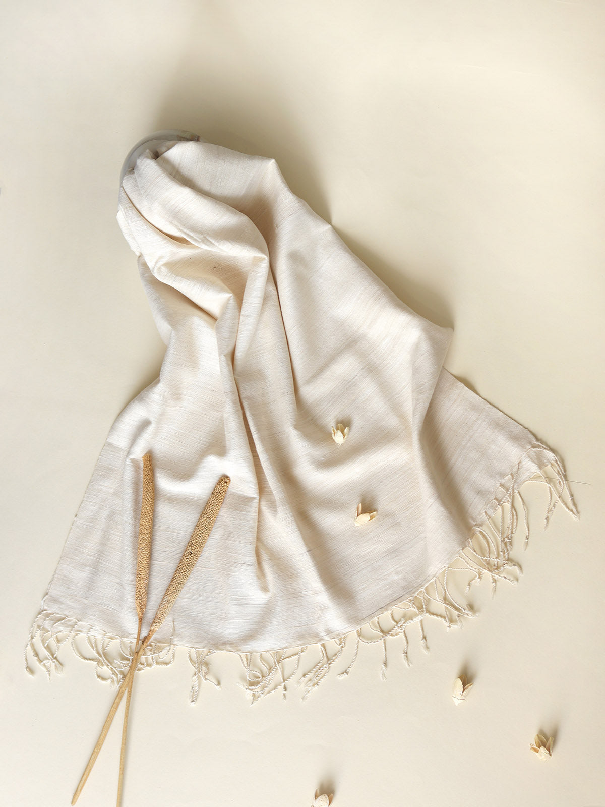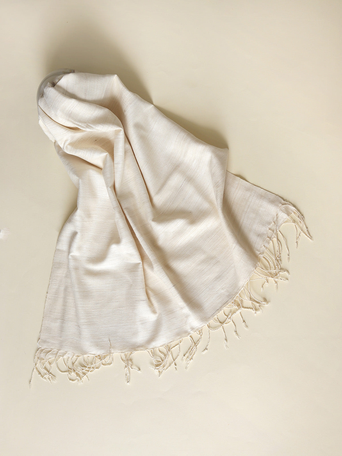Indulge in the elegance of Ahimsa silk , where luxury meets compassion. Crafted from non-violent Eri silk, these scarves are meticulously handwoven by skilled artisans in Assam. Each piece, dyed naturally, embodies a rich heritage and empowers communities. Embrace tradition, sustainability, and empowerment with our exquisite silk scarf in solid white.