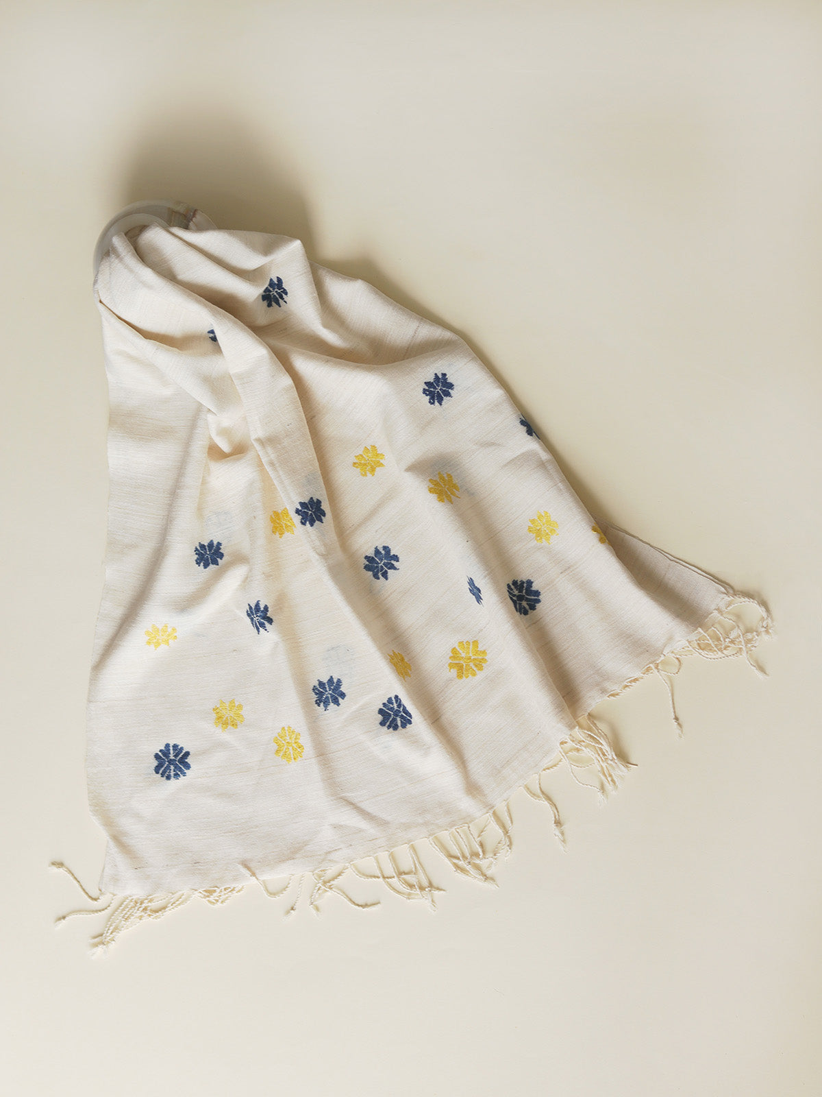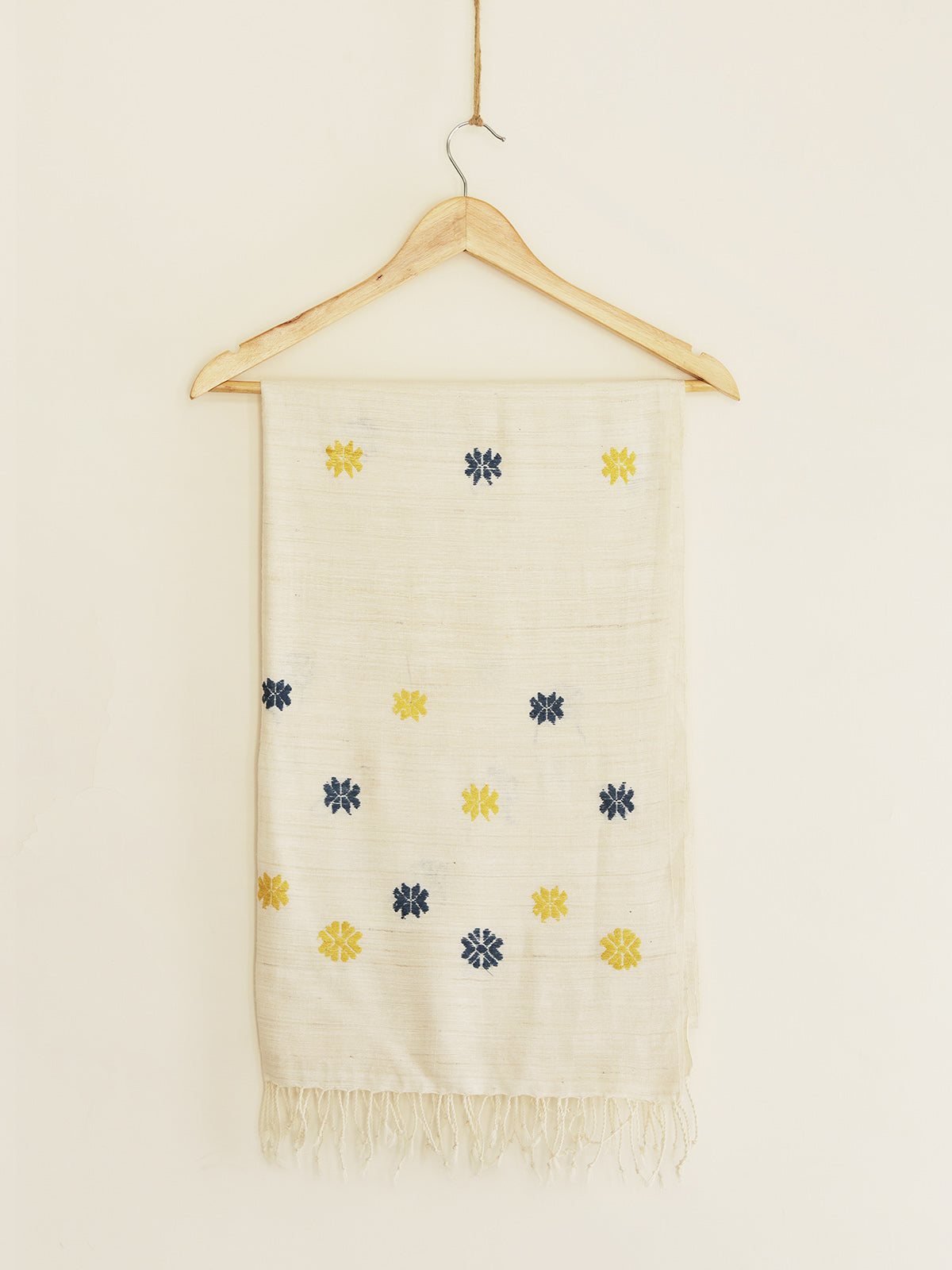 Experience the essence of Ahimsa silk . Handwoven by skilled women artisans in Assam, these scarves tell a unique story of tradition, sustainability, and empowerment. Made from 100% Eri silk, adorned with blue and yellow flowers in white, each scarf is a luxurious, non-violent, and eco-friendly masterpiece. Embrace a narrative that bridges cultures, nurtures nature, and uplifts lives while indulging in the softness and subtle sheen of these exquisite scarves.