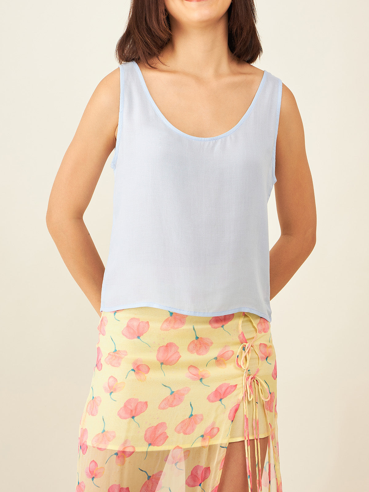 Introducing our simple and sleek blouson, crafted from 100% plant-based viscose. This sleeveless tank top in a beautiful powder blue shade can be worn on its own as a standalone piece, offering a minimalist and chic look. Alternatively, it serves as a versatile camisole that can be layered under our sheer long sleeves top in powder blue for a stylish and coordinated outfit. Every stitch in this top is purely hand-stitched, showcasing the dedication and craftsmanship that goes into its creation.