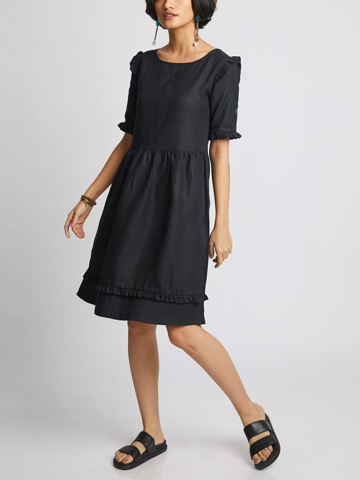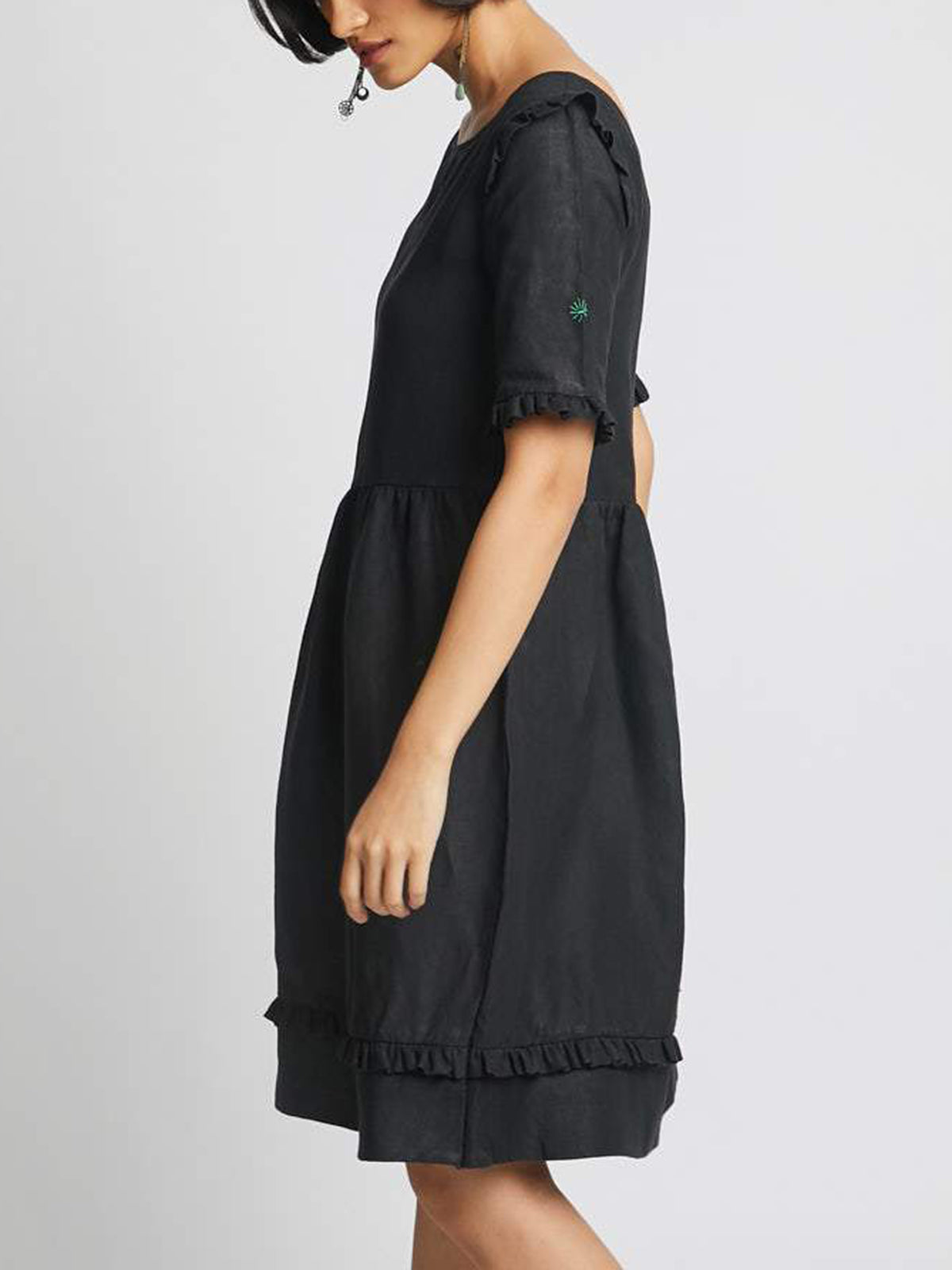 Introducing the Flare Ruffle Dress in Black! This quintessential frilled dress boasts intricate tailoring and only gets softer with each wash. Crafted from resilient hemp, it offers benefits such as UV protection, mold resistance, and carbon negativity.