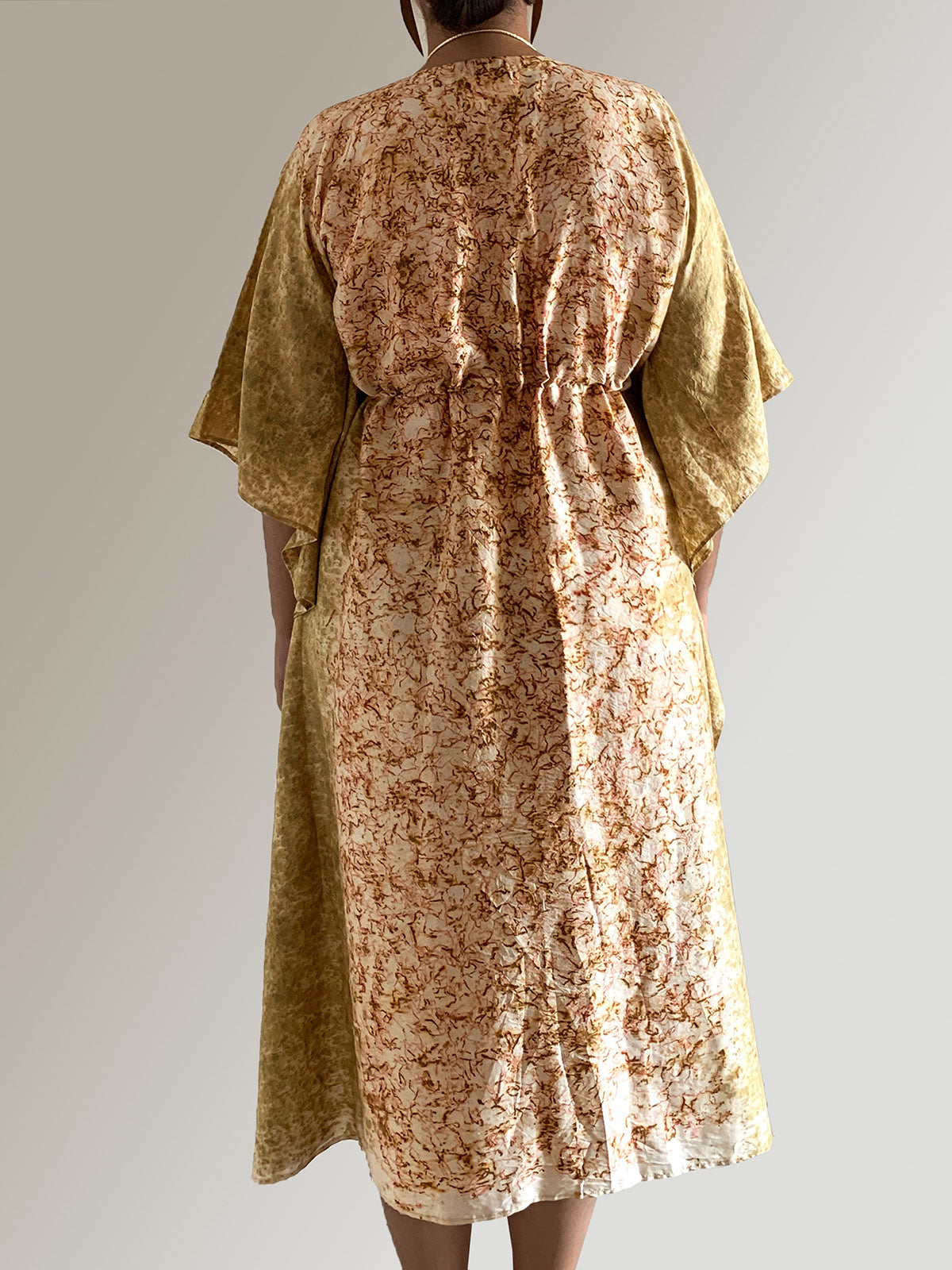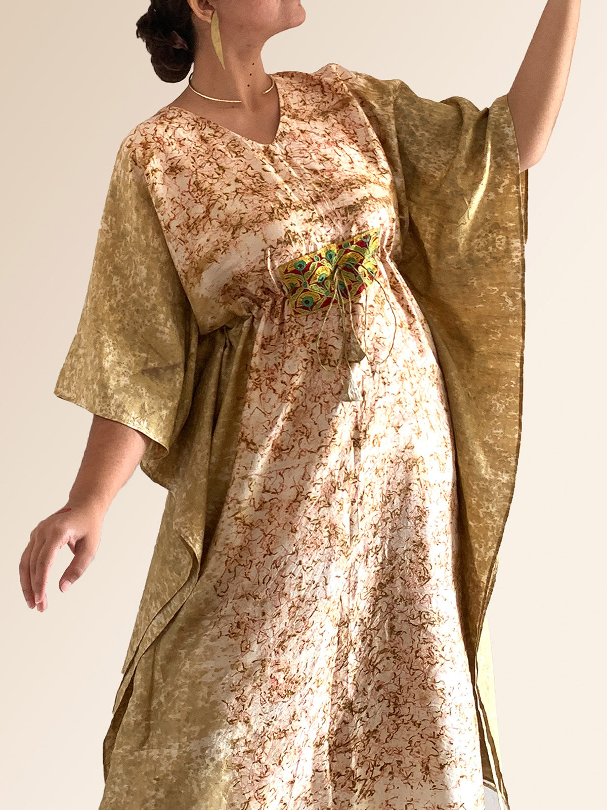 Introducing the "Bageecha" Cocktail dress, crafted from authentic Katan fabric. Adorned with marigold and harda dyes sourced from local temples, promoting environmental sustainability. The Kutchi mirror patch in yellow and green adds elegance, blending tradition with fashion. Immerse yourself in luxury with this Katan silk masterpiece, reflecting rich heritage and eco-consciousness. Indulge in its mesmerizing allure, where traditional craftsmanship meets contemporary elegance, offering a sustainable fashion statement.