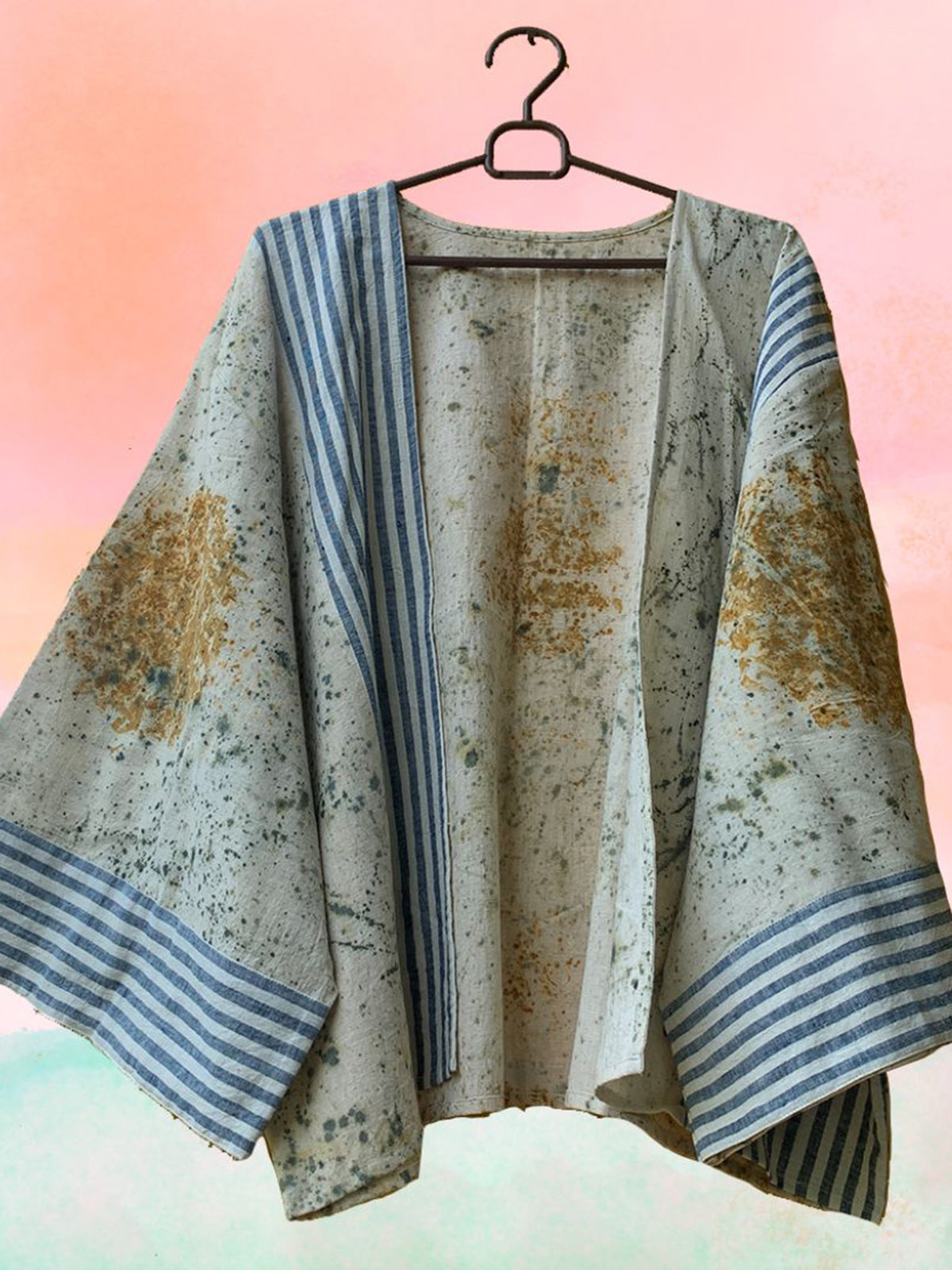 Experience the serenity of nature’s blooms with the handcrafted Ecoprinted Handwoven Breezy Jacket in off-white. Adorned with vibrant hues, this jacket drapes elegantly, offering unmatched comfort and tranquility. Meticulously designed and skillfully crafted, each piece effortlessly complements any outfit. Versatile and stylish, it pairs beautifully with pants, skirts, or jumpsuits, adding a touch of merriment and vitality to your ensemble. Embrace the calming beauty of nature and enhance your wardrobe with this sophisticated Breezy Jacket.