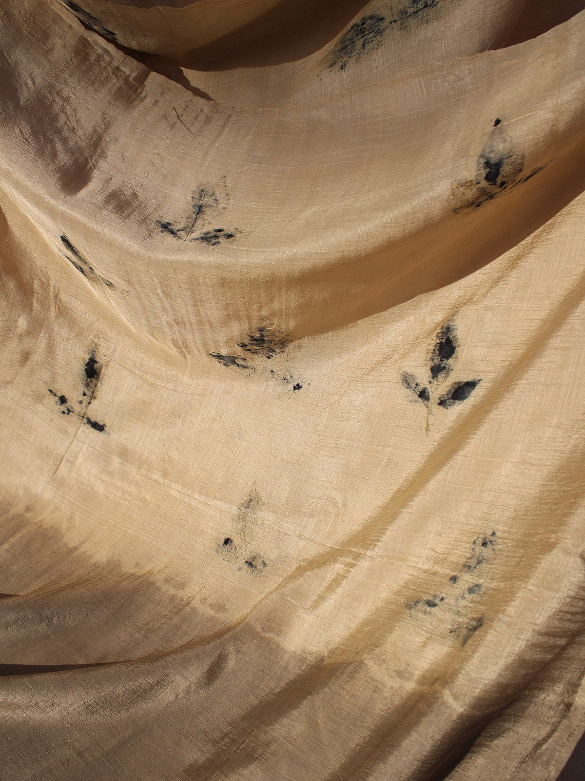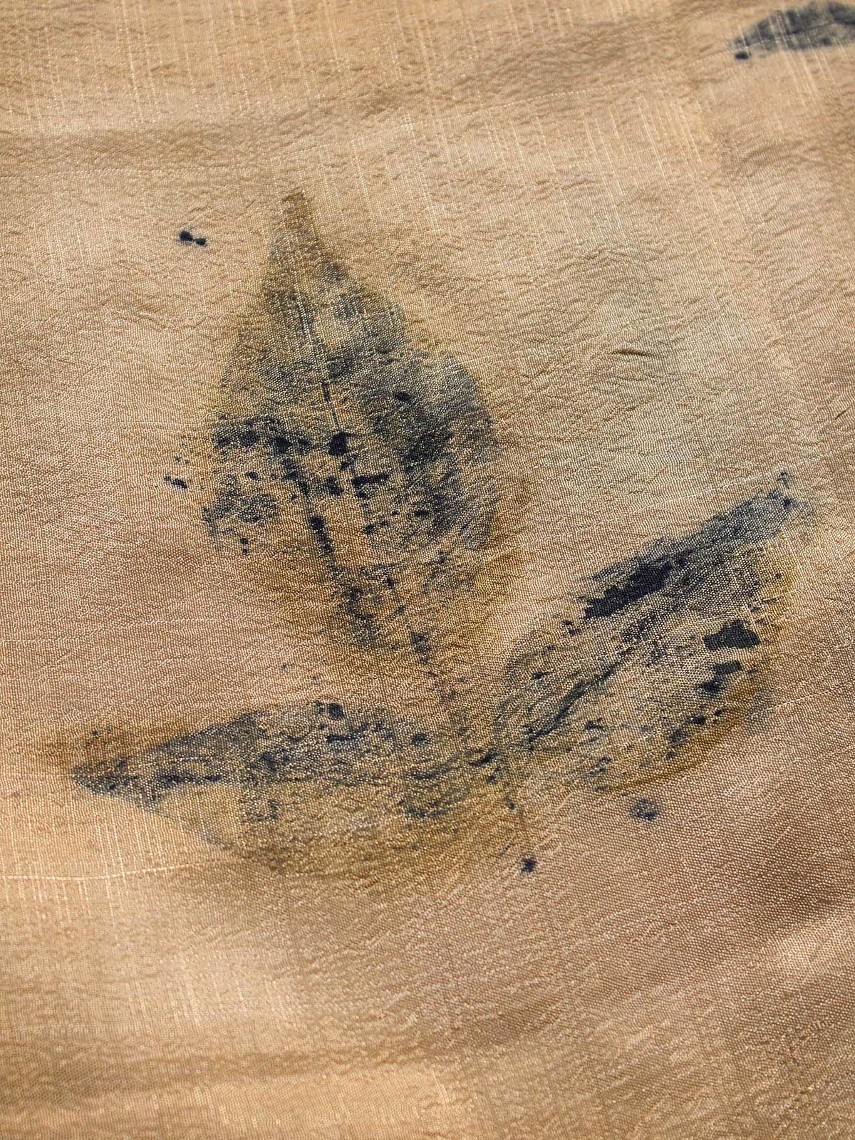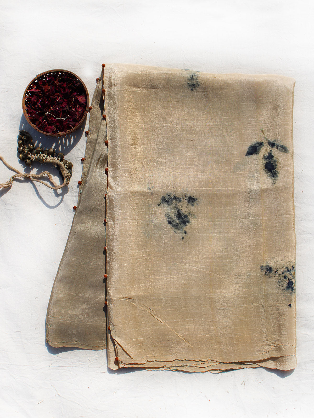 Introducing the "Shambhu" Silk Banana Saree: Where Sacred Elegance Meets Sustainable Luxury. Embrace nature's essence and tradition with this one-of-a-kind masterpiece woven with sacred motifs and eco-conscious practices. Handcrafted from luxurious banana silk by master weavers in Bihar, it drapes effortlessly, caressing your skin with its natural golden sheen. Perfect for sacred gatherings or temple visits, it exudes an aura of spiritual grace and grounded elegance, adorned with natural bell patra and indigo dyes, walnut accents, and beautiful rudraksha beads on the palla.