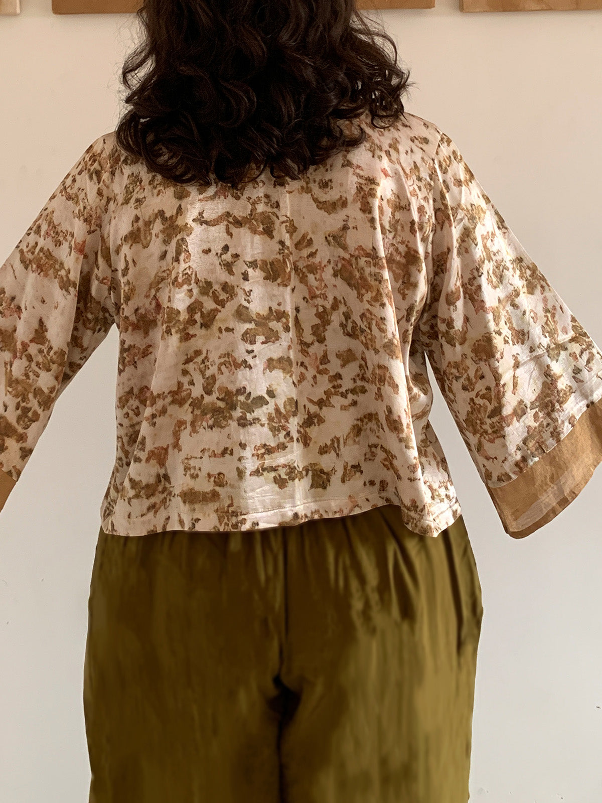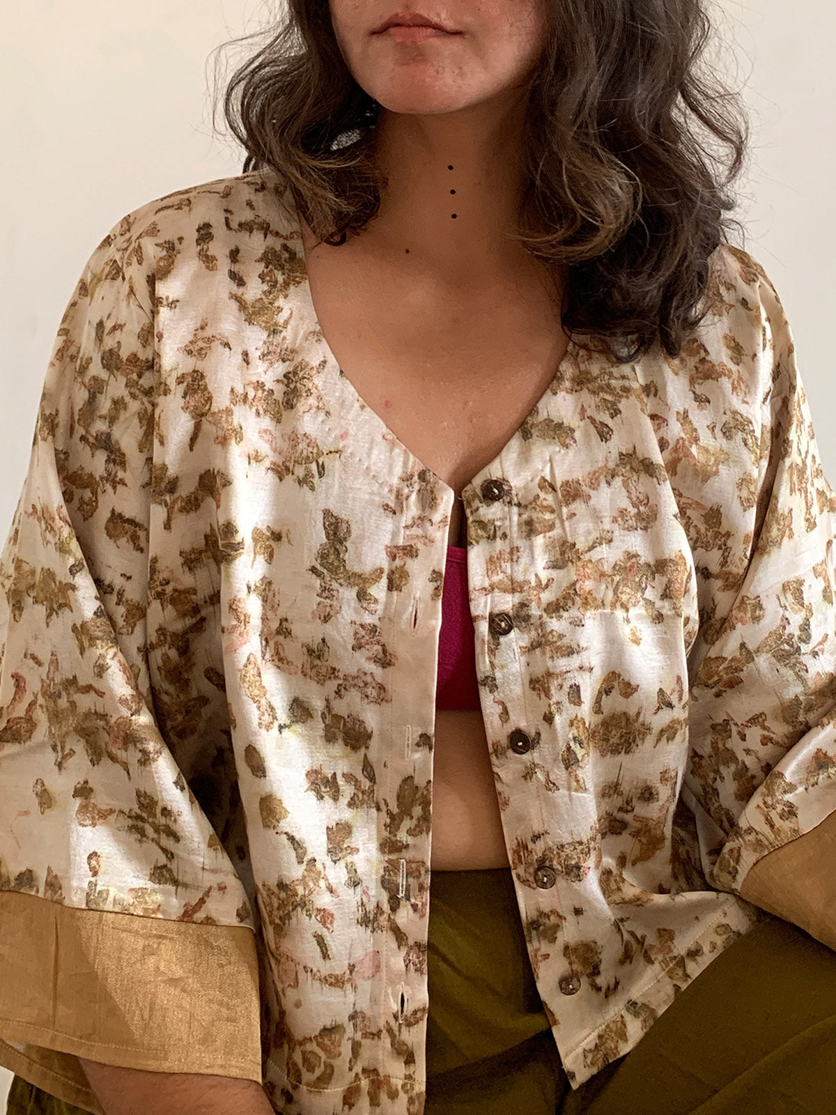 Introducing "Haraa Gulab," a handcrafted marvel – a V-neckline button-down crop shirt blending tradition with sustainability. Crafted from exquisite mashru fabric skillfully woven by artisans of Patan, it seamlessly merges heritage with contemporary fashion. Dedicated artisans use roses from local temples to dye the fabric, resulting in a unique and eco-friendly masterpiece. Embrace cultural richness and environmental consciousness embodied in every thread of this exceptional crop shirt, offering a graceful silhouette and versatile styling options for any wardrobe.