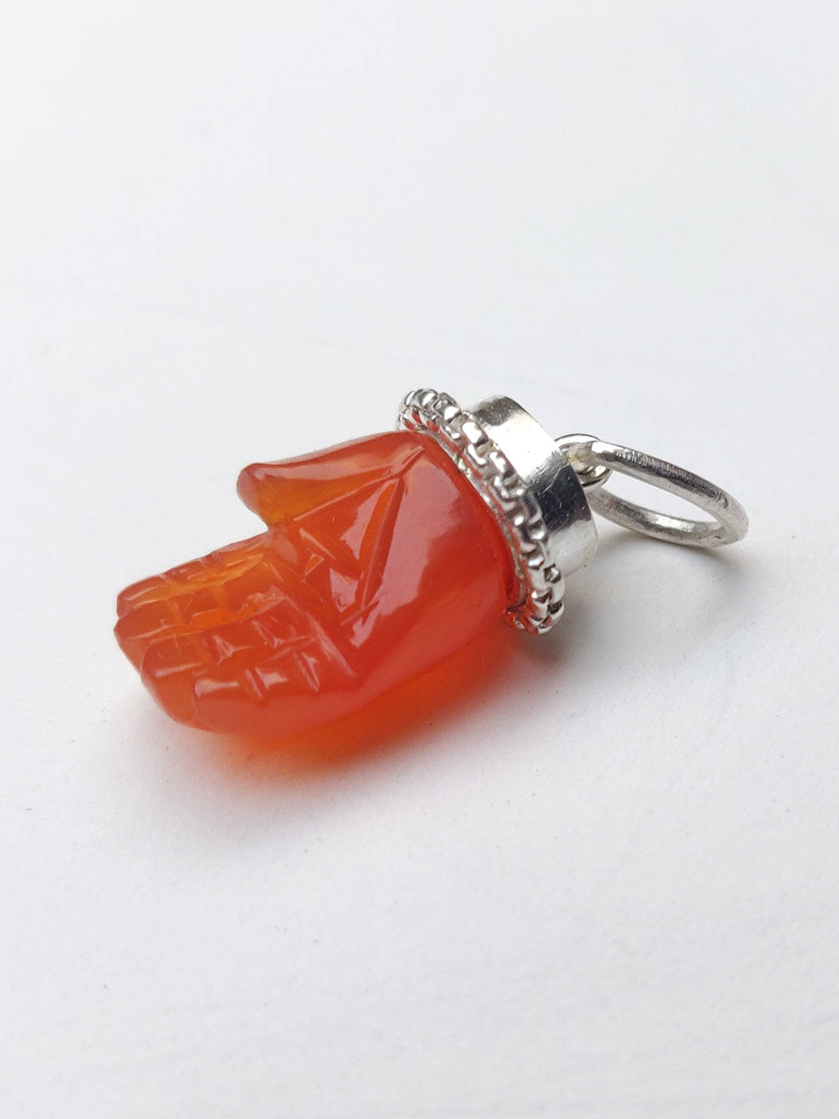 This stunning pendant is inspired by Pichwai paintings. It features a miniature carnelian hand set in silver. Sold without the chain.