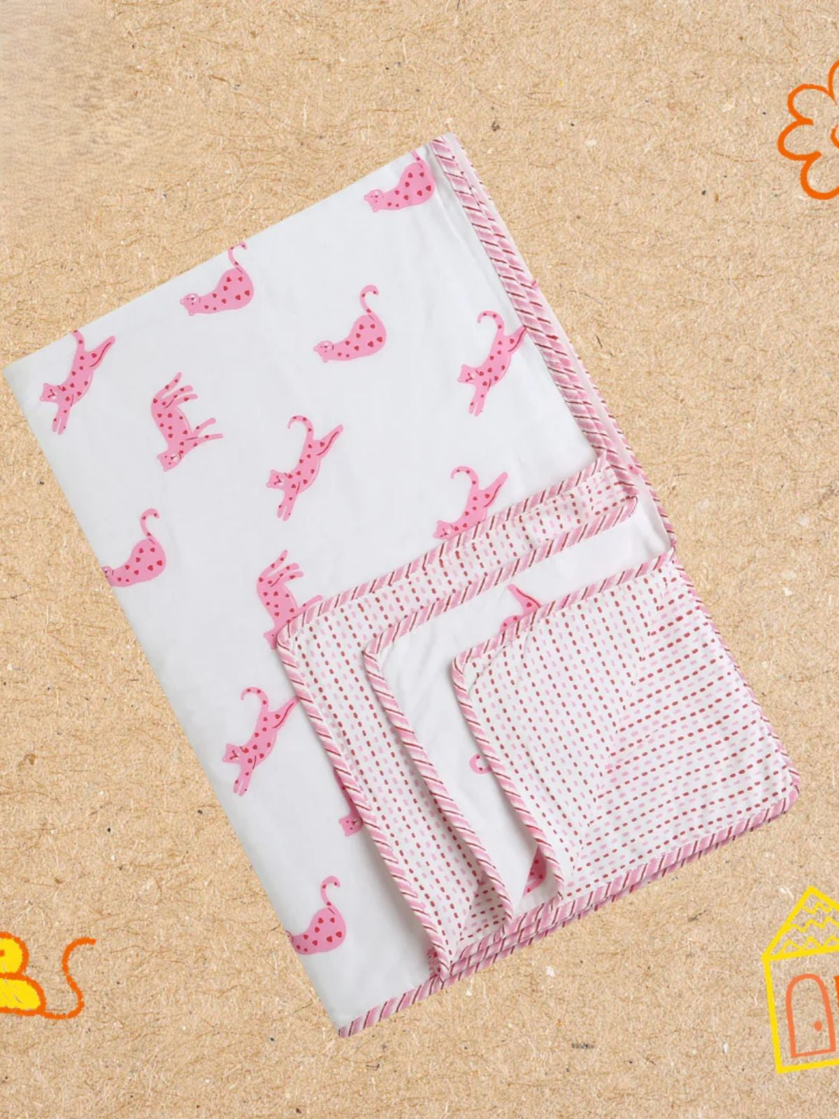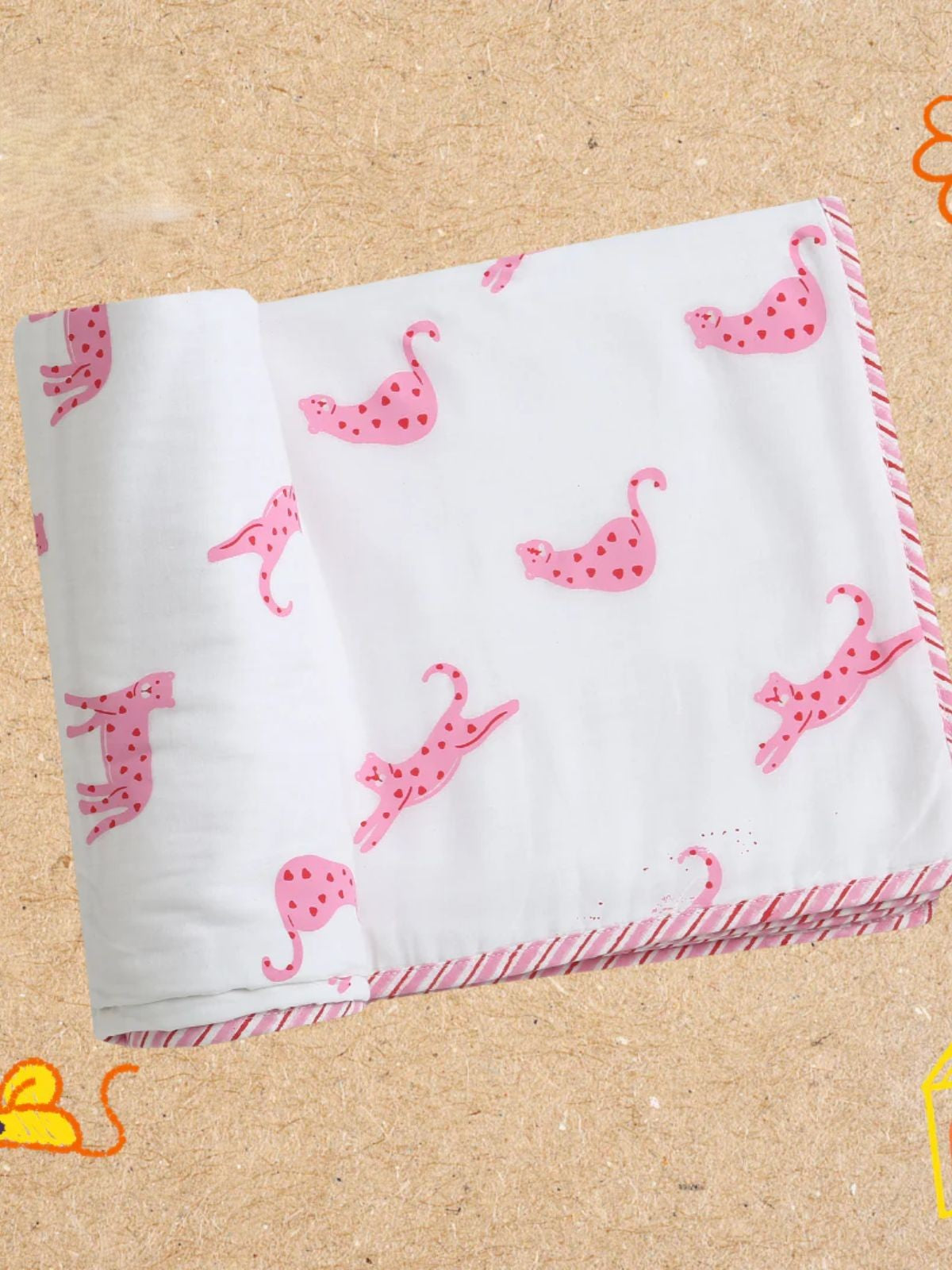 Envelop your child in premium comfort with our Pink Panther reversible cotton blanket. Crafted from 100% Malabar cotton, this hand-printed design features a striking leopard print on both sides, offering versatility and style. The 5ft x 3ft dimensions provide ample coverage for children aged 6 months to 8 years. Dyed with chemical-free, non-toxic formulations, it's gentle on sensitive skin while remaining breathable and soft. Each piece showcases unique artistry through hand-block and screen-printing techniques, ensuring no two blankets are identical.