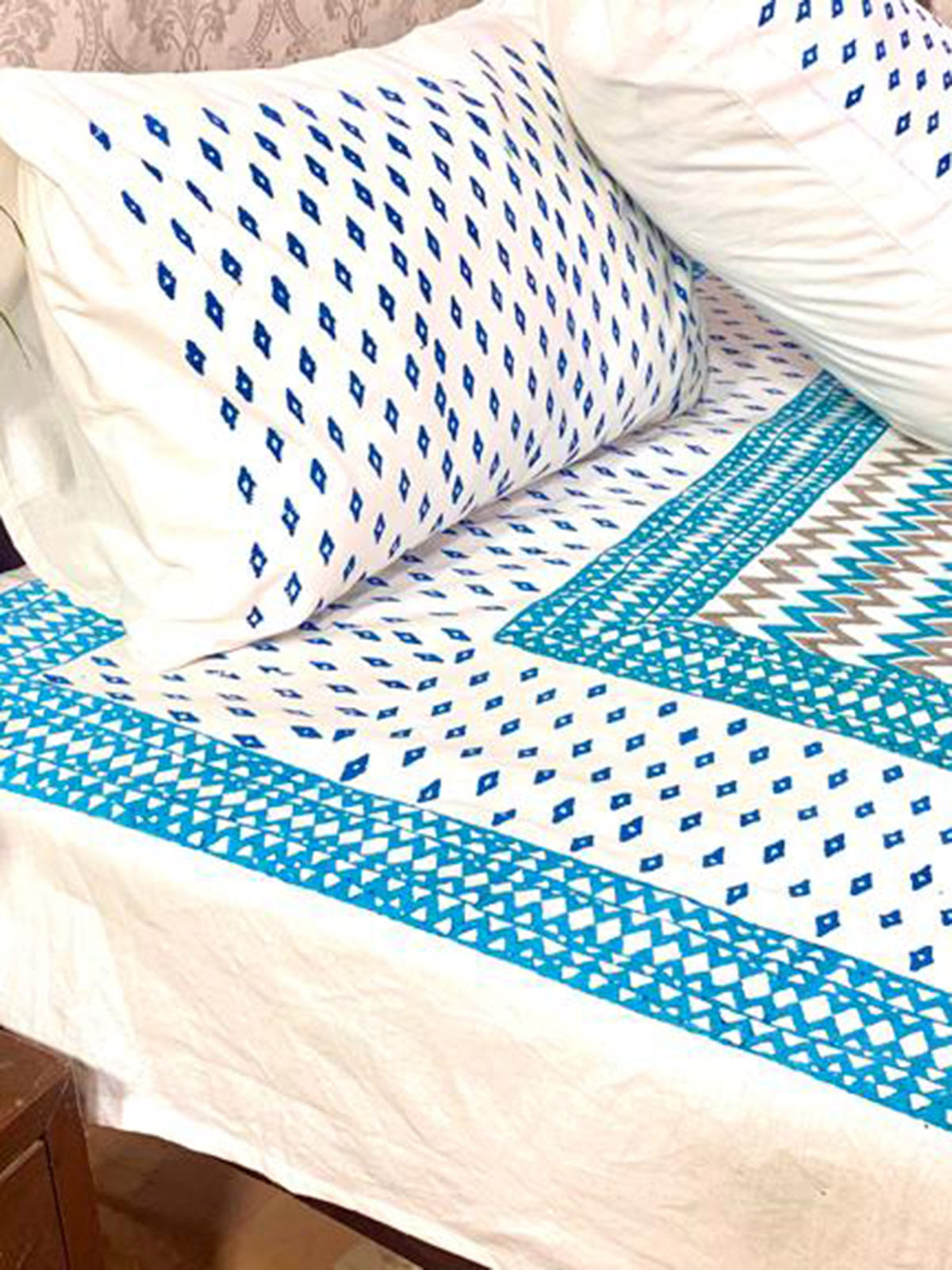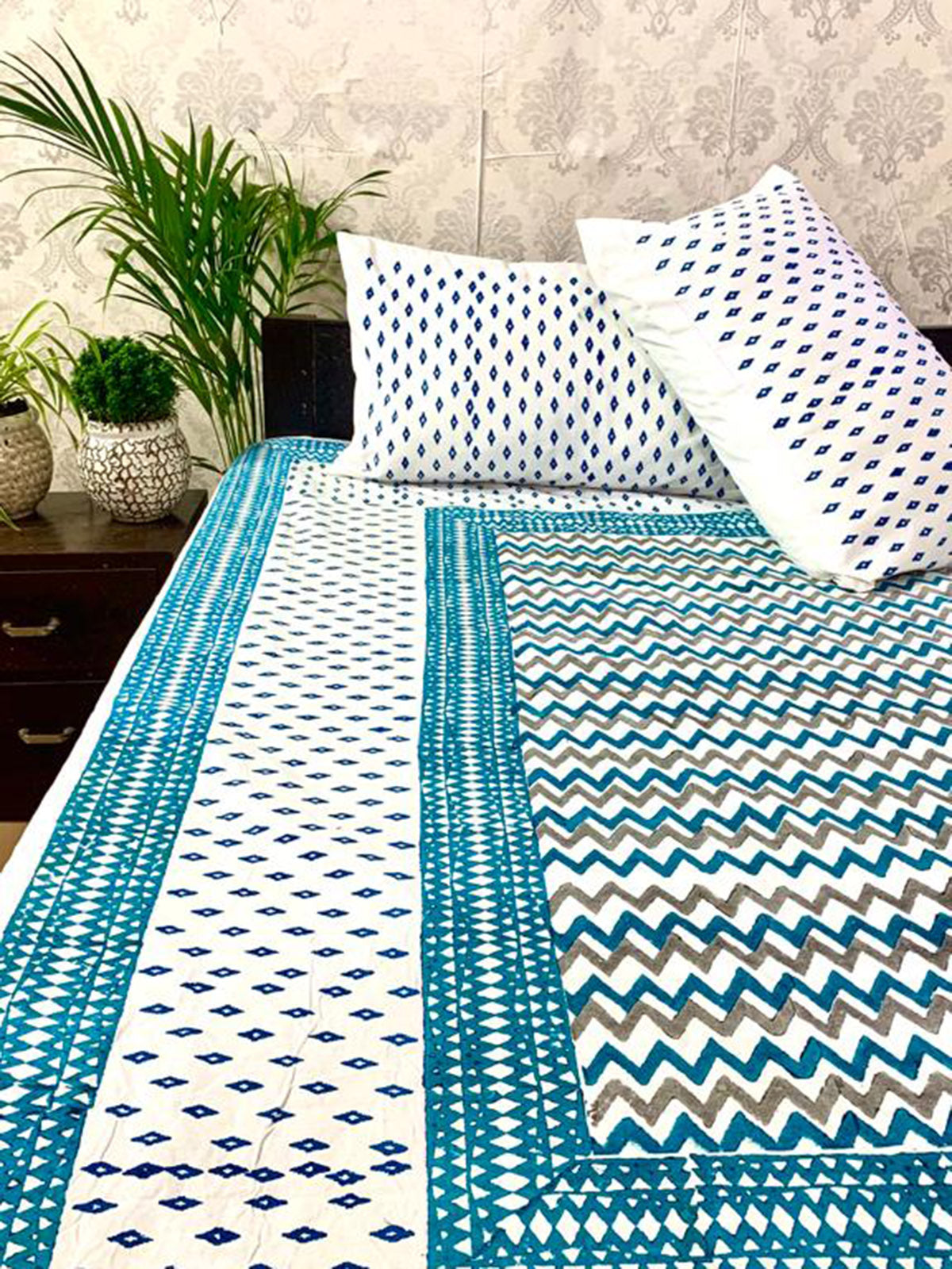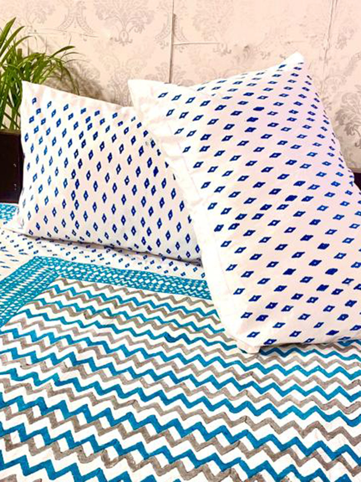 Blue Chevron Design Hand Block Printed Double Bedsheet