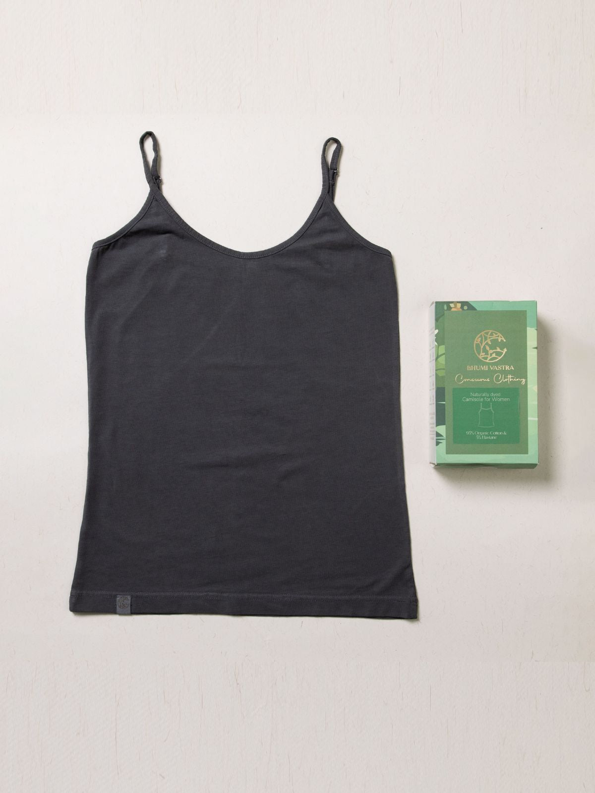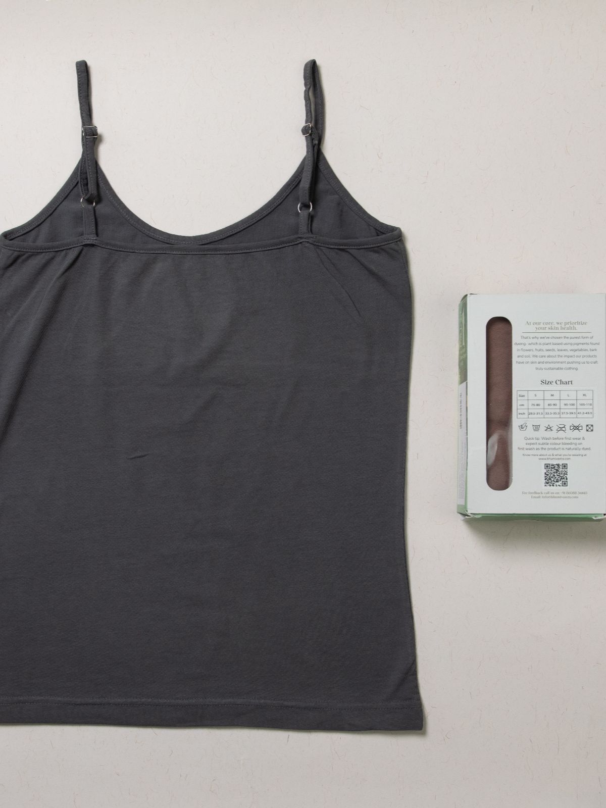 This plant-dyed, adjustable strap camisole in iron grey combines softness and stretch for all-day comfort. Made from super-combed organic cotton with elastane, it’s lightweight, breathable, and naturally anti-microbial. Perfect for sleepwear, casual wear, or layering, it provides a snug, chemical-free fit while bringing conscious, eco-friendly style to your wardrobe.