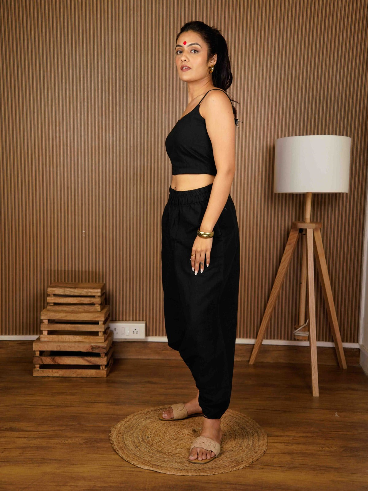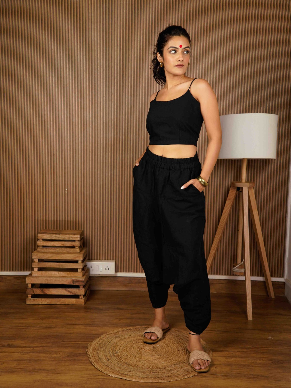 Meet your new go-to essentials: the Bani Pants are black full-length drop crotch pants for women, designed with an easy, relaxed fit and functional pockets. Featuring an elasticated bottom hemfor added comfort and shape, these pants are perfect for daily wear, lounging, or styling up for a casual day out. Simple, versatile, and effortlessly cool.
