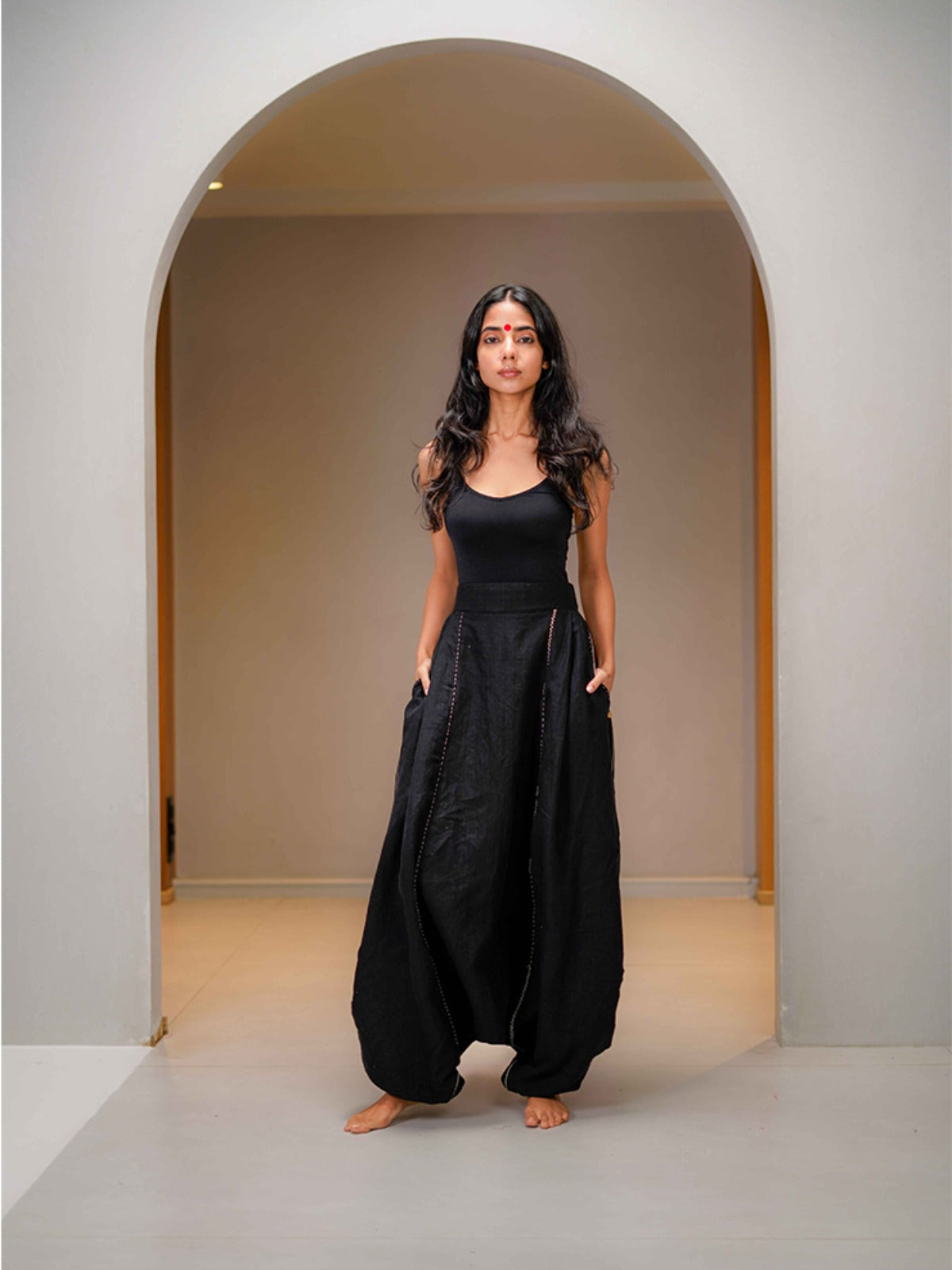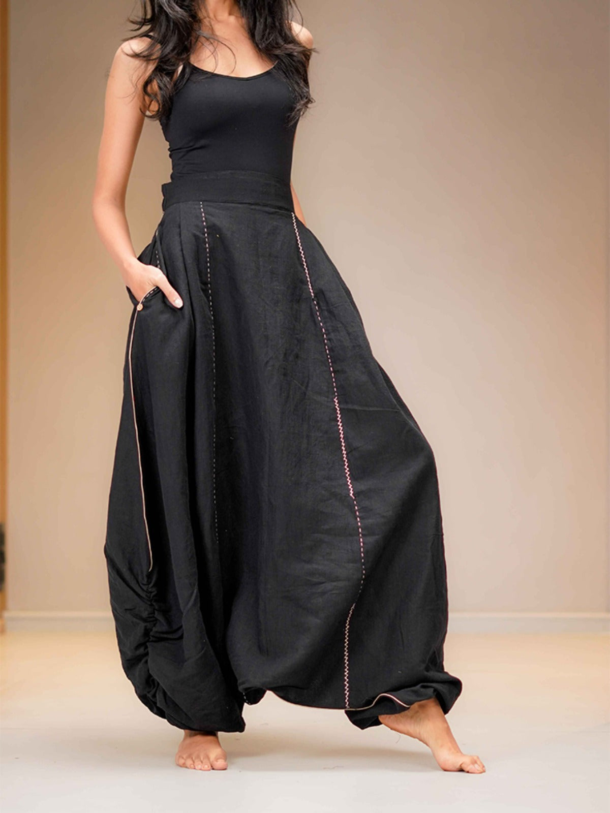 Elevate your everyday style with our 100% Natural Cotton Black Harem Pants. Designed for comfort and breathability, these pants feature an elasticated bottom outseam for a snug fit and functional inseam pockets for added convenience. Perfectly blending fashion with functionality, they are ideal for a relaxed day out or a cozy evening in, making them a versatile and chic addition to your wardrobe.