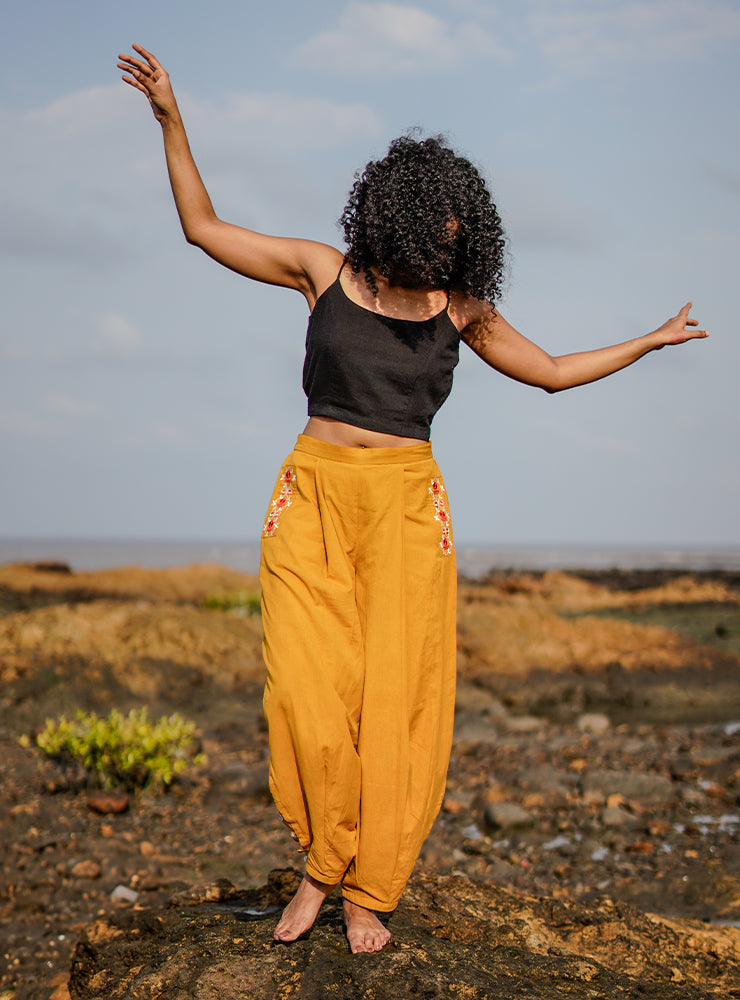 Slip into effortless ease with our Yellow Dart Pants, crafted in soft, breathable South cotton. Designed with a relaxed fit and tapered bottom, these lightweight pants offer all-day comfort without compromising on style. Thoughtful details like handy pockets, subtle side buttons on the hem, and our signature bindi embroidery add a unique touch. Whether you're on a laid-back getaway or heading to a day event, these versatile pants are your perfect travel companion.