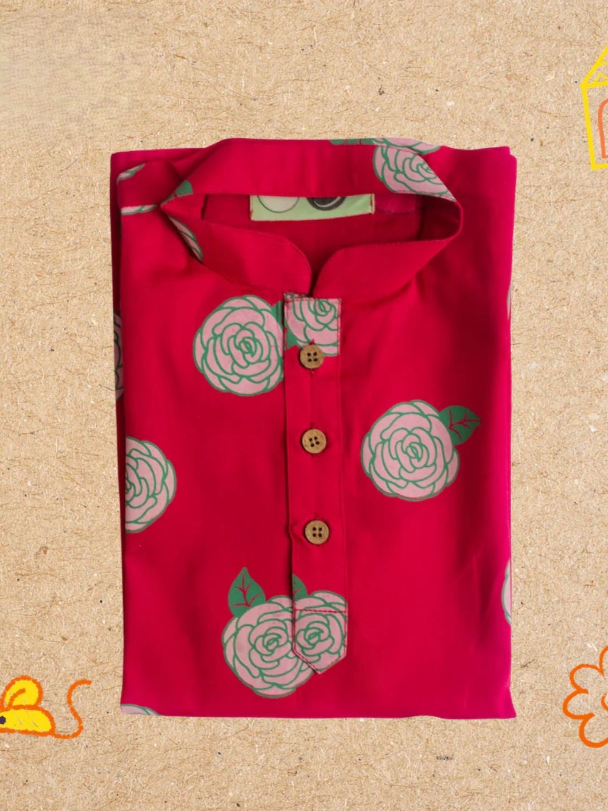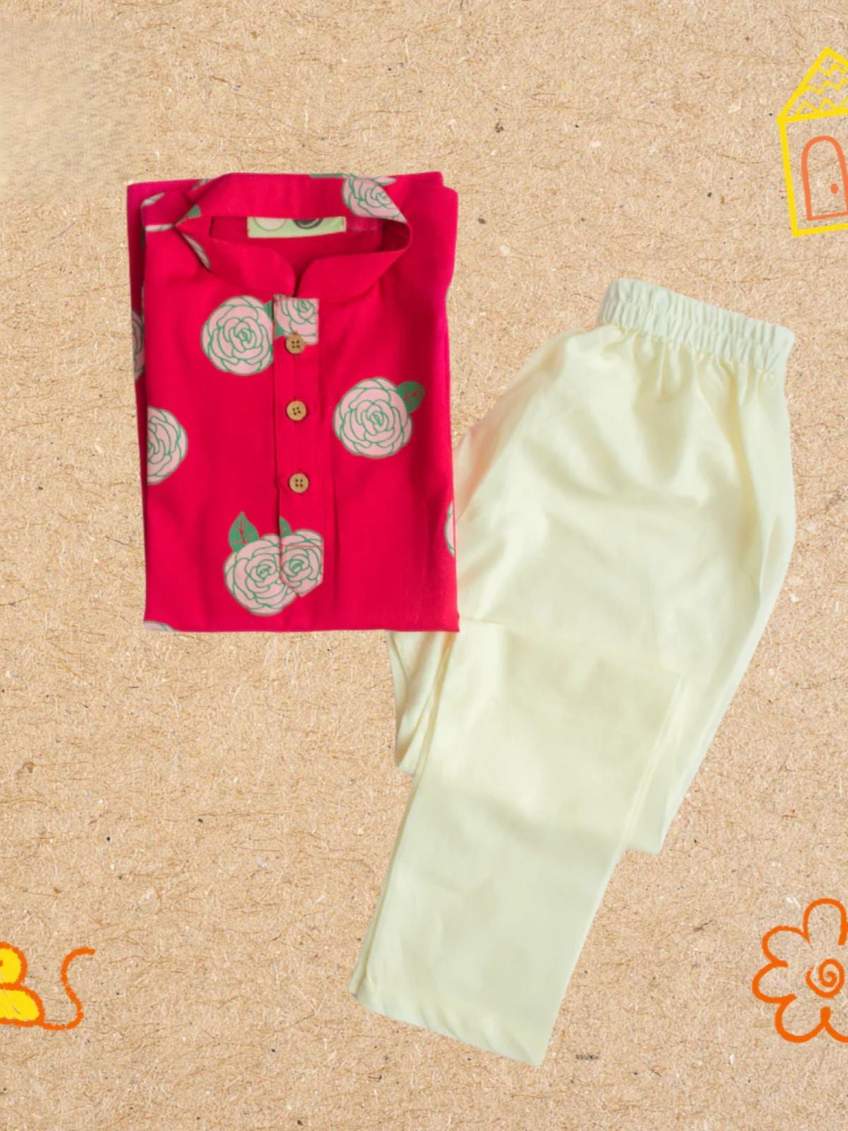 Introduce your child to comfort and style with the Rose Print Kurta Pajama Set from our Wildflower Collection. Crafted from 100% luxury cotton, this thoughtfully designed ensemble features a kurta-style top with easy-open buttons paired with soft, elastic-waist beige pajamas. The adaptive design eliminates tags and seams while offering accessible necklines for stress-free dressing. Hand screen-printed with chemical-free dyes, each piece showcases exclusive patterns that celebrate individuality. Available for ages 1-8 years, this versatile set transitions seamlessly from everyday wear to special occasions.