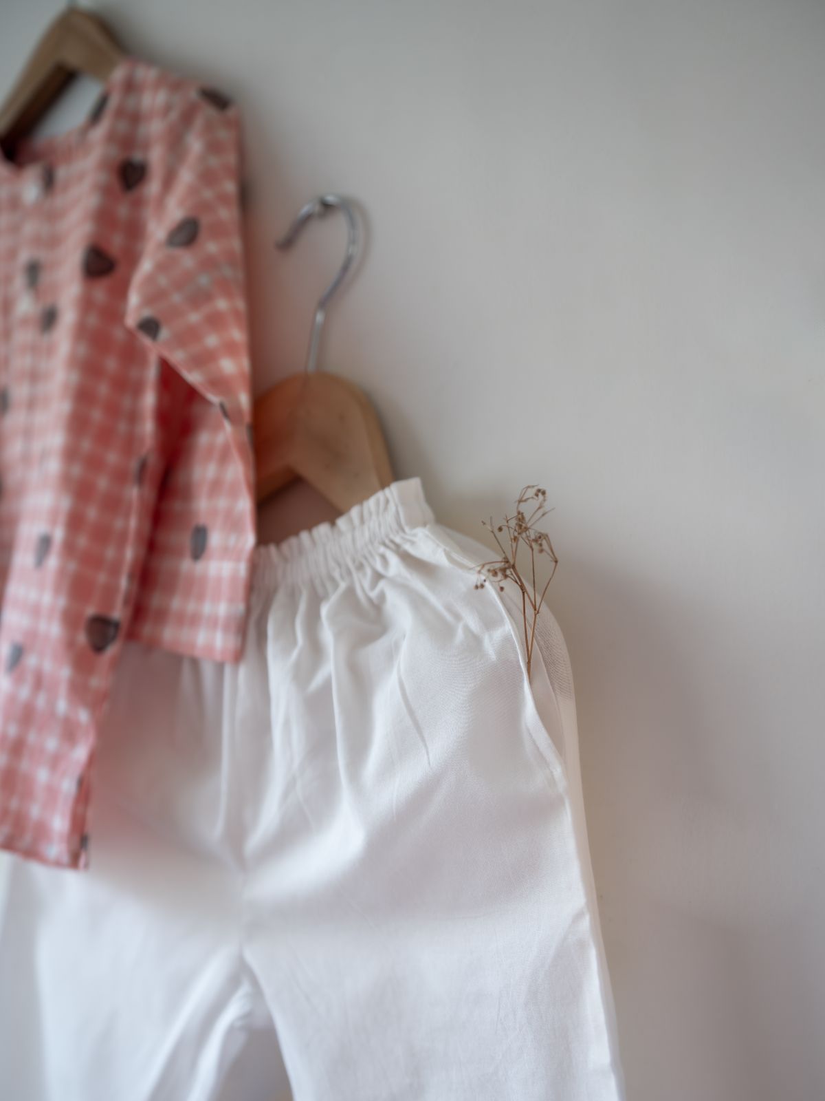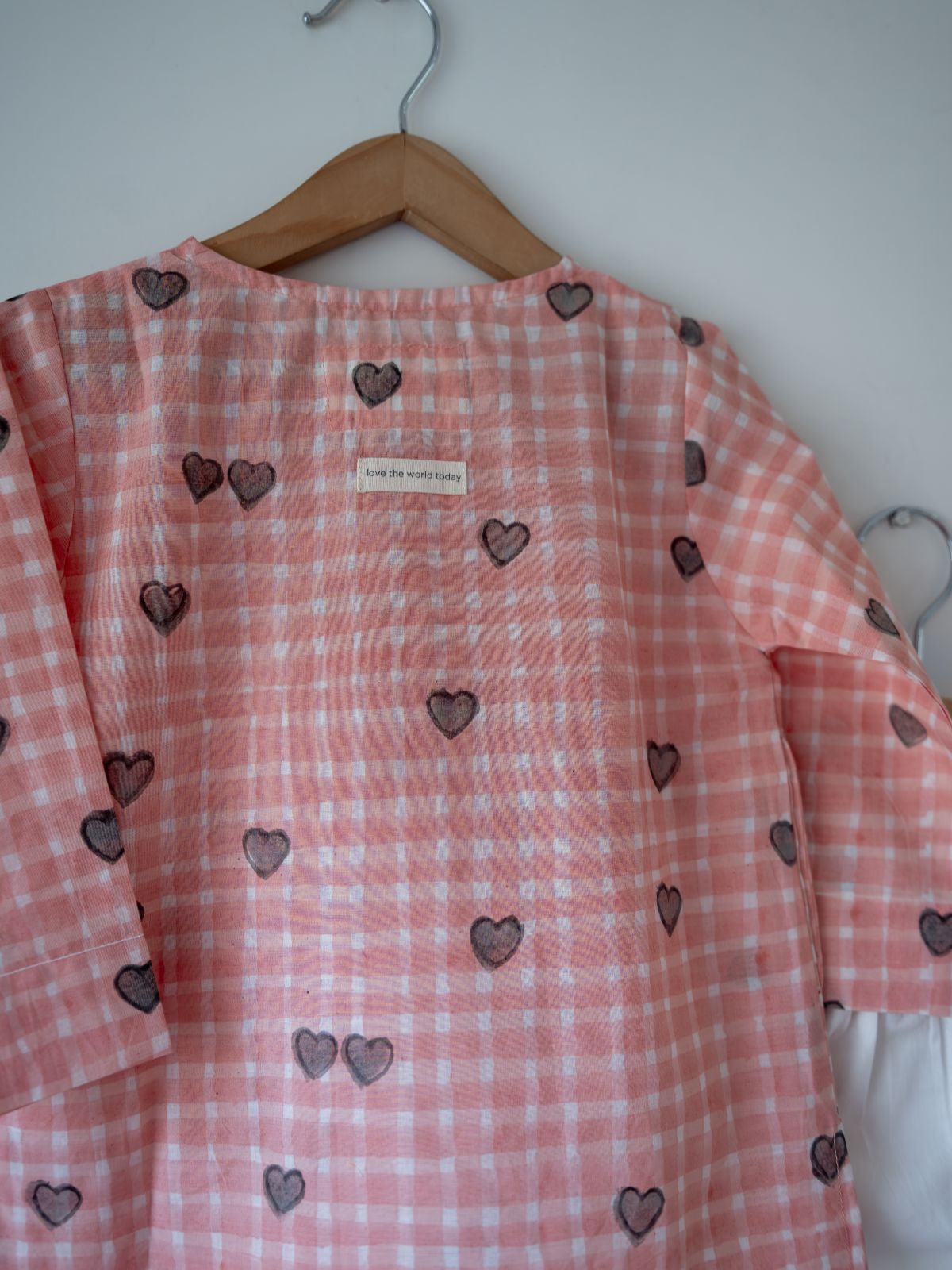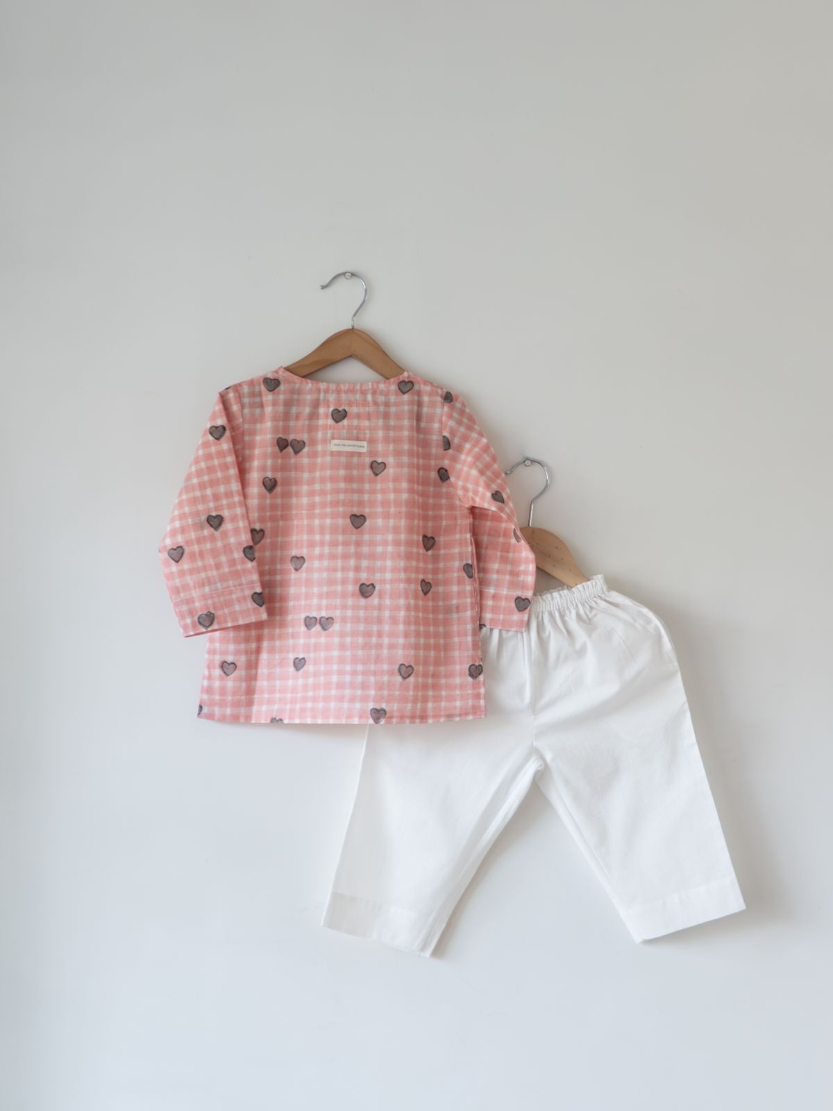 This charming kurta pajama set captures the essence of cherished moments with loved ones. Featuring a hand block printed cotton kurta adorned with a warm Peach Baked with Love Waffles Check pattern, it pairs beautifully with GOTS certified organic cotton pajamas. The relaxed fit ensures unrestricted movement, while natural shell buttons and functional pockets add practical appeal. Designed for versatility—from weekend adventures to cozy family gatherings—this unisex set combines artisanal craftsmanship from Jaipur with everyday comfort. The soft elasticated waistband and breathable fabrics make it an ideal choice for children who value both style and ease.