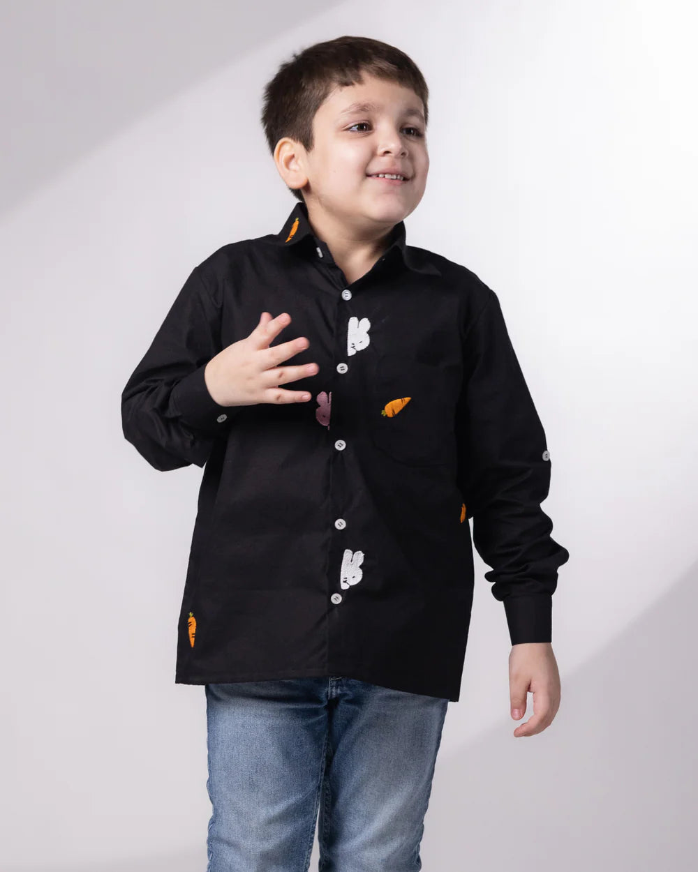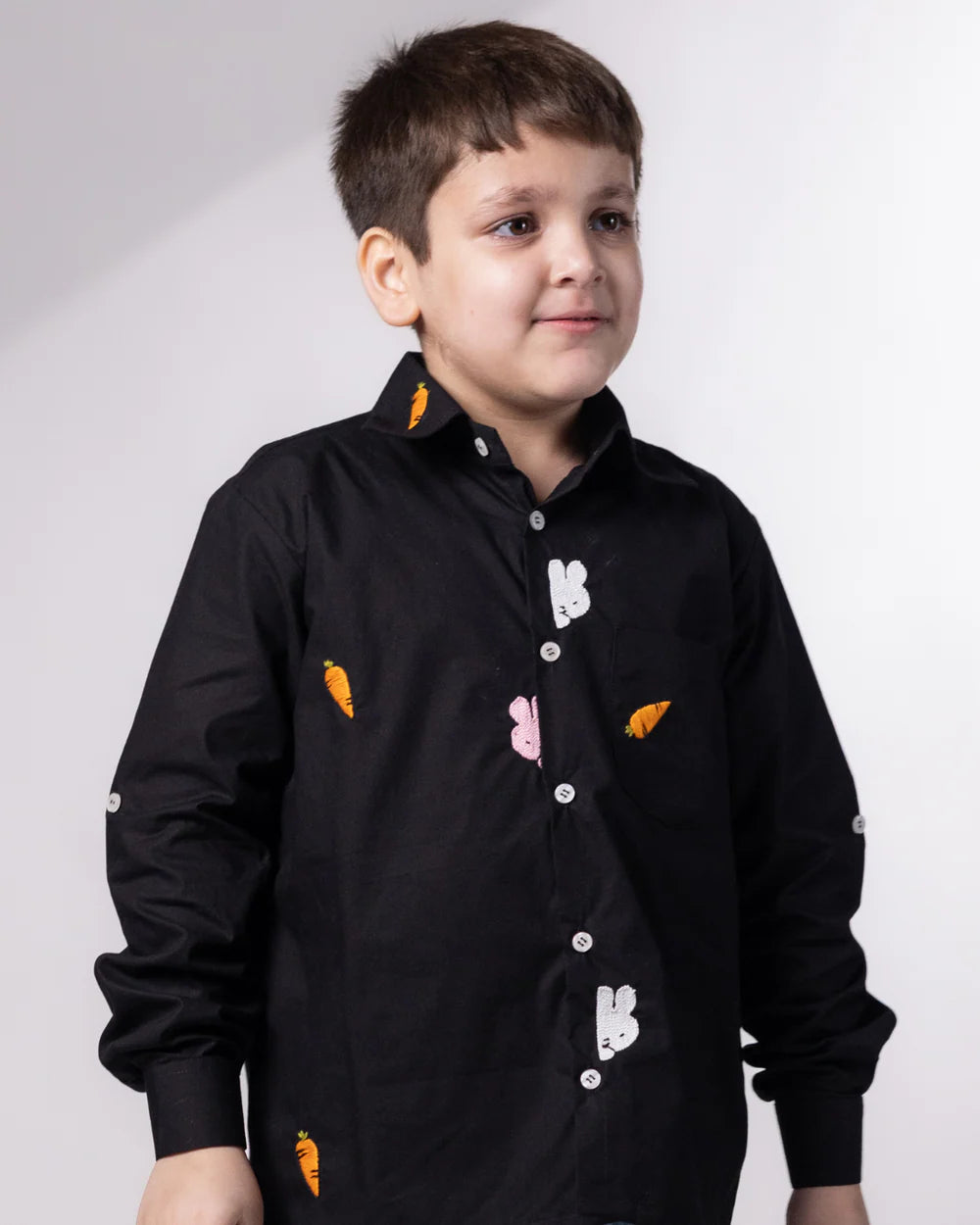 Get ready to hop into cuteness with Kavin! Featuring playful rabbits and carrots, this boy's shirt is perfect for little bunnies. This quirky and playful shirt boasts hand embroidery for a unique touch.Roll up the sleeves for even more fun. (Hop to it!)