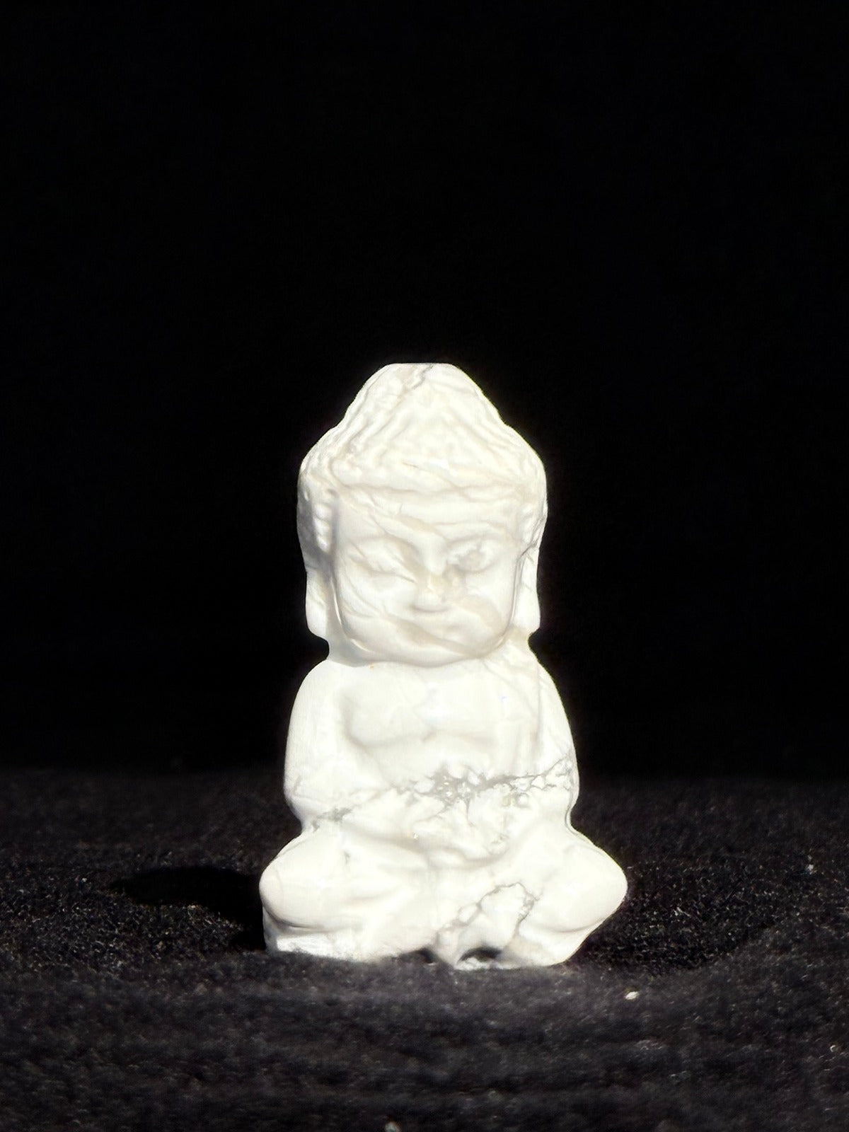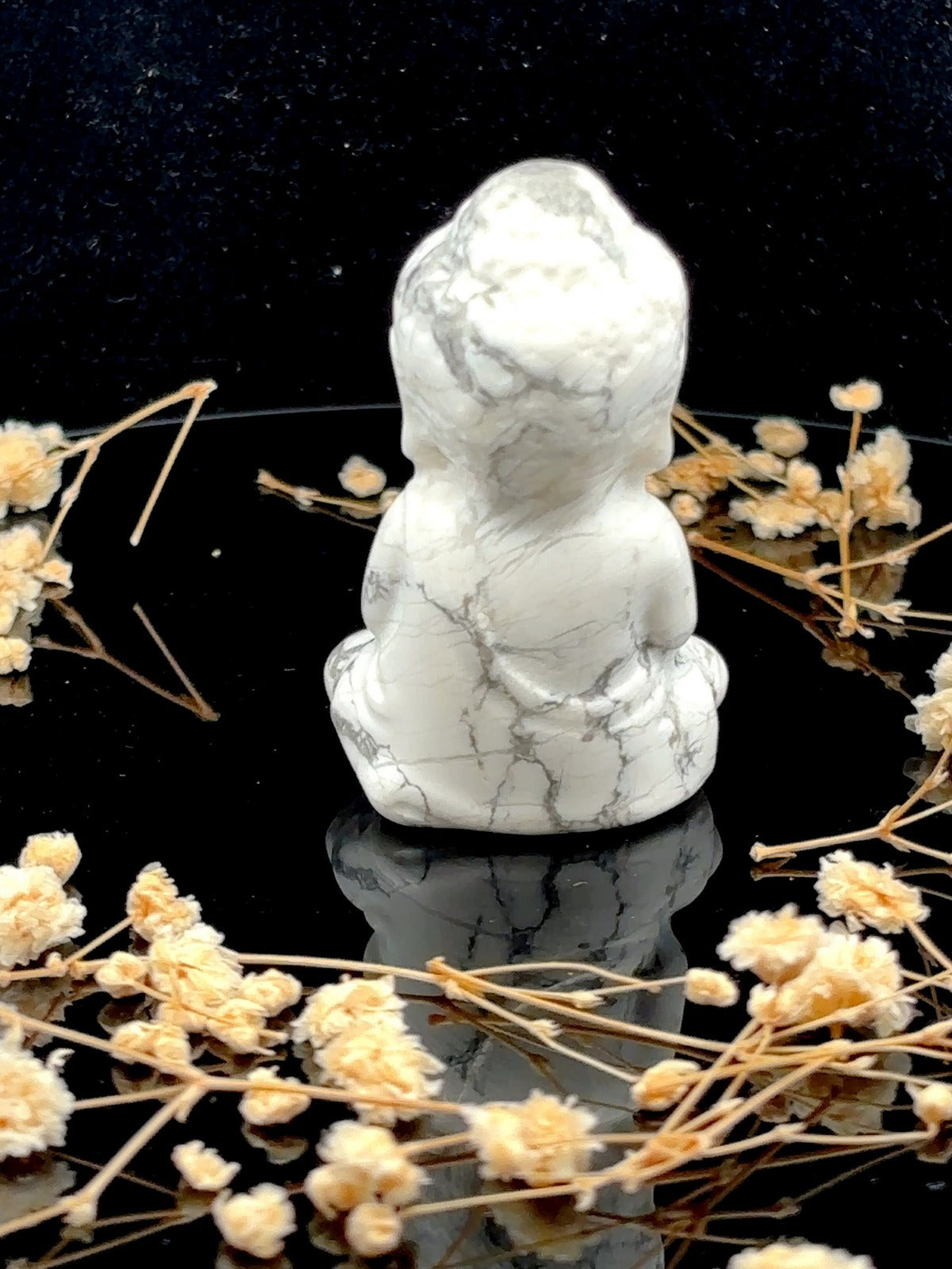 Carved from soft-veined Howlite, this figure promotes stillness, clarity, and patience. A serene addition to your sacred shelf or yoga studio.